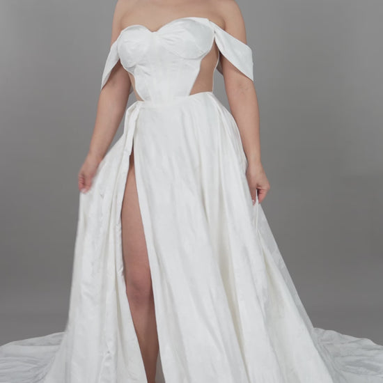 The mid-length train lends the dress a graceful touch, making it ideal for both ceremonies and festive celebrations. The cleverly placed slit creates a striking look while allowing freedom of movement and adding a touch of glamour. Gathering in the skirt adds further interest and brings the dress to life. These delicate details contribute to the overall dynamism of the outfit, ensuring you feel free and confident on your special day.
