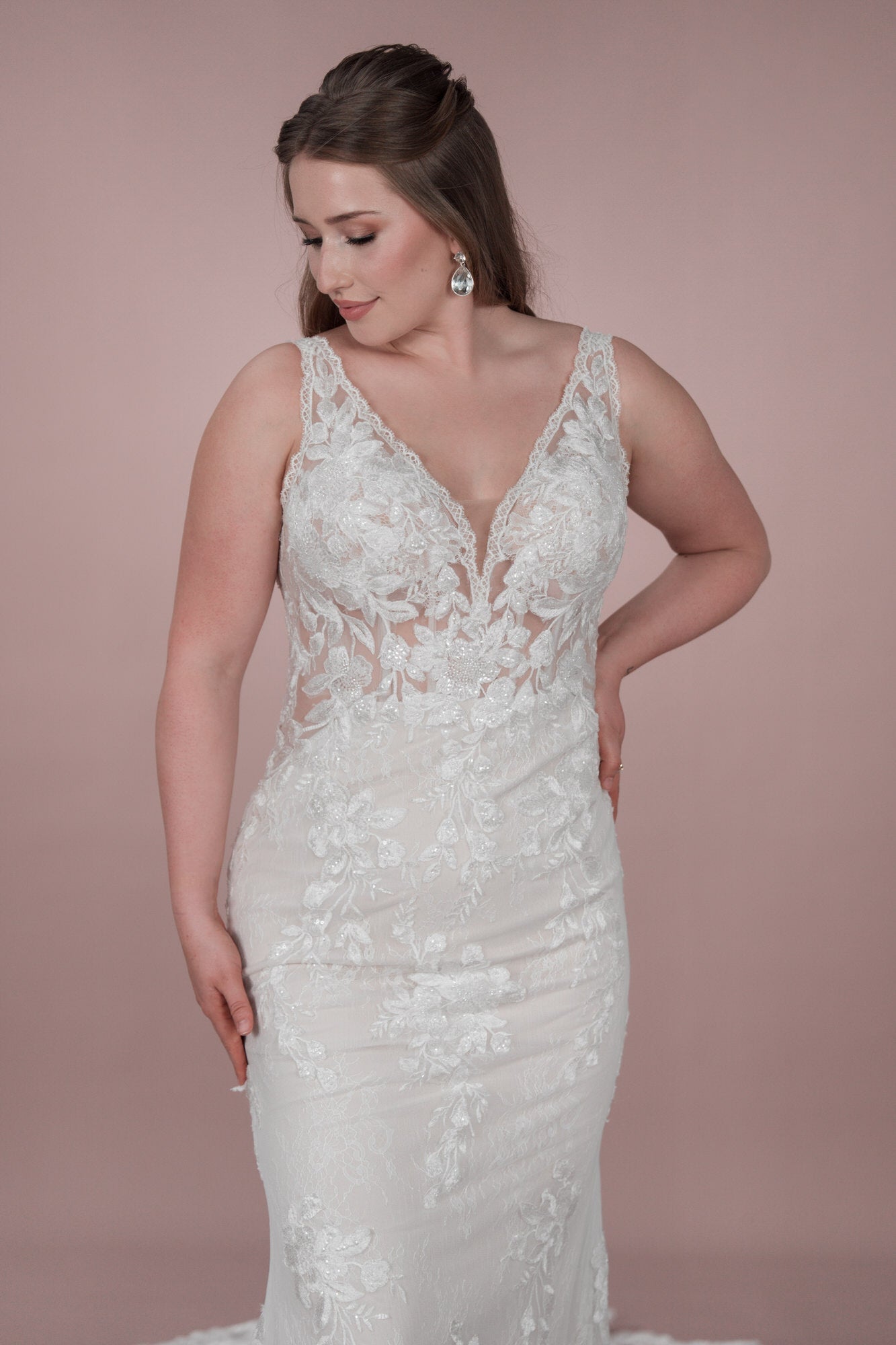 This wedding dress is available with nude or ivory tulle in the bodice and with charmeuse skirt lining in ivory, blush, or light blush.