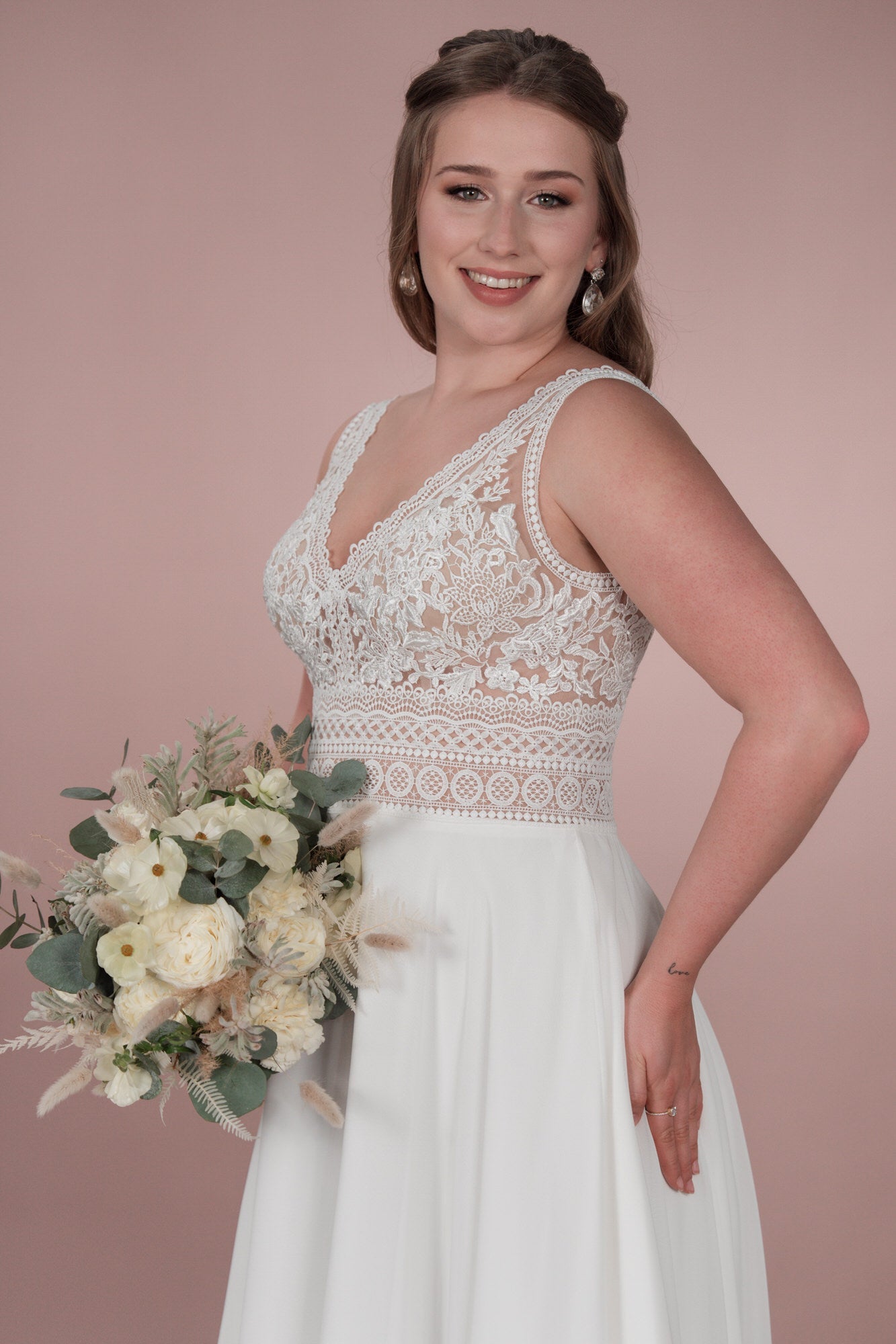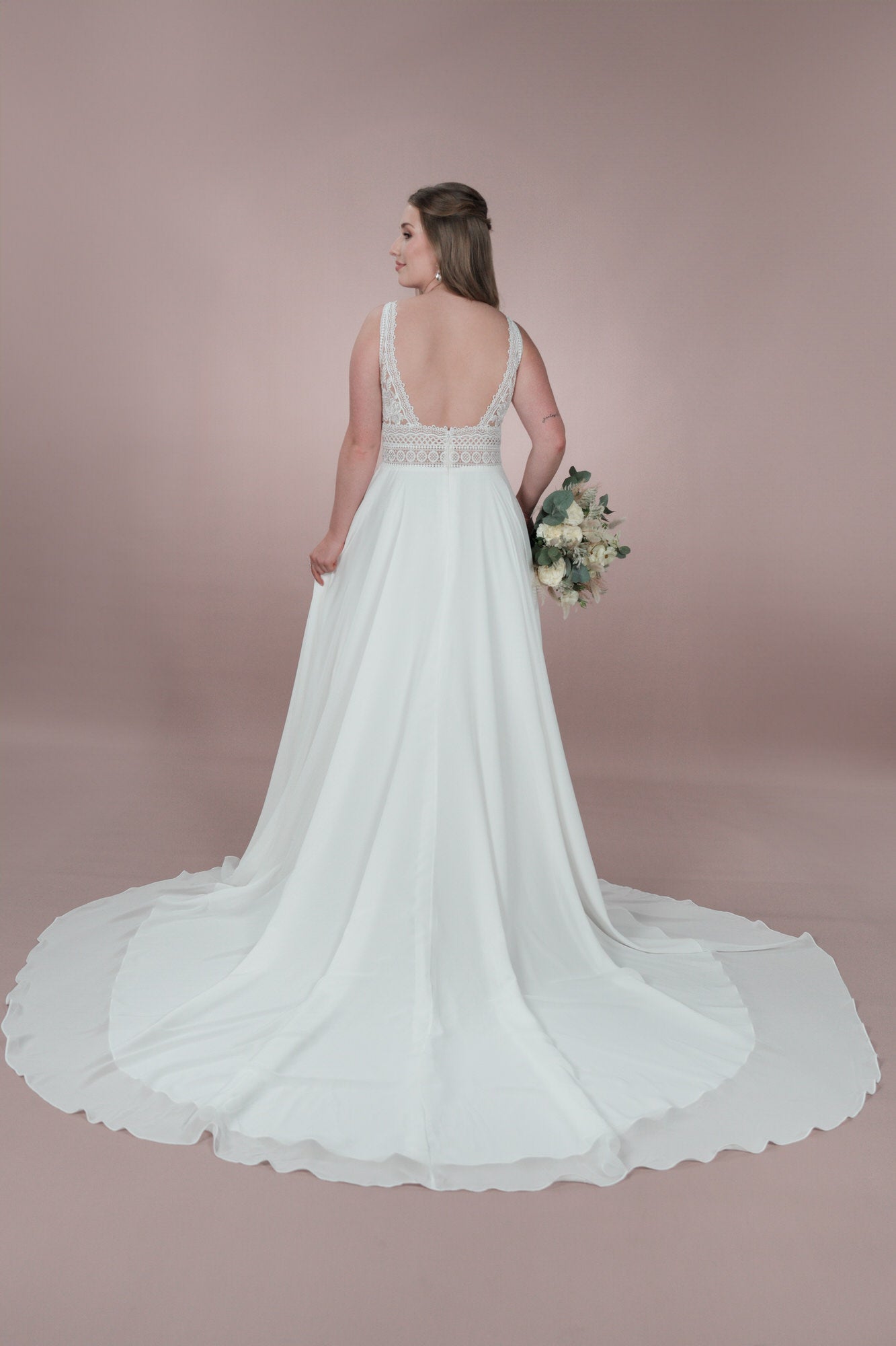 The C23-22 wedding dress from the Classic Collection is the perfect dress for the bride-to-be with a playful sense of romance. The elegant lace, deep V-neck, and flowing chiffon create a classic boho/vintage look. The A-line silhouette flatters every figure and makes the bride shine.
