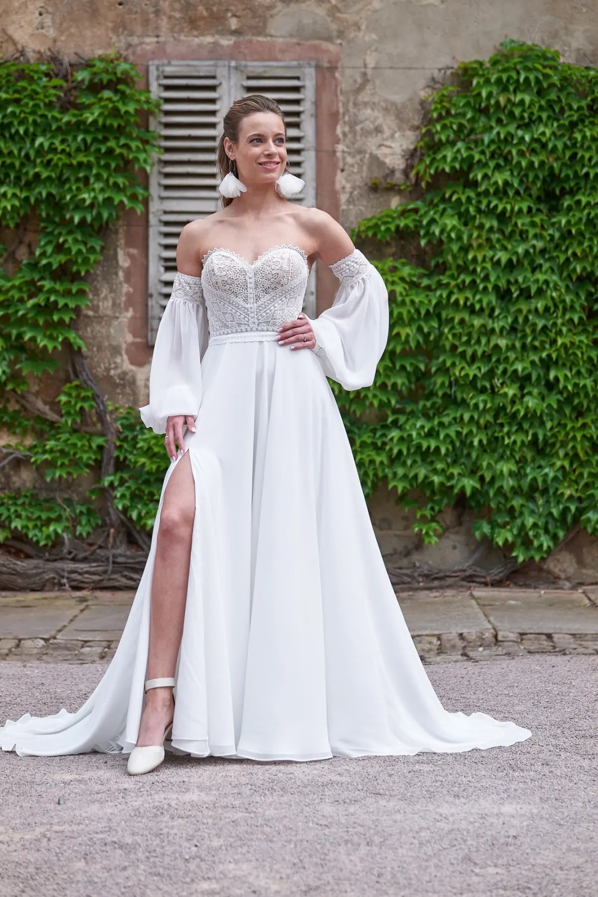 The classic sweetheart neckline accentuates your shoulders and décolletage, highlighting your natural beauty without any glitter or sequins. The unusual geometric lace draws the eye to a heart in the bodice and visually emphasizes your waist. For a perfect fit on your big day, this Bridonista design also features a supportive bodice and push-up cups, ensuring you feel comfortable and confident. The highlight of the look is the feminine chiffon blouson sleeves with elegant lace details. The fine chiffon skirt flatters every figure, providing lightness and maximum comfort. We love the modern leg slit, which breaks up the classic vintage elements and adds a daring touch of sophistication to this dream dress.