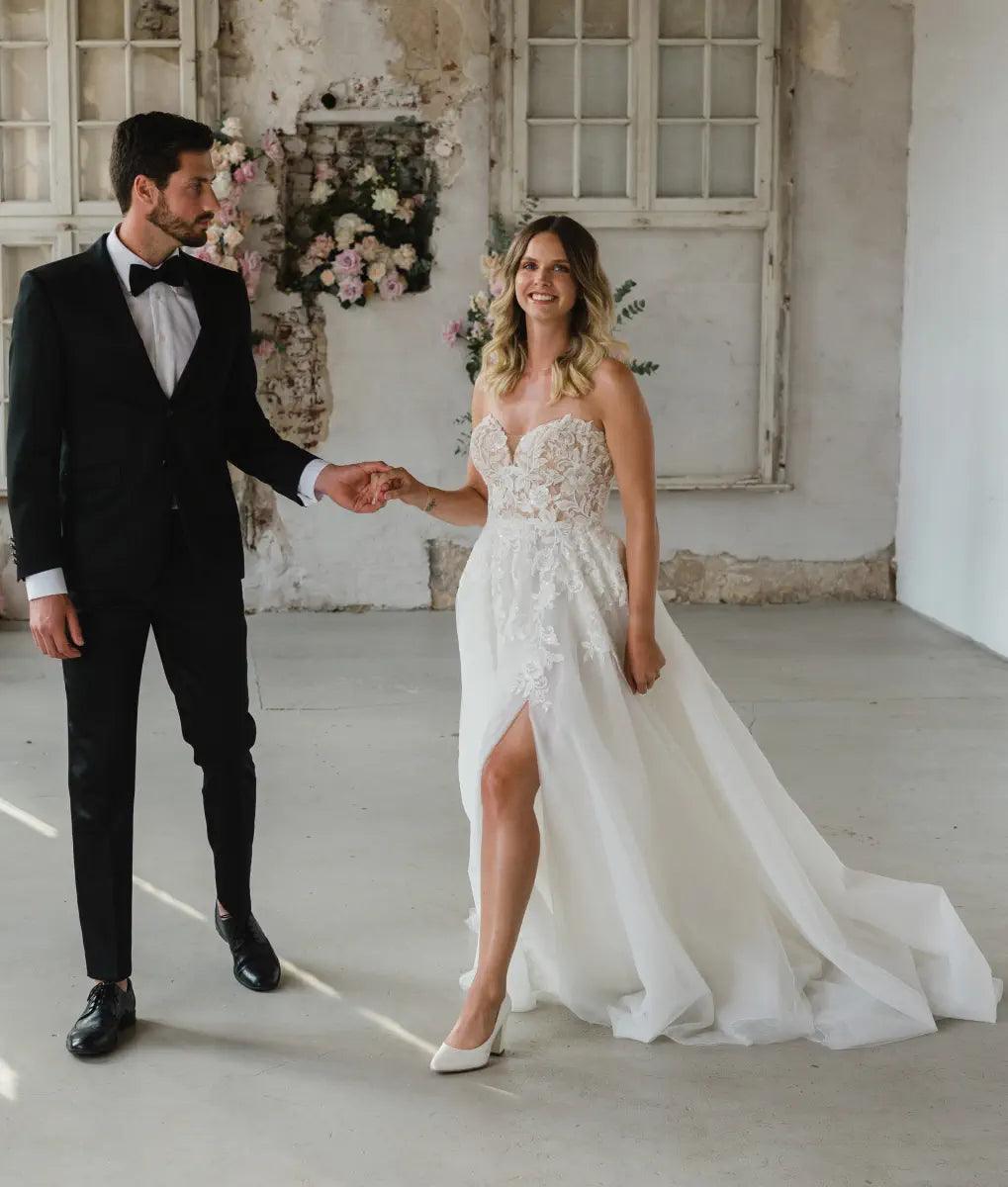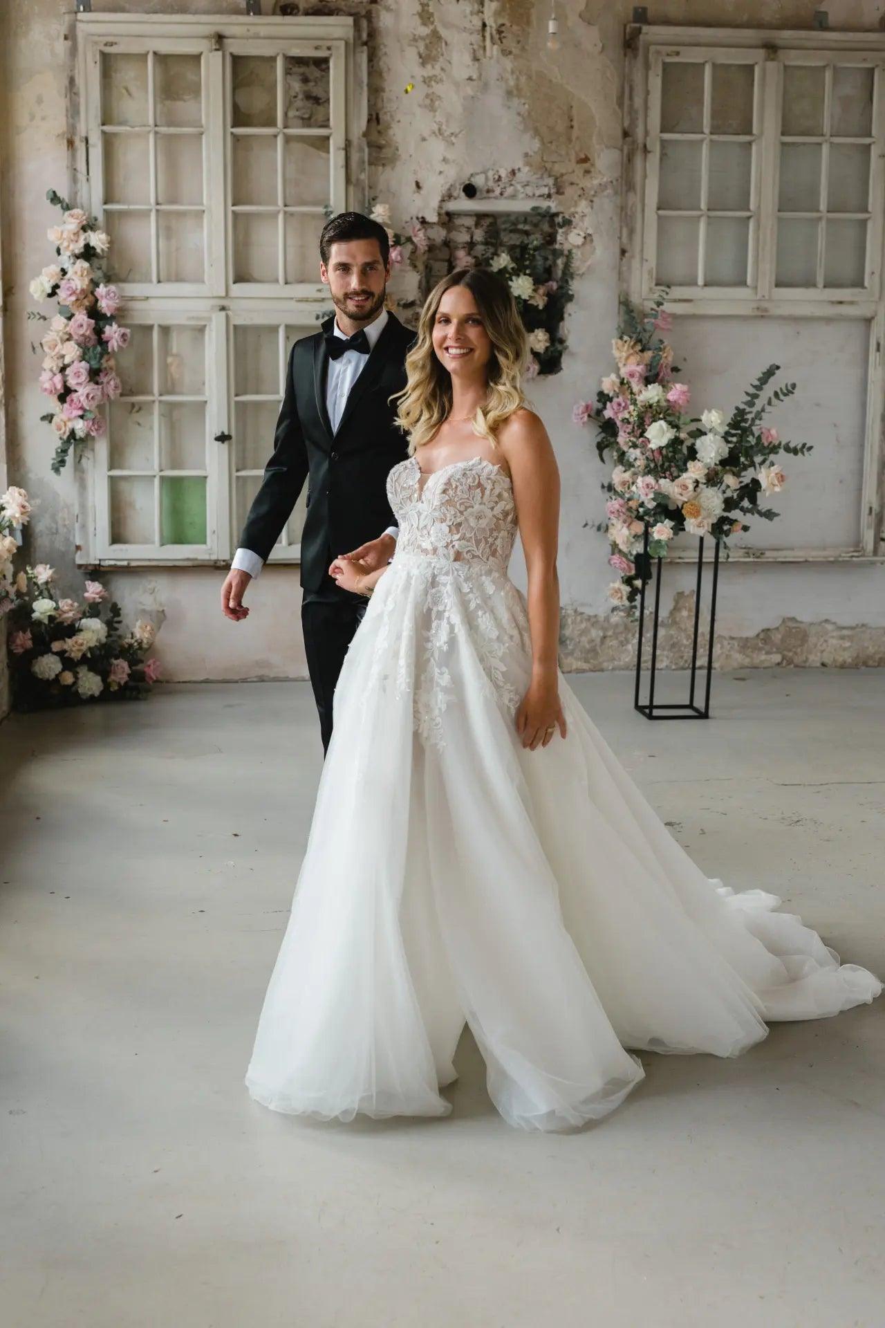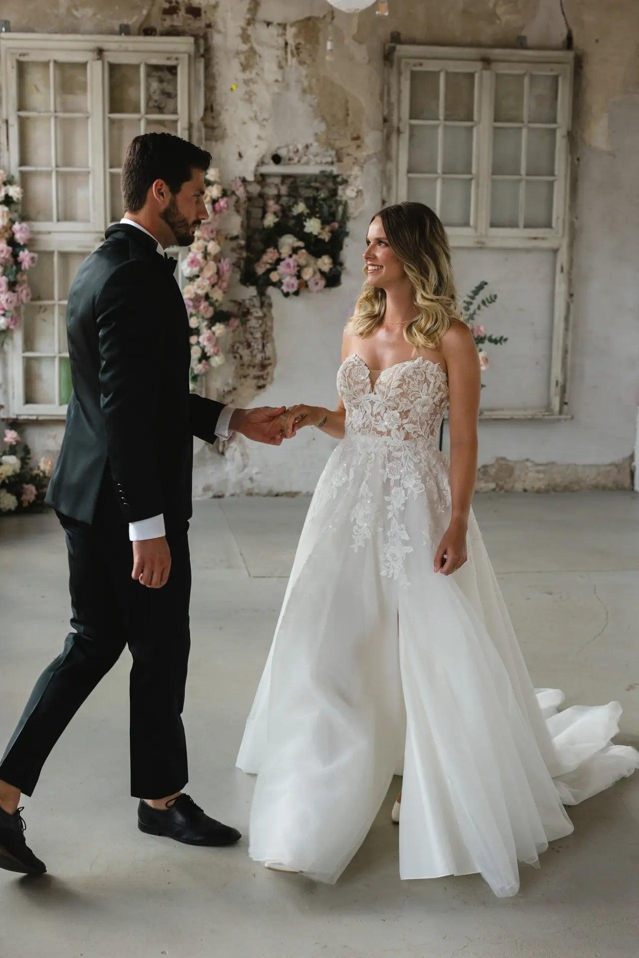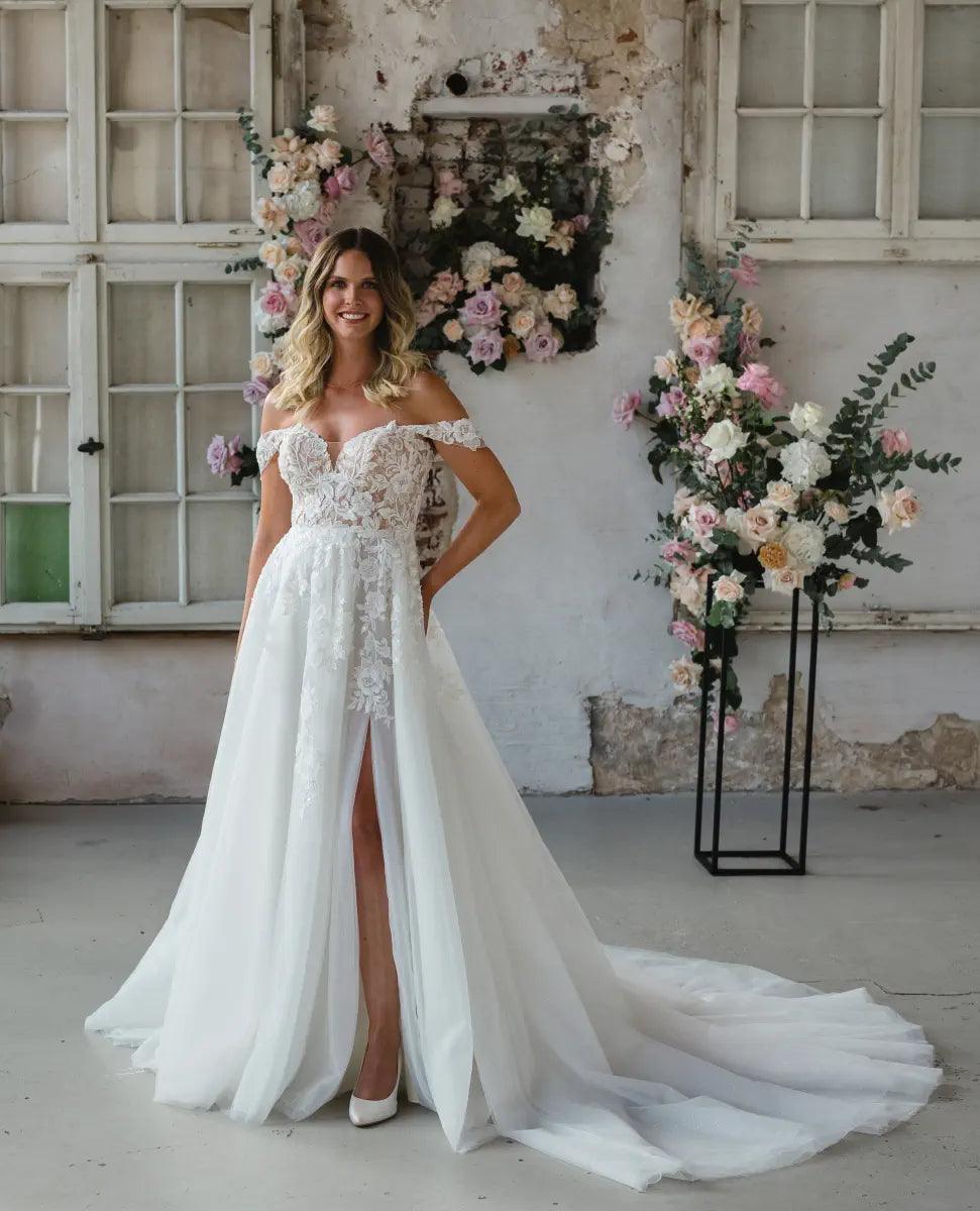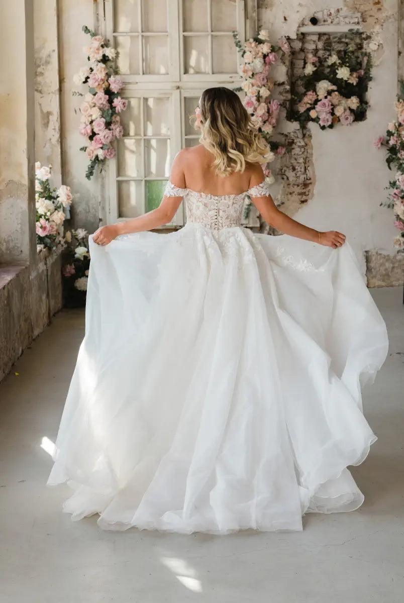 BG23-01 is een romantische A-lijn jurk met een ultraflatterende strapless sweetheart halslijn en off-shoulder bandjes die de schouders niet raken. Bridonista Designs streeft ernaar om ingewikkelde details te combineren met comfort en functionaliteit. Daarom kunnen de bandjes, die over de schouders vallen, losgeknoopt worden, zodat je snel en gemakkelijk een bruidslook kunt creëren die bij jouw smaak past. Verschillende applicaties van bloemenkant zijn harmonieus op deze droomjurk geplaatst en versierd met delicate pailletten. Stijl BG23-01 zal samen met jou stralen op je grote dag – wees niet bang om te schitteren, meid! Naast zijn esthetische aantrekkingskracht biedt het lijfje uitstekende ondersteuning dankzij verstevigde baleinen en nude push-up cups, wat een fantastische pasvorm garandeert voor alle maten. De zachte, cirkelvormige rok heeft een laag glitter tule en een beenspleet, wat de bruid een fantastische maar toch moderne uitstraling geeft.