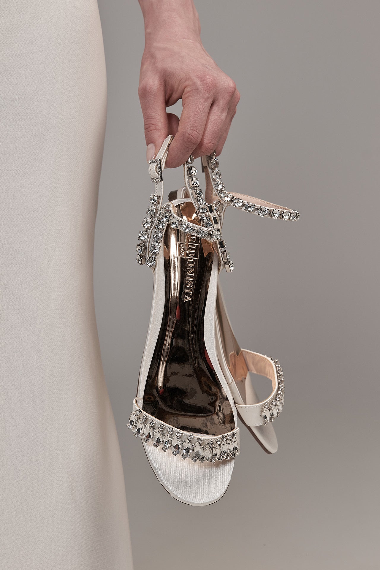 Satijn, bovenmateriaal met kristallen, PU-binnenzool, rubberen buitenzool.