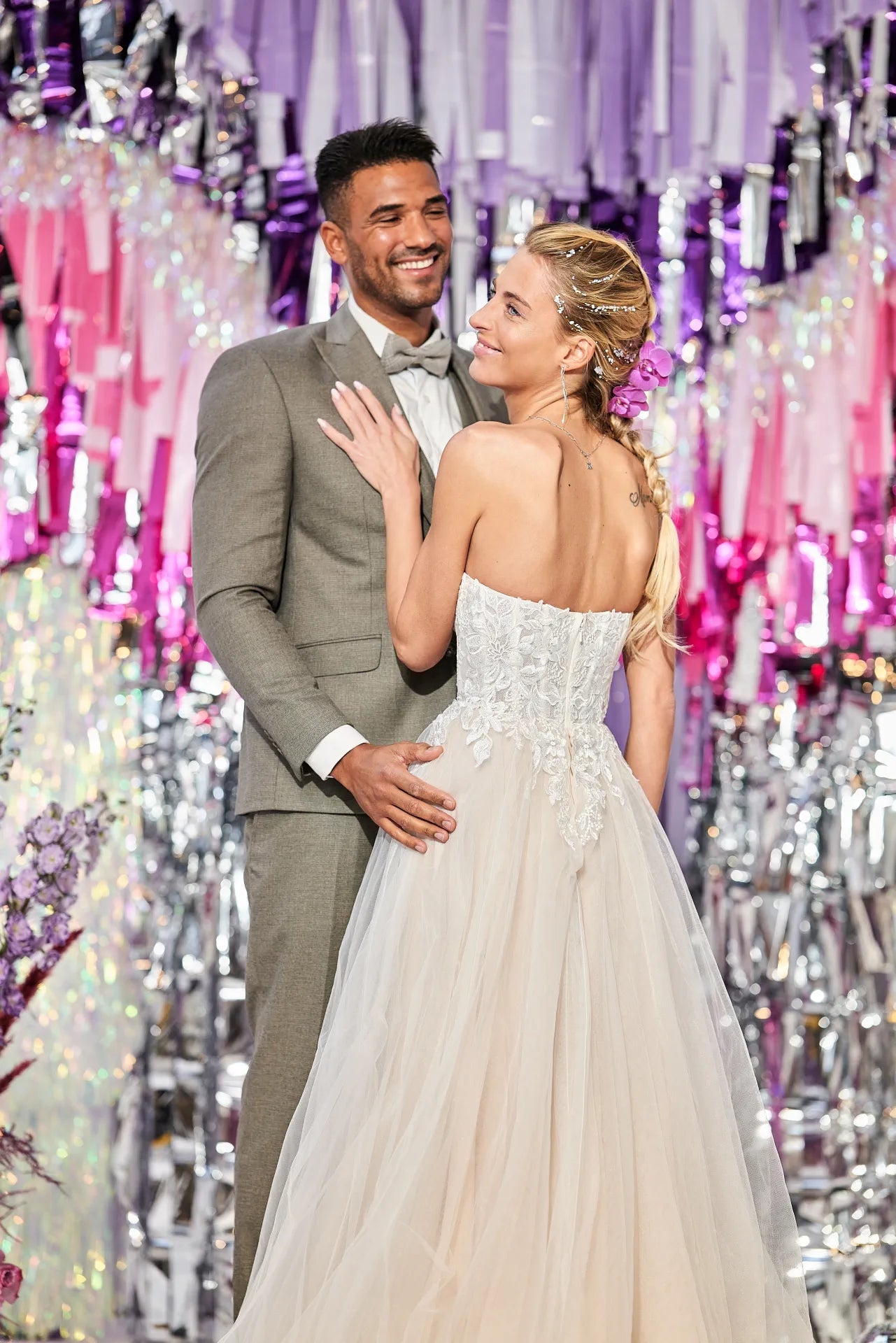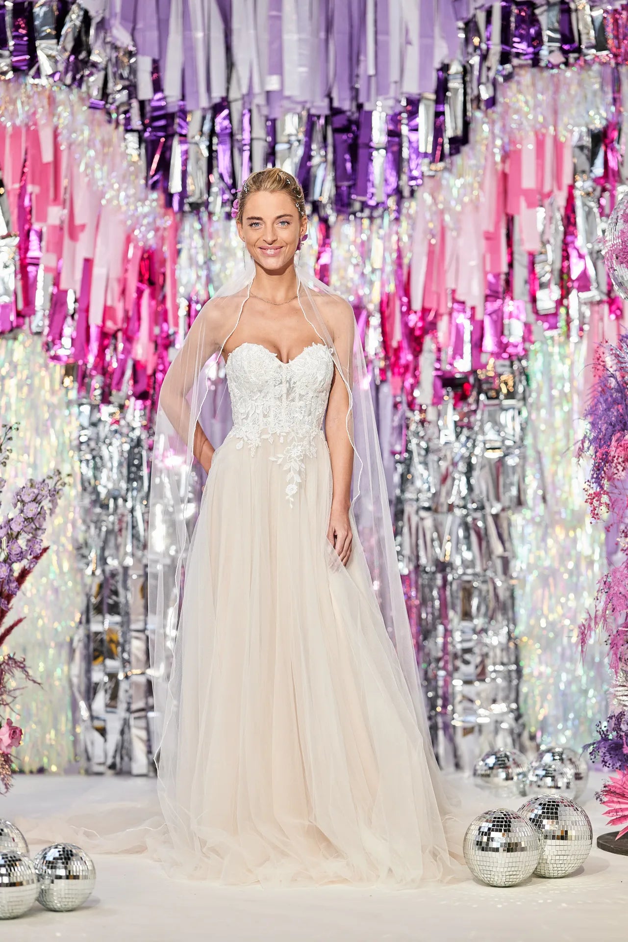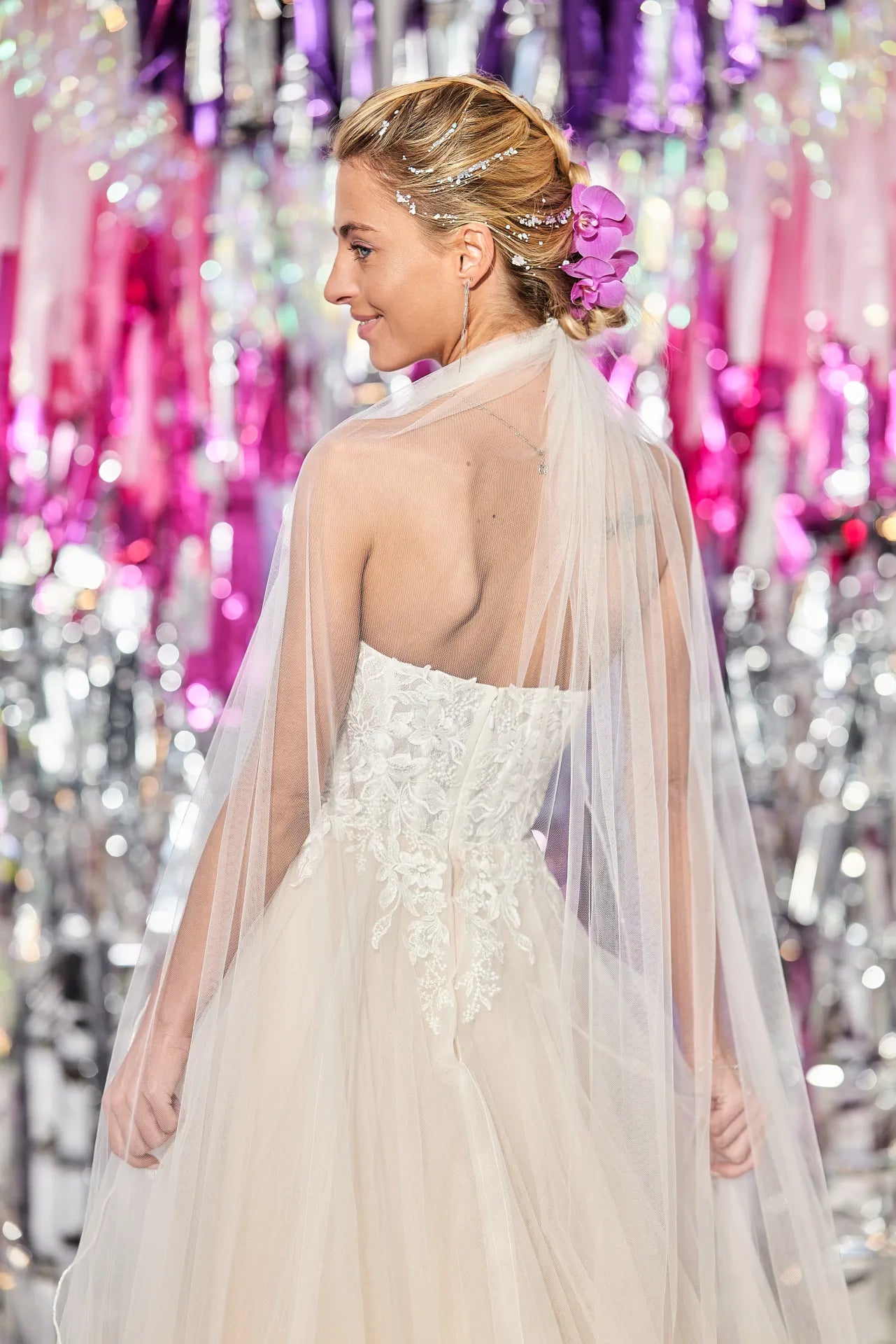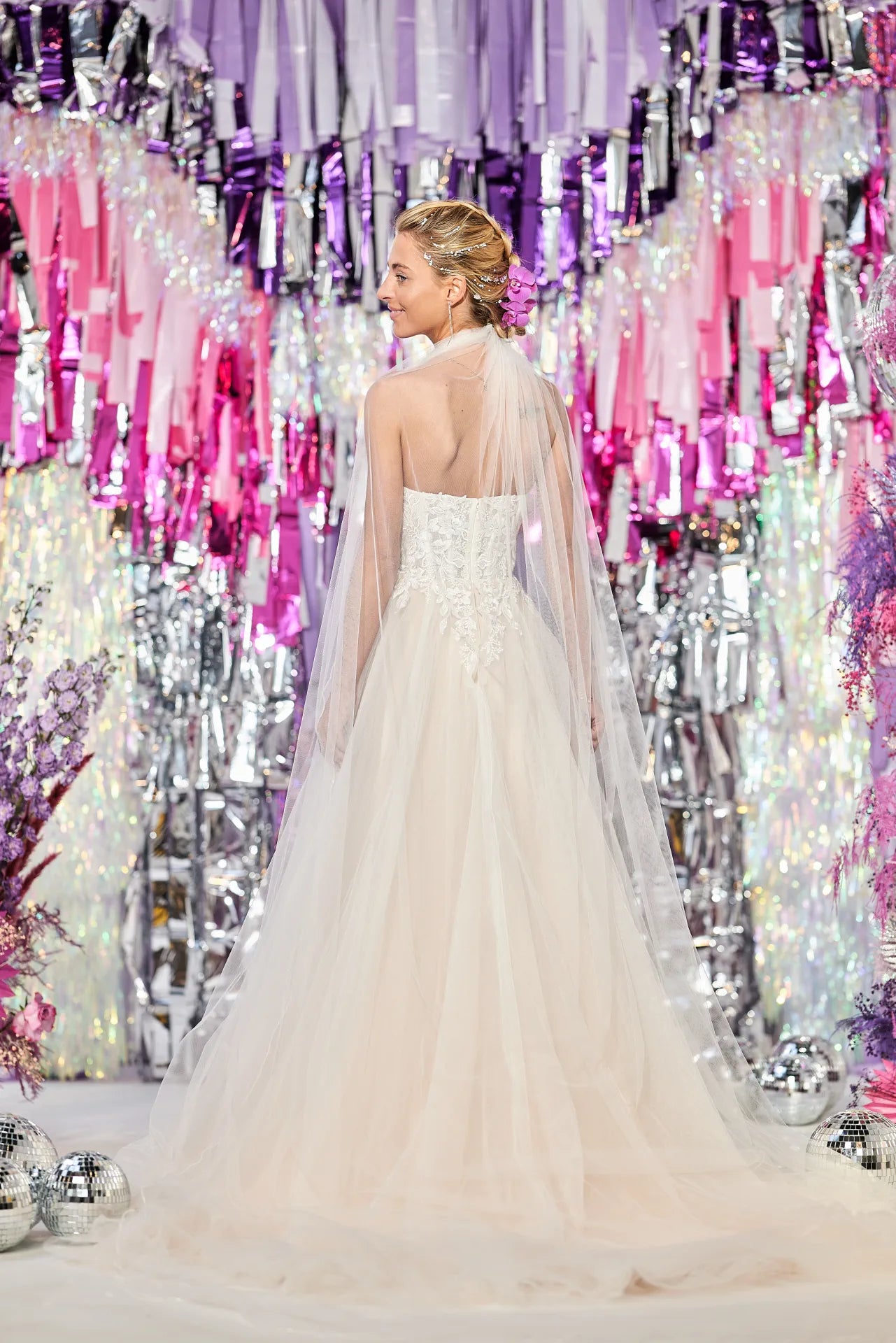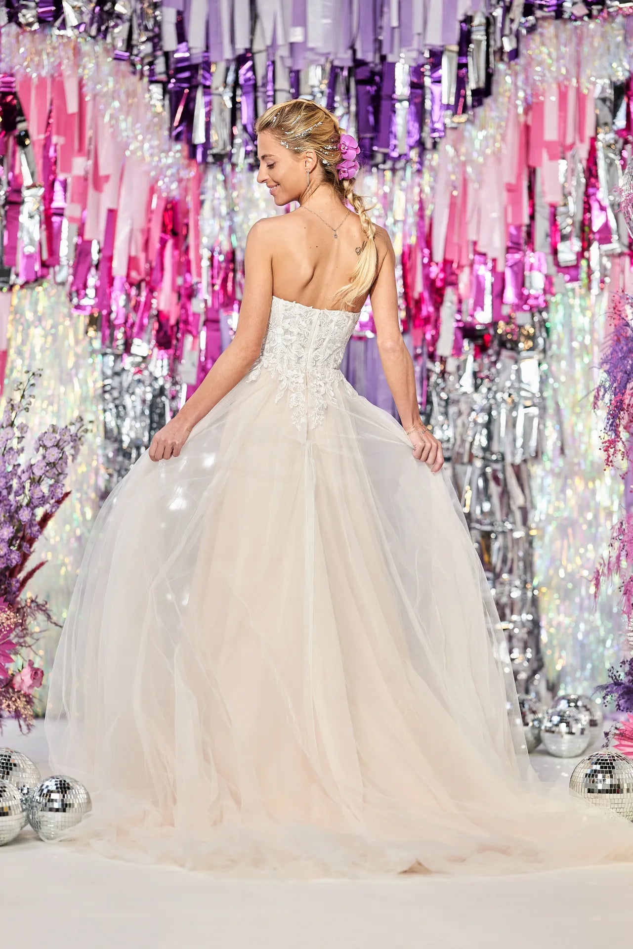 Onze Bridonista trouwjurk C23-23 is pure klassieke verfijning met bloemenkanten in een luchtig baljurksilhouet. Gemaakt van zachte tule, met een romantische sleep en sweetheart-halslijn. Perfect voor relaxte, speelse bruiden met een vleugje boho en vintage stijl.