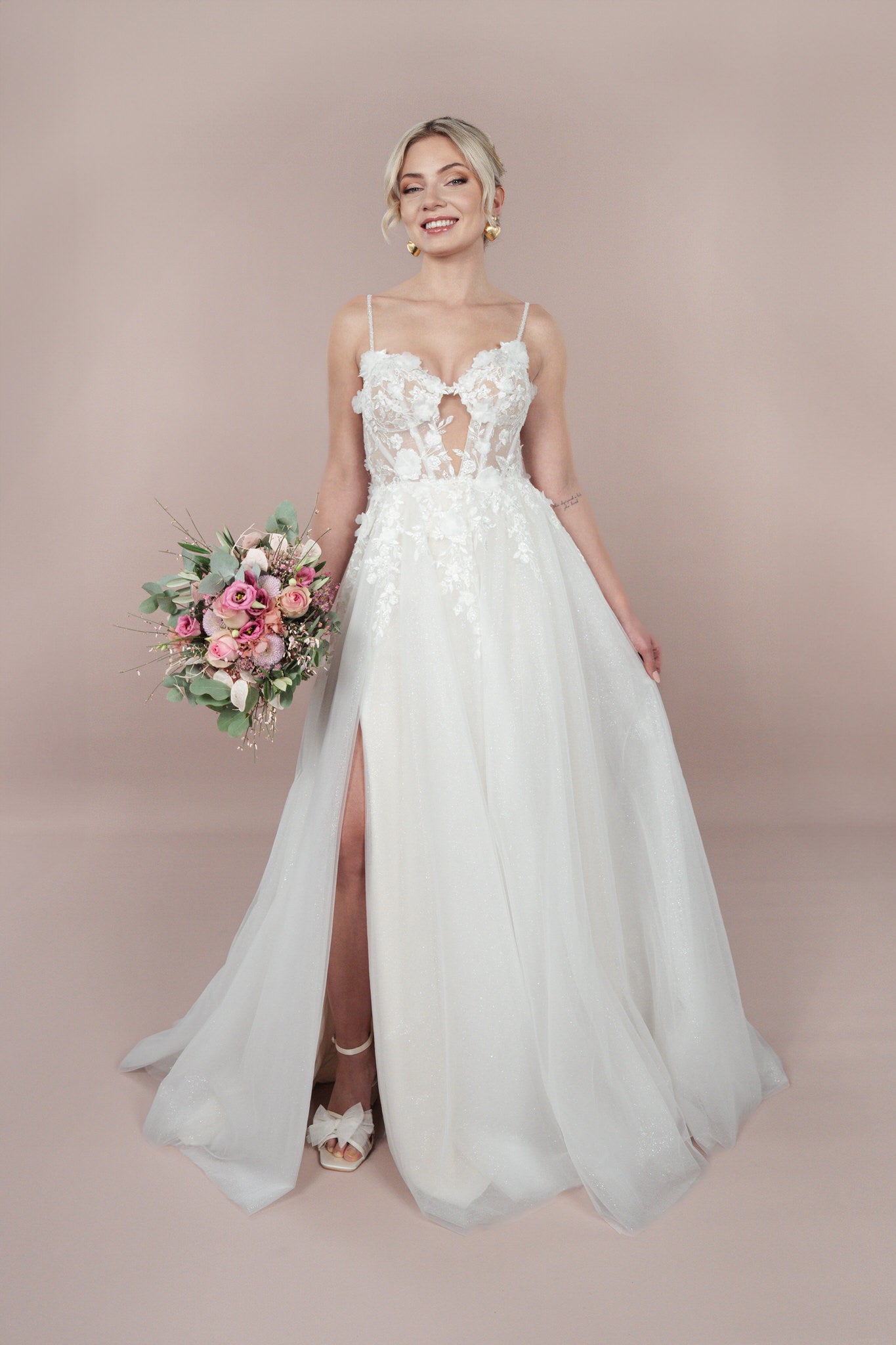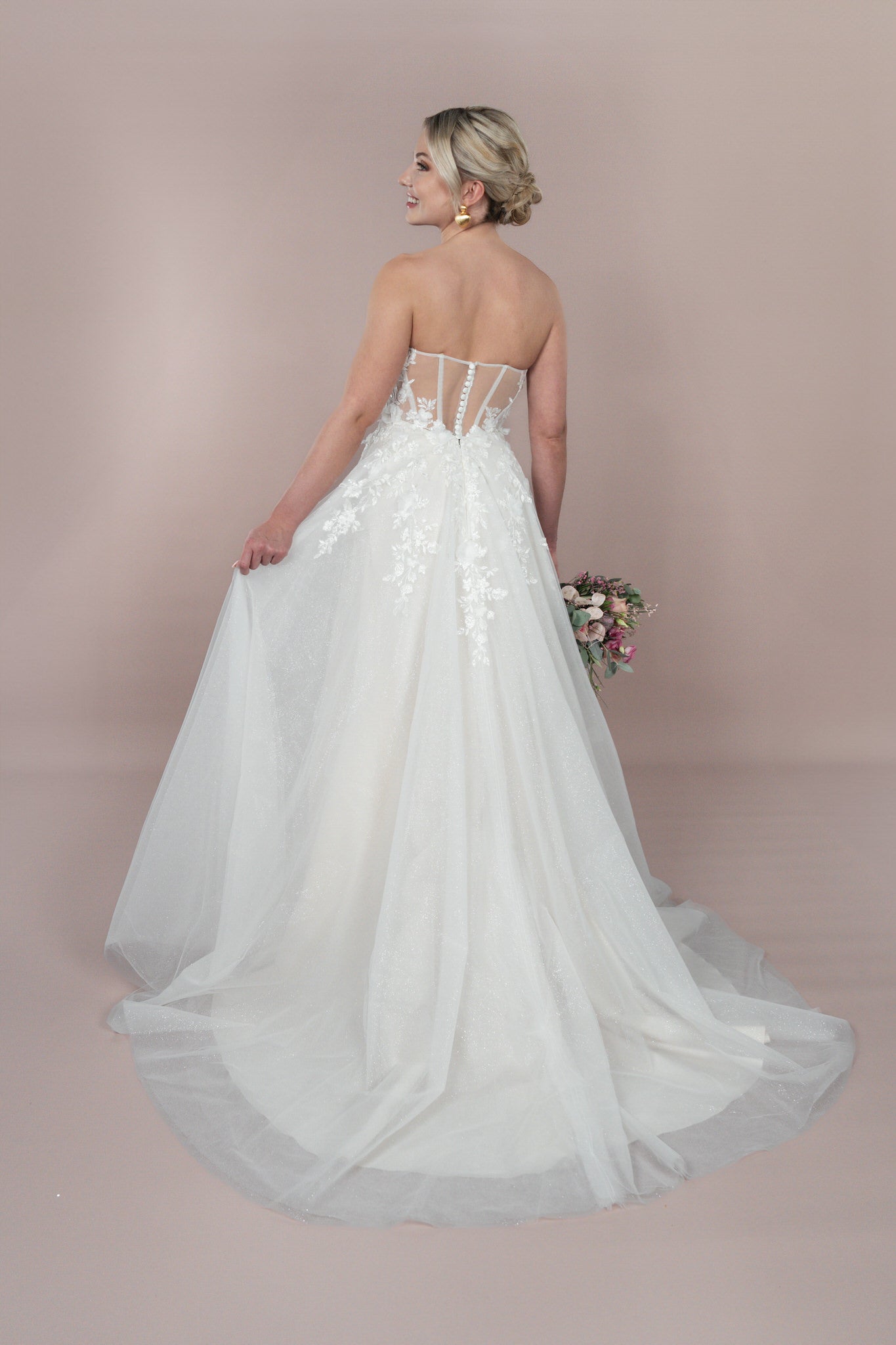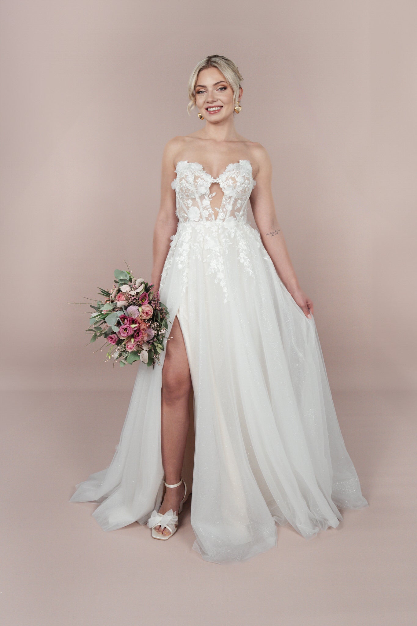 Het A-lijn silhouet flatteert het figuur, sluit subtiel aan op de taille en loopt vloeiend over in een rok. Je kunt kiezen tussen delicate tule of sprankelende glittertule voor de rok, waardoor je zelf de glamourfactor kunt bepalen en je persoonlijke stijl kunt uiten. De sexy beenspleet zorgt niet alleen voor bewegingsvrijheid, maar creëert ook een betoverend middelpunt dat de jurk een vleugje allure geeft.