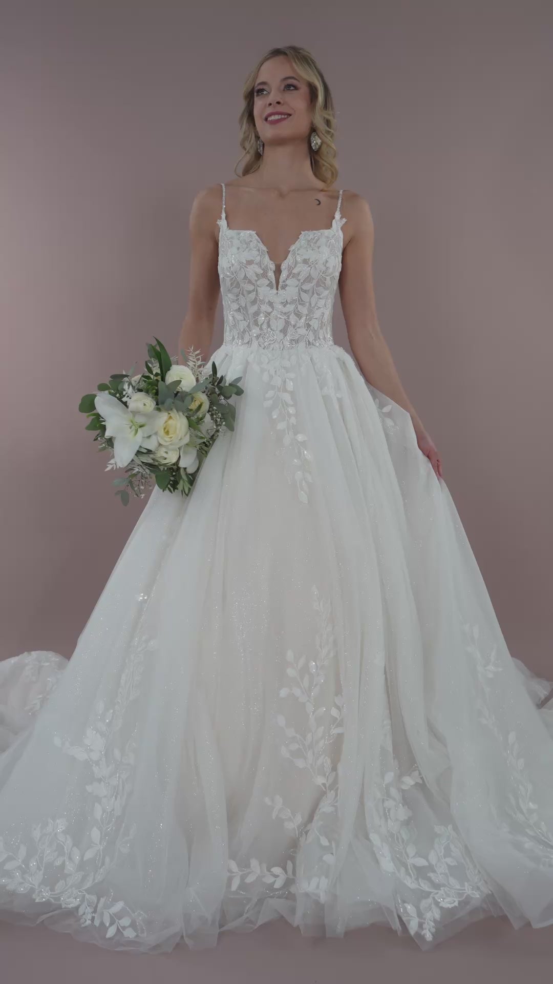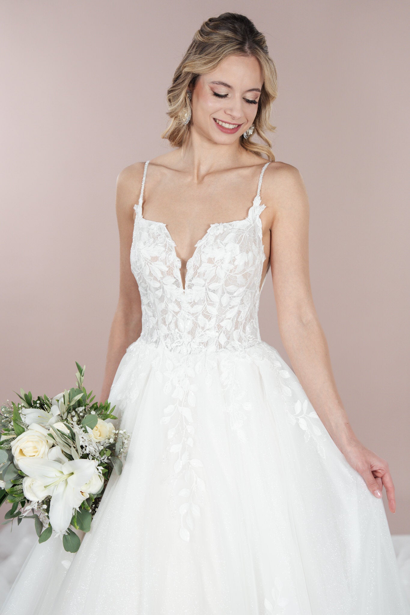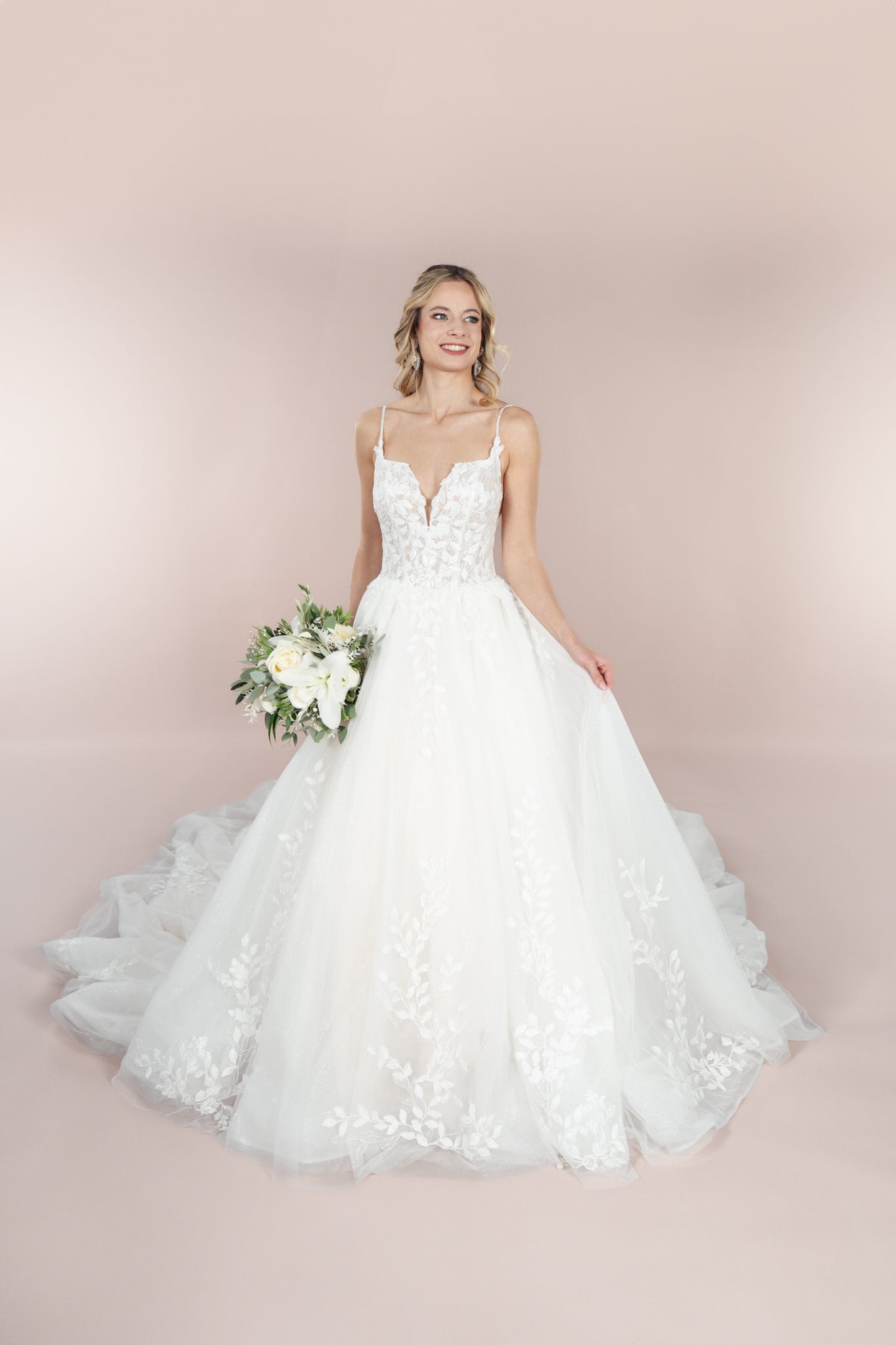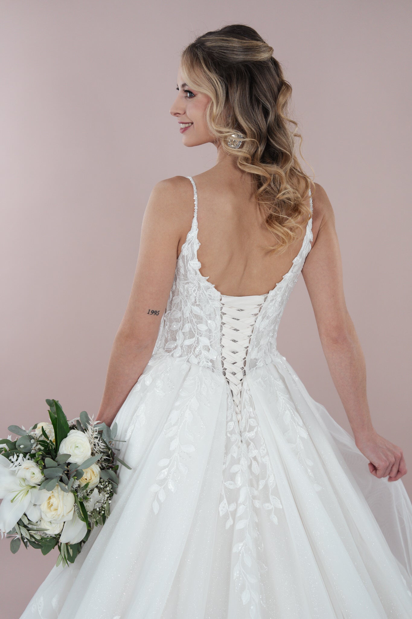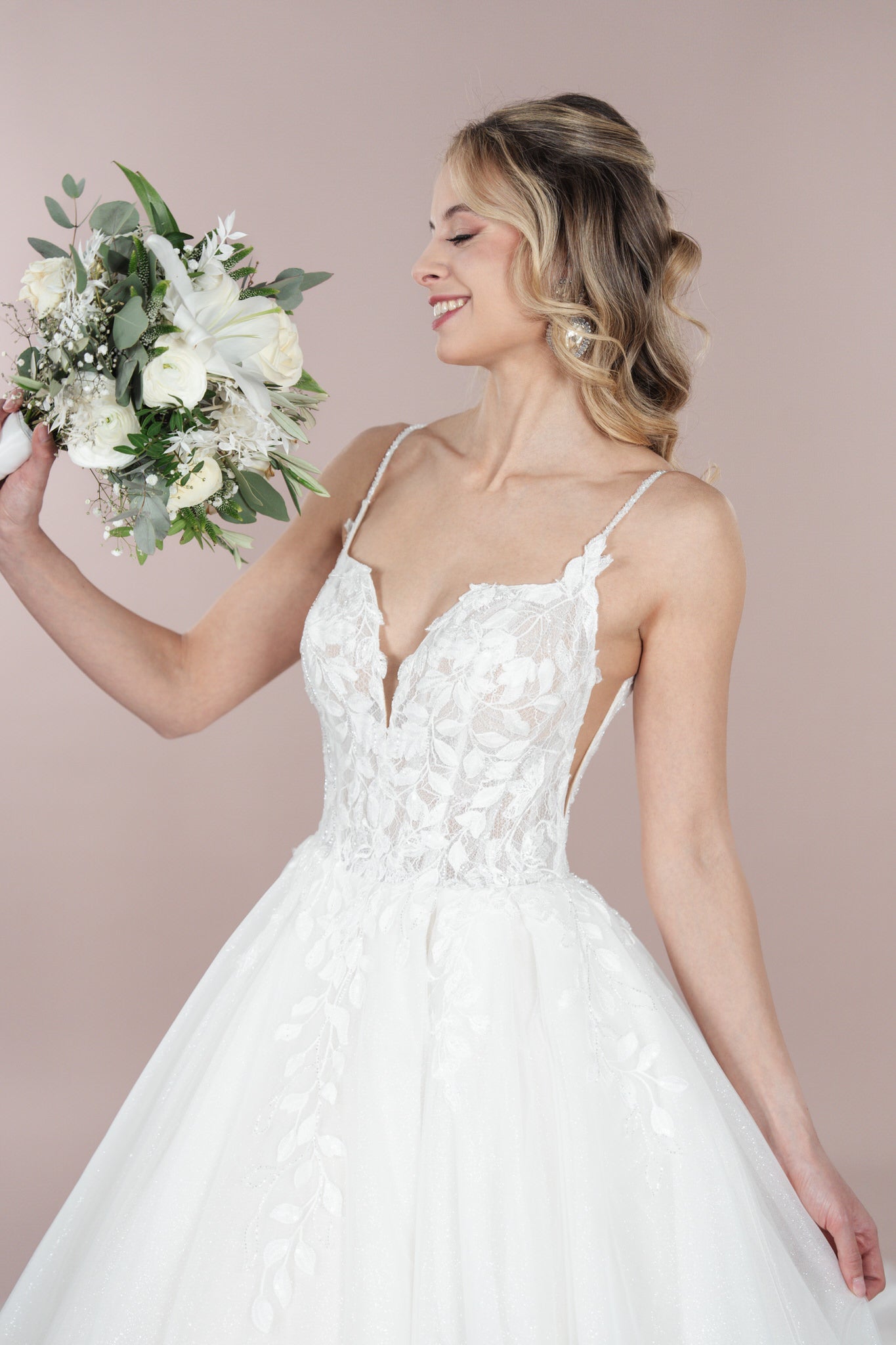 Het ontwerp van de Bridonista C25-B06 betovert met delicate bladkant verspreid over de jurk, wat het geheel een fijne, levendige textuur geeft. De combinatie van deze kanten versiering en de illusietule creëert een verfijnde transparantie en een dromerige uitstraling die de bruid zal laten stralen op haar grote dag.