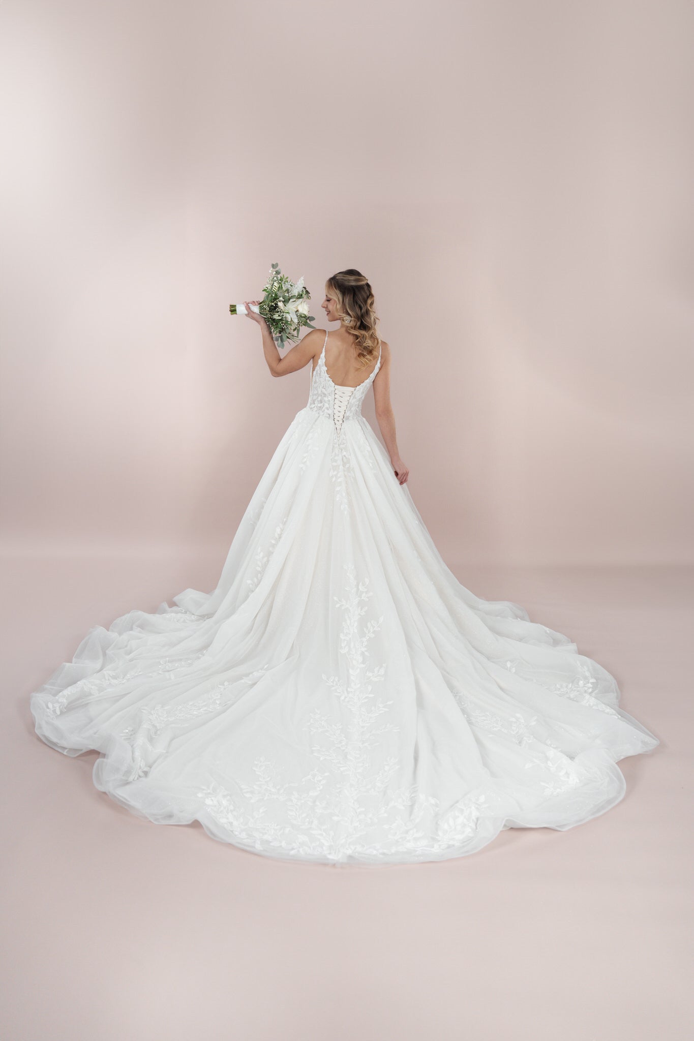 De lange sleep van de jurk zorgt voor een majestueuze entree en laat je bij elke stap sierlijk bewegen. Het voegt een romantische en glamoureuze touch toe aan de algehele look en maakt je trouwdag extra bijzonder.