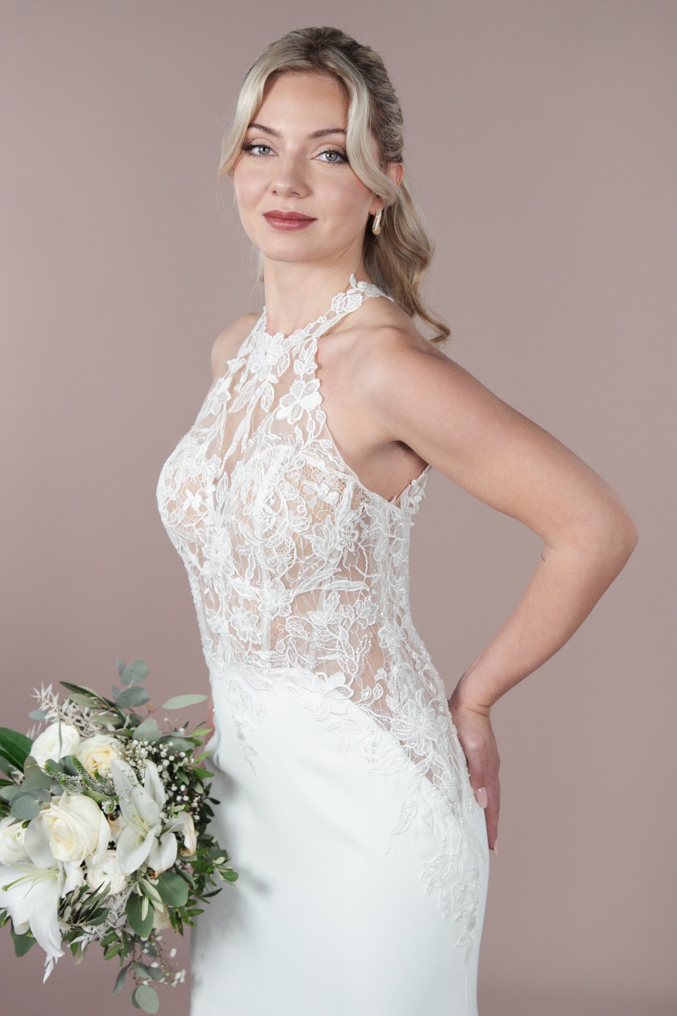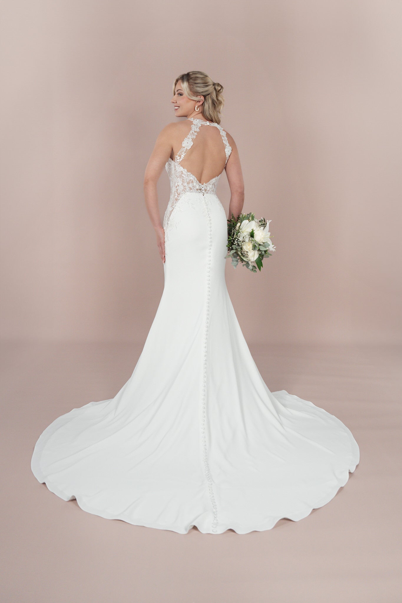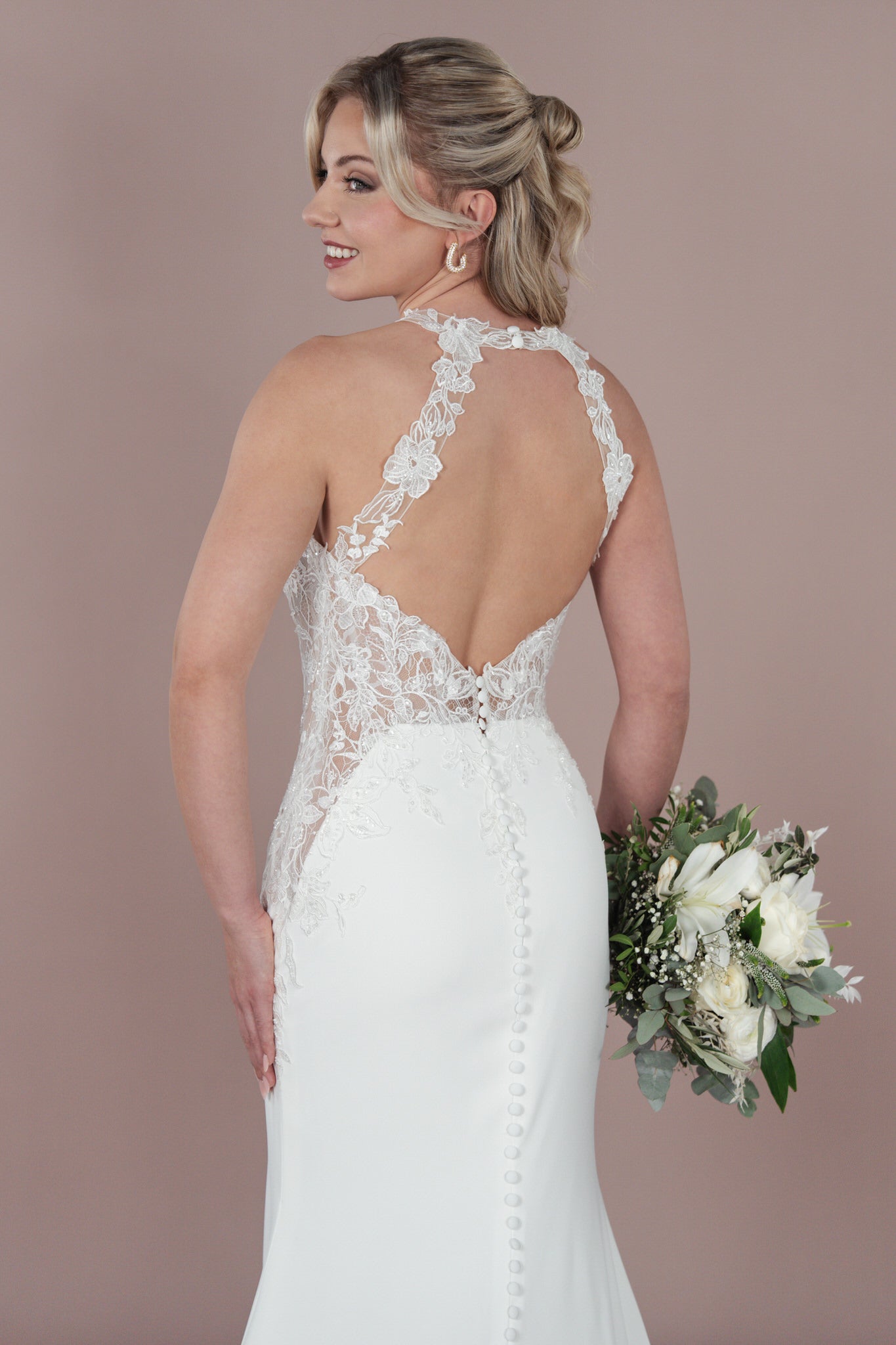 Bijzonder opvallend zijn de sexy uitsparingen aan de zijkant van het lijfje, die de jurk een moderne en speelse touch geven. Deze designelementen creëren een spannend contrast en accentueren elegant het figuur van de bruid. Gecombineerd met het delicate kant dat de hele jurk siert, resulteert dit in een romantische look die de schoonheid van het ontwerp benadrukt.