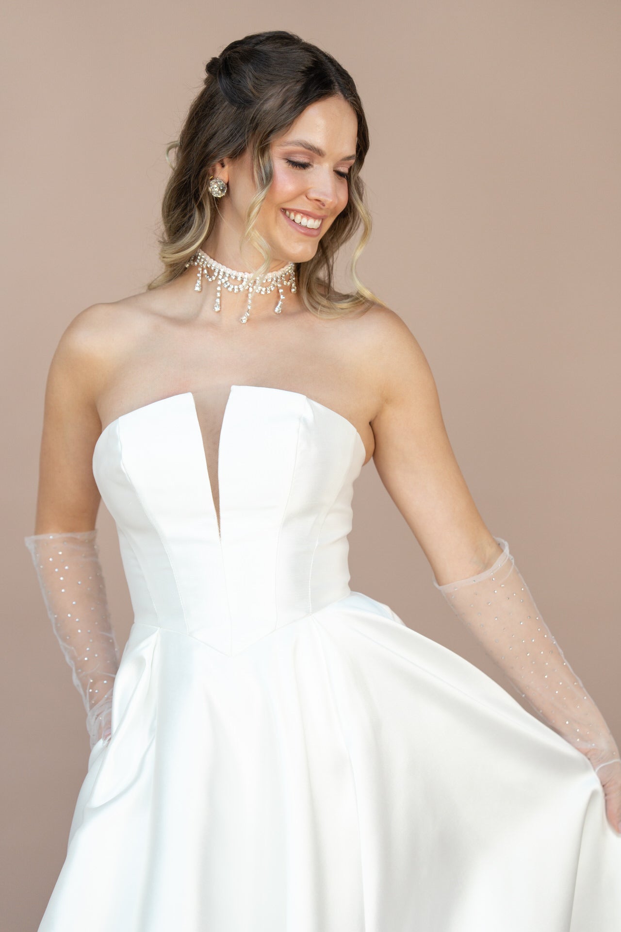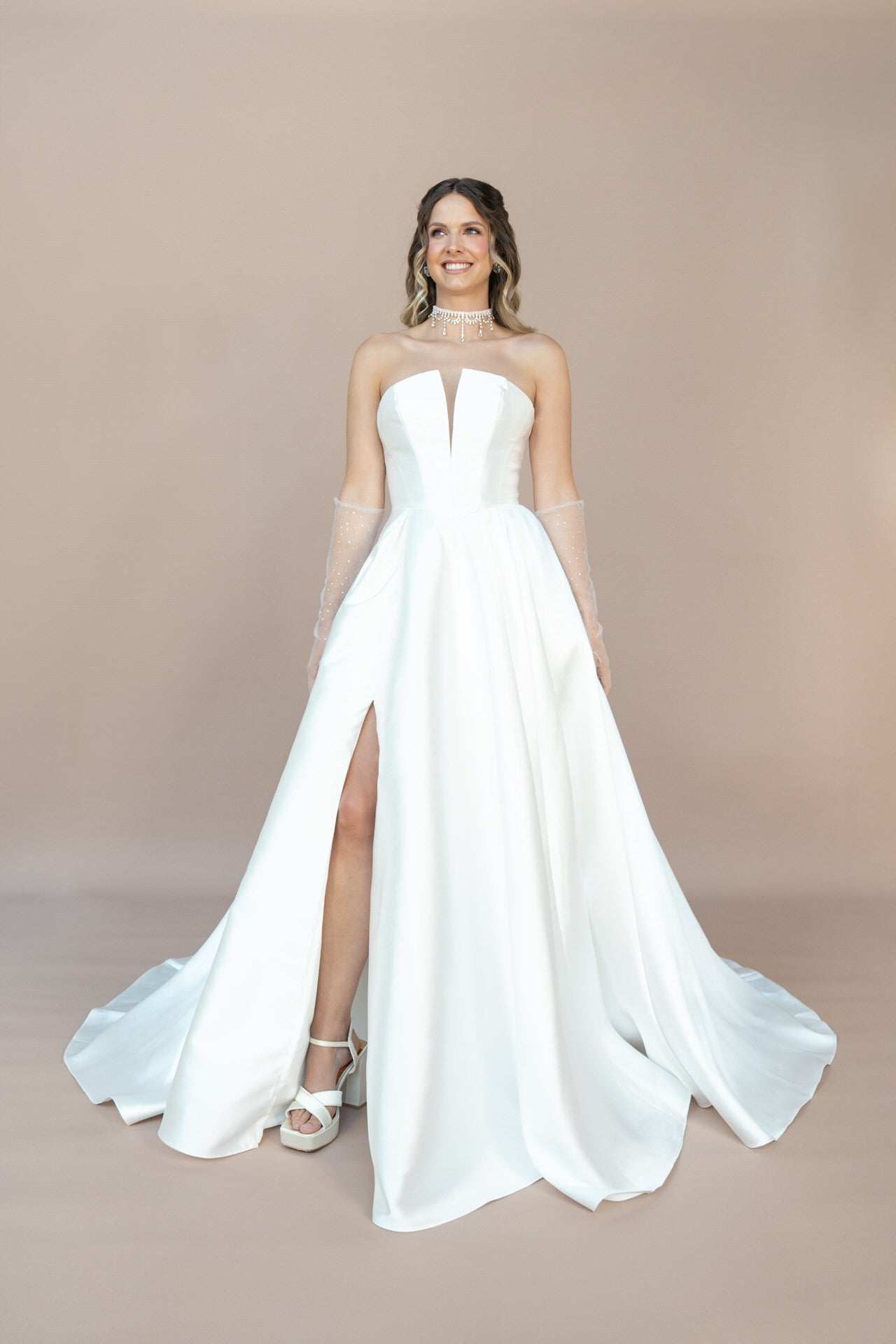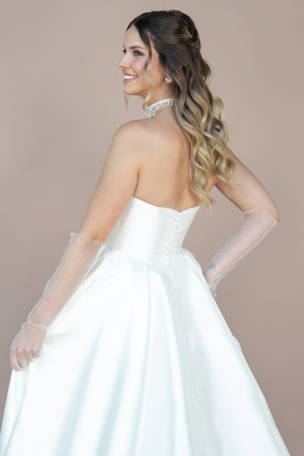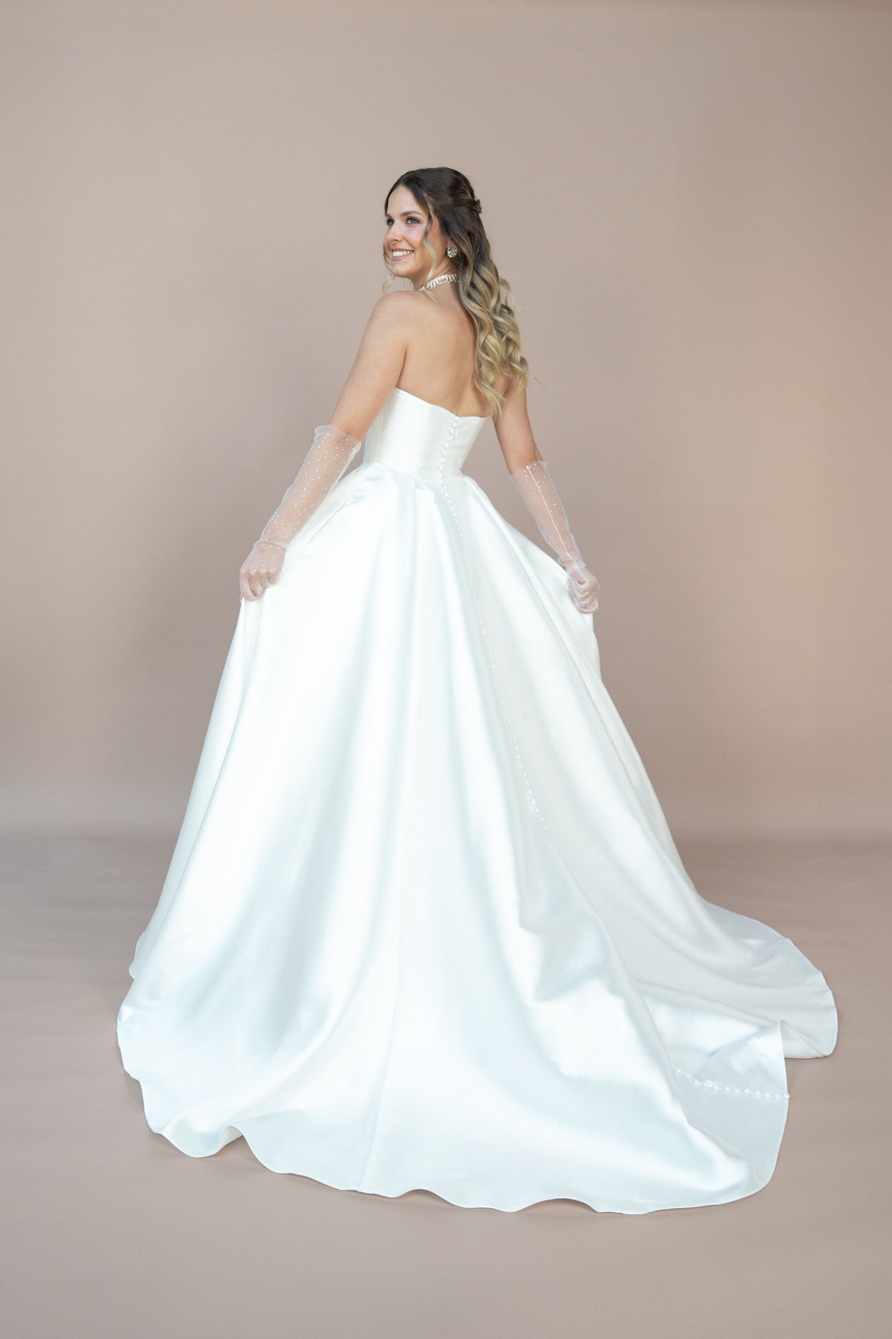 De recht gesneden rug benadrukt de strakke esthetiek van de jurk en is afgewerkt met een delicate knoopsluiting, wat een subtiele, klassieke touch toevoegt aan de moderne stijl. Elk detail van de Bridonista R2L26-C-A05 is ontworpen om je persoonlijkheid met pure elegantie te benadrukken. De soepele Mikado-stof geeft de jurk een luxueuze textuur die glinstert in het licht en gracieus meebeweegt met je bewegingen.