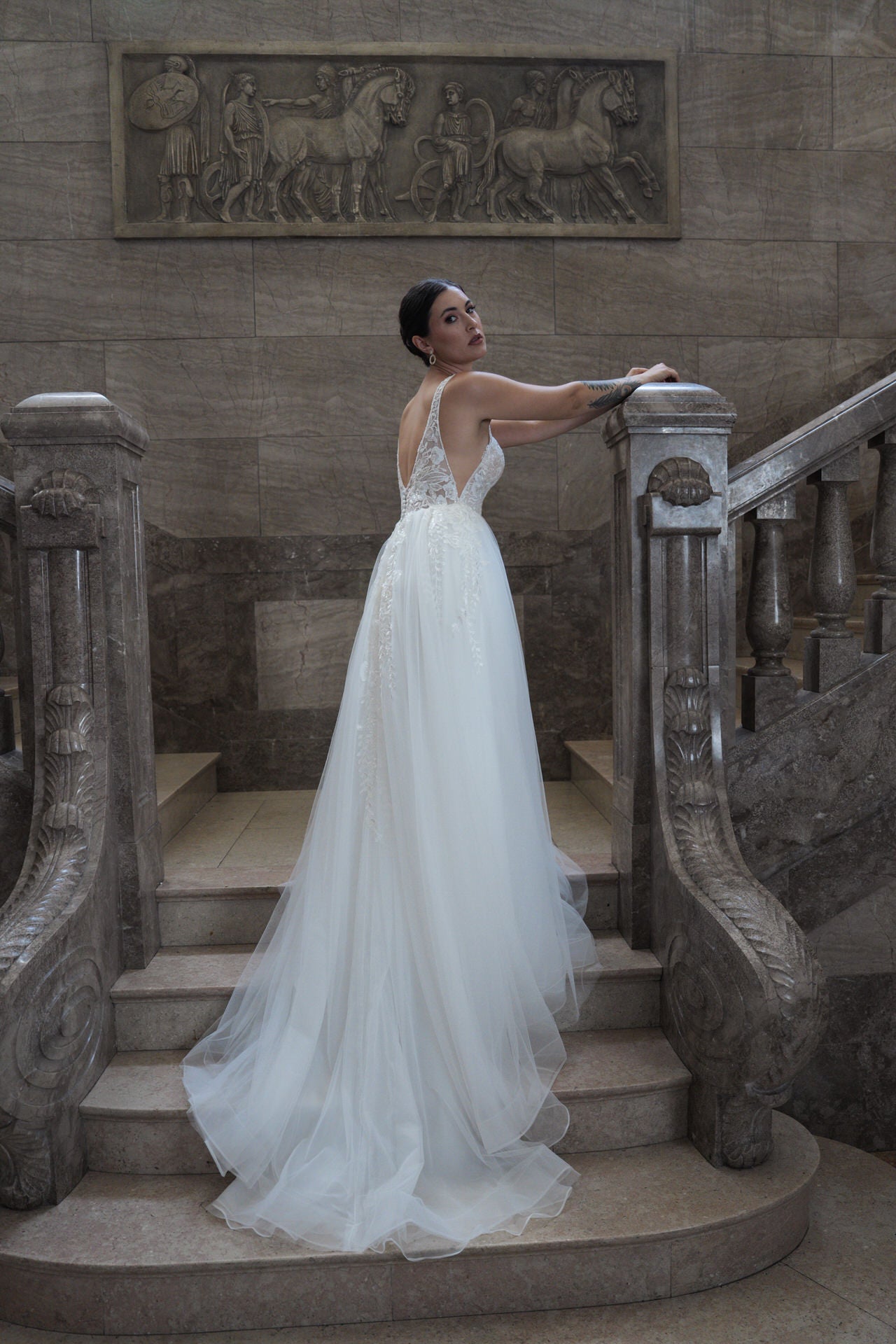 - V-hals aan de achterkant : De diepe, open rug voegt een verleidelijke touch toe die prachtig aansluit bij de romantische voorkant van de jurk.