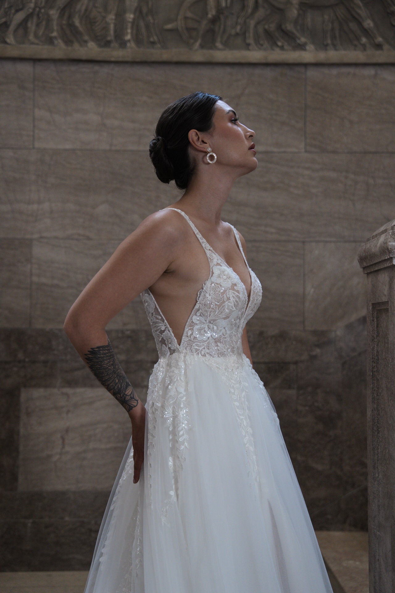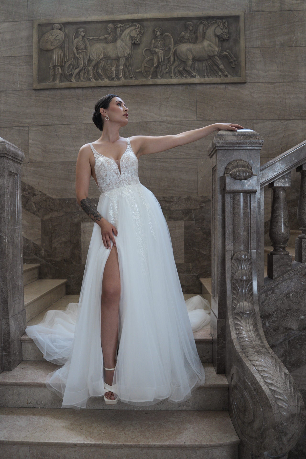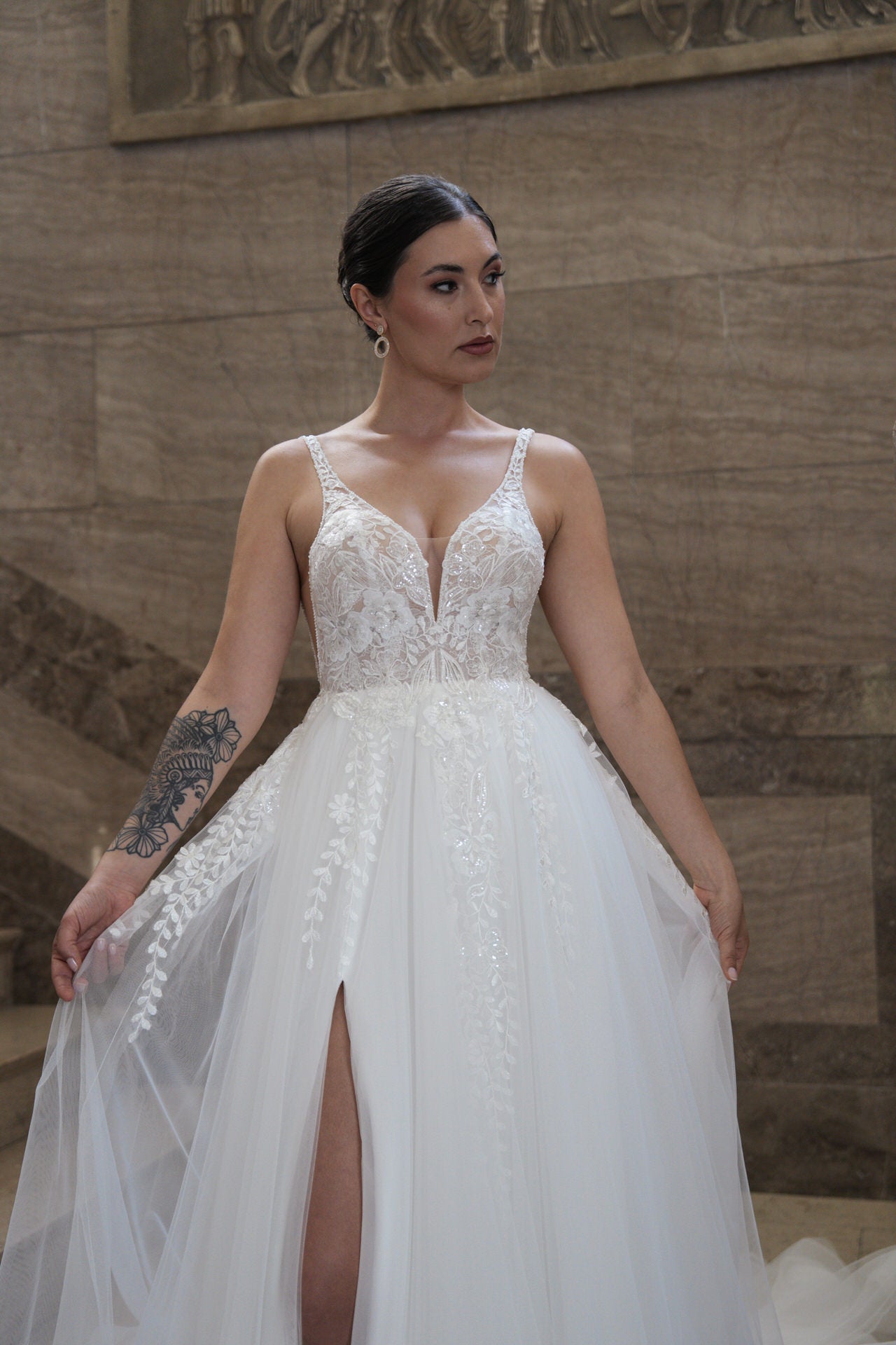 Een subtiele split in de rok voegt een moderne, speelse touch toe en onthult subtiel een glimp van je benen zonder afbreuk te doen aan de elegantie. De lange sleep zorgt voor een dramatische tred, perfect voor kerkceremonies of elegante gelegenheden. Subtiele uitsparingen voegen een modern, gedurfd element toe, terwijl de lingerie-geïnspireerde details de jurk een intieme, vrouwelijke uitstraling geven.