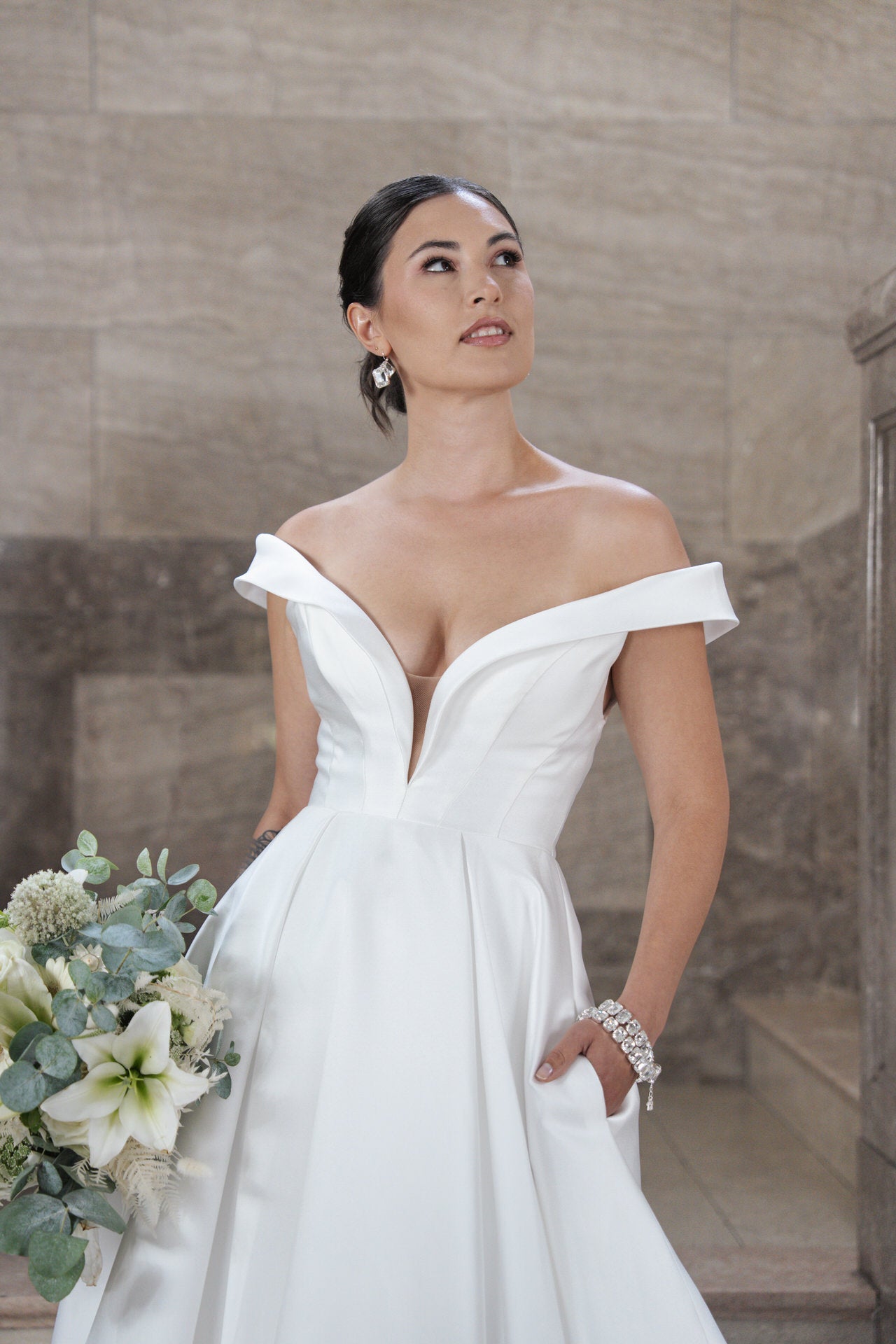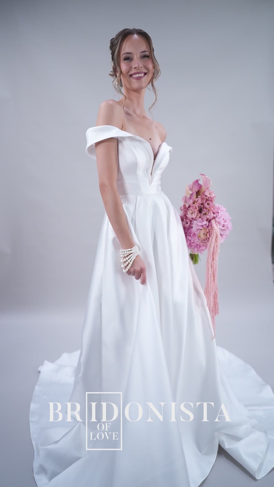 De V-vormige Carmen-halslijn, met zijn verleidelijk diepe decolleté, omlijst je decolleté met een sensuele maar elegante lijn, die een vleugje romantiek combineert met een moderne, sexy rand. Het off-shoulder design accentueert je schouders en sleutelbeenderen op een manier die zowel sierlijk als zelfverzekerd is, en geeft de jurk een subtiele allure. De gladde, luxueuze en vloeiende Mikado-stof van de rok valt in zachte golven, die culmineren in een middellange sleep die je verschijning majestueus en dramatisch maakt zonder je bewegingsvrijheid te beperken.