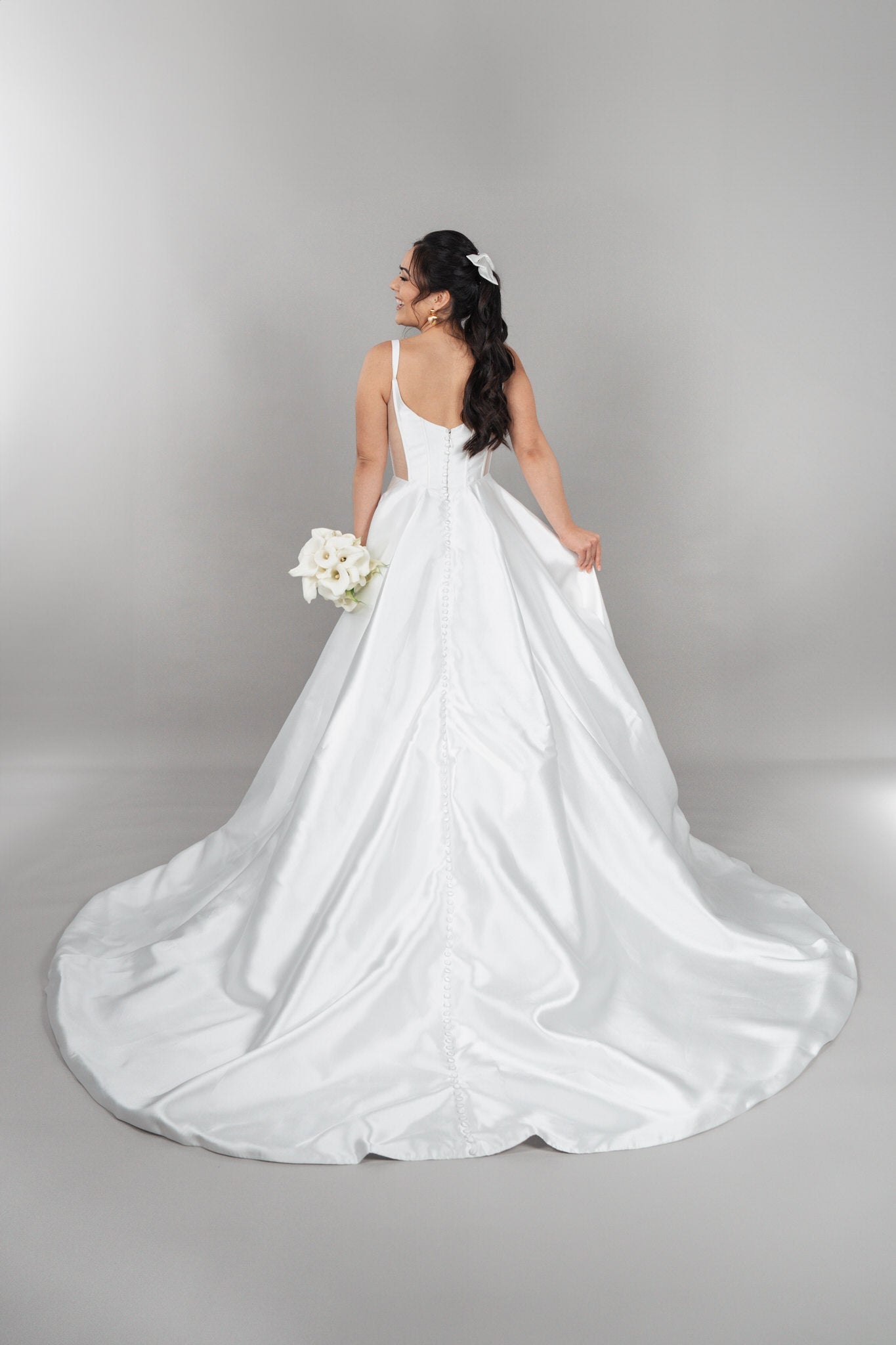 Hergestellt aus hochwertigem Mikado, bietet das Kleid sowohl eine angenehme Haptik als auch einen edlen Glanz. Dieser Stoff sorgt für eine strukturierte Form und verleiht dem Kleid eine luxuriöse Anmutung. Zusätzliche praktische Elemente wie die Taschen im Rock verbessern die Funktionalität und ermöglichen es der Braut, kleine persönliche Gegenstände ganz unauffällig zu verstauen.