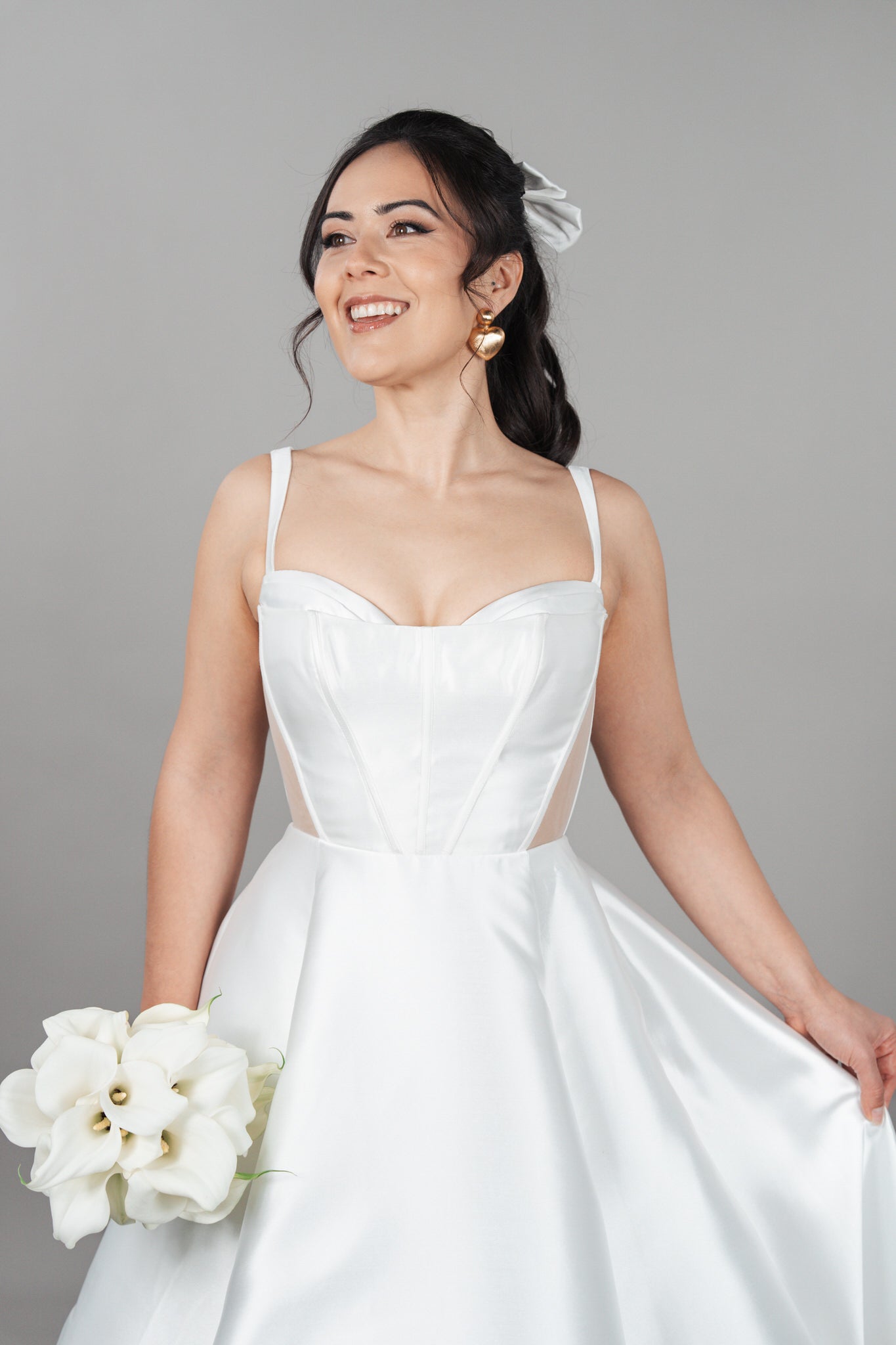 Besonders aufregend sind die Cutouts an den Seiten, die dem Design eine moderne Wendung verleihen. Diese Details sorgen für eine verführerische Note und ermöglichen es, die feminine Silhouette auf aufregende Weise zu betonen. Der Corsagen-Look des Kleides sorgt nicht nur für eine schmeichelhafte Passform, sondern verleiht der Braut auch ein Gefühl von Eleganz und Luxus.