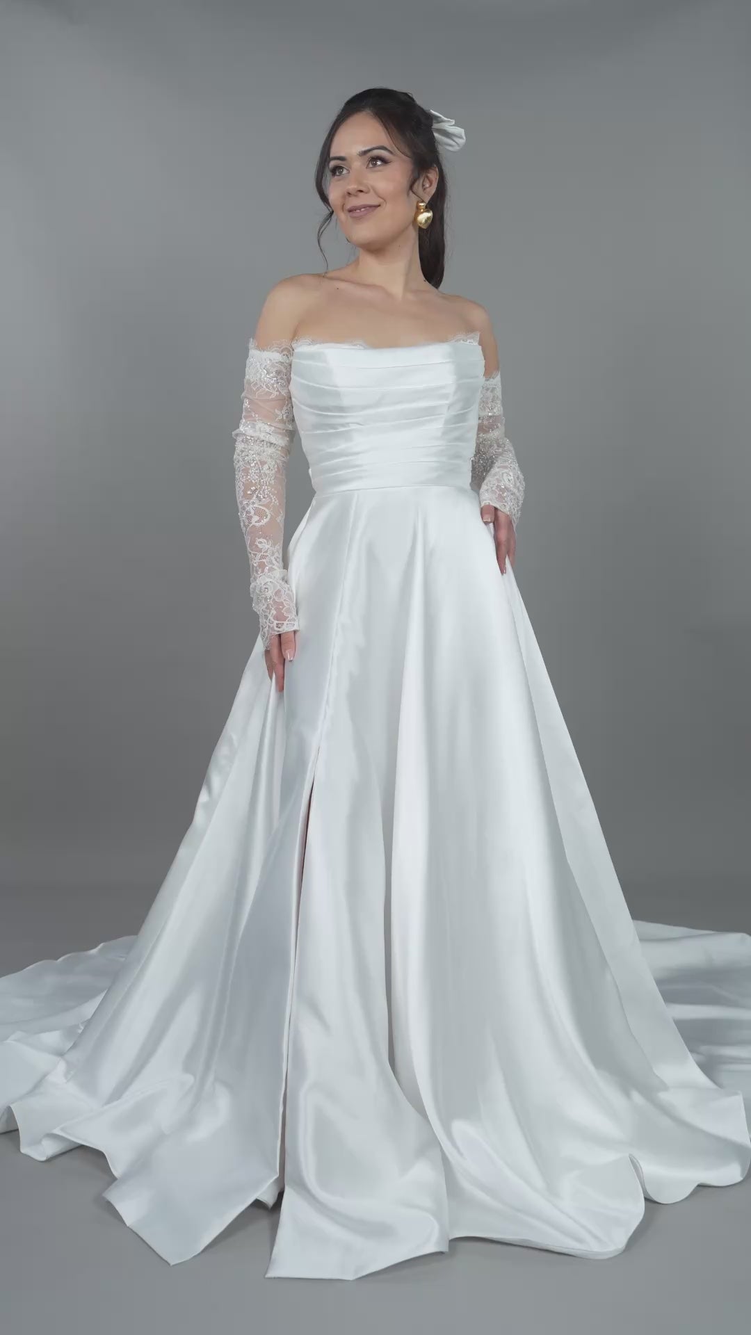 Die schicke A-Linien-Silhouette schmeichelt der Figur der Braut und sorgt für einen fließenden Fall, der sowohl anmutig als auch komfortabel ist. Die mittellange Schleppe fügt dem Kleid eine majestätische Note hinzu, die es ideal für eine feierliche Zeremonie macht, ohne dabei die Bewegungsfreiheit einzuschränken.