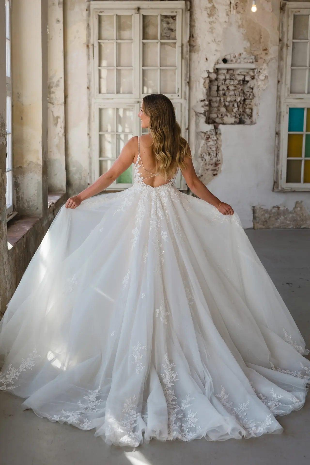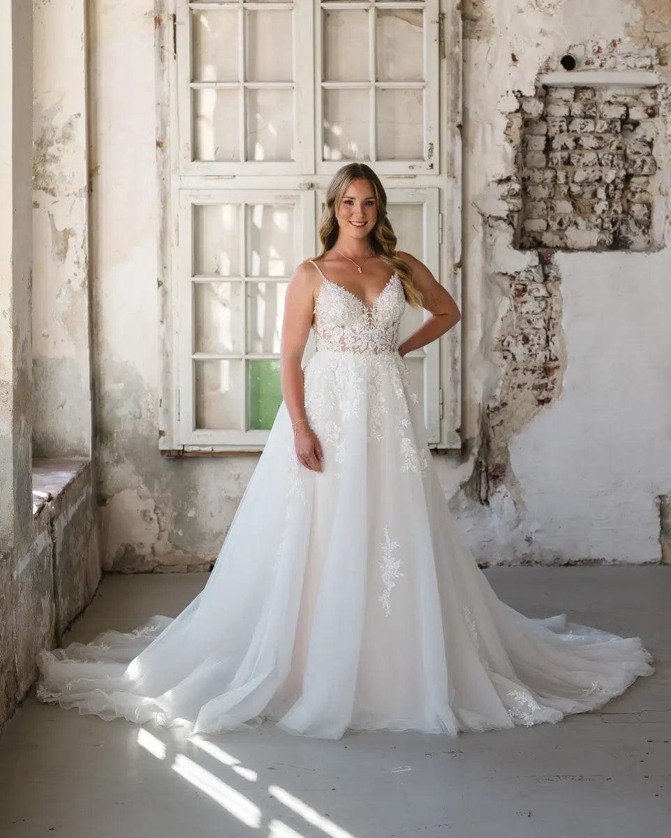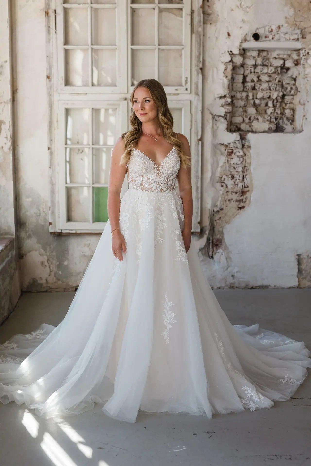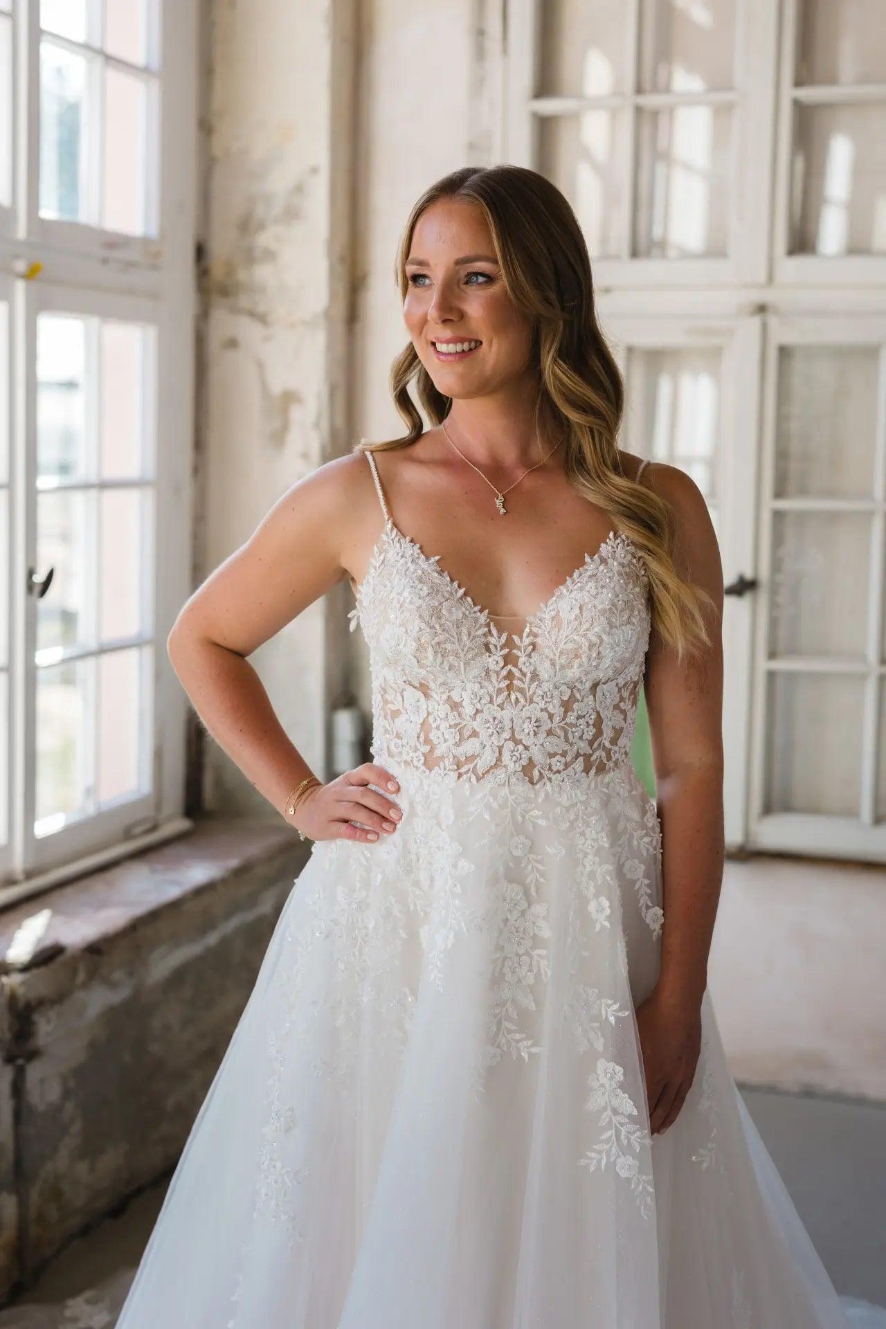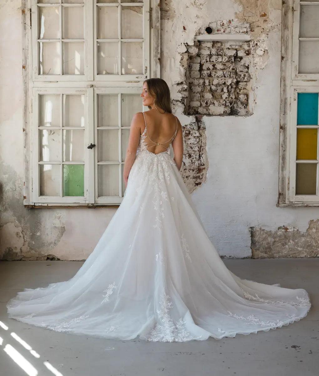 Du träumst von einem leichten Hochzeitskleid, willst aber nicht auf Spitze, Glitzer und Glamour verzichten? Vereinbare jetzt einen Termin bei deinem Bridonista-Fachhändler und verliebe dich in das Modell BG23-04. Diese A-Linie hat alles, was das schmachtende Herz einer Braut begehrt: klassische florale Spitze, feine Spaghettiträger, Transparenz und einen Cutout am Rücken zum Dahinschmelzen. Für die perfekte Passform verfügt dieses Bridonista-Design natürlich auch über eine starke Corsage und Push-up-Cups, damit du dich an deinem großen Tag selbstbewusst und wunderschön fühlen kannst. Ein besonderes Highlight ist der aufwendig gearbeitete Schlüsselloch-Ausschnitt am Rücken, an den du dich sicher ein Leben lang erinnern wirst.