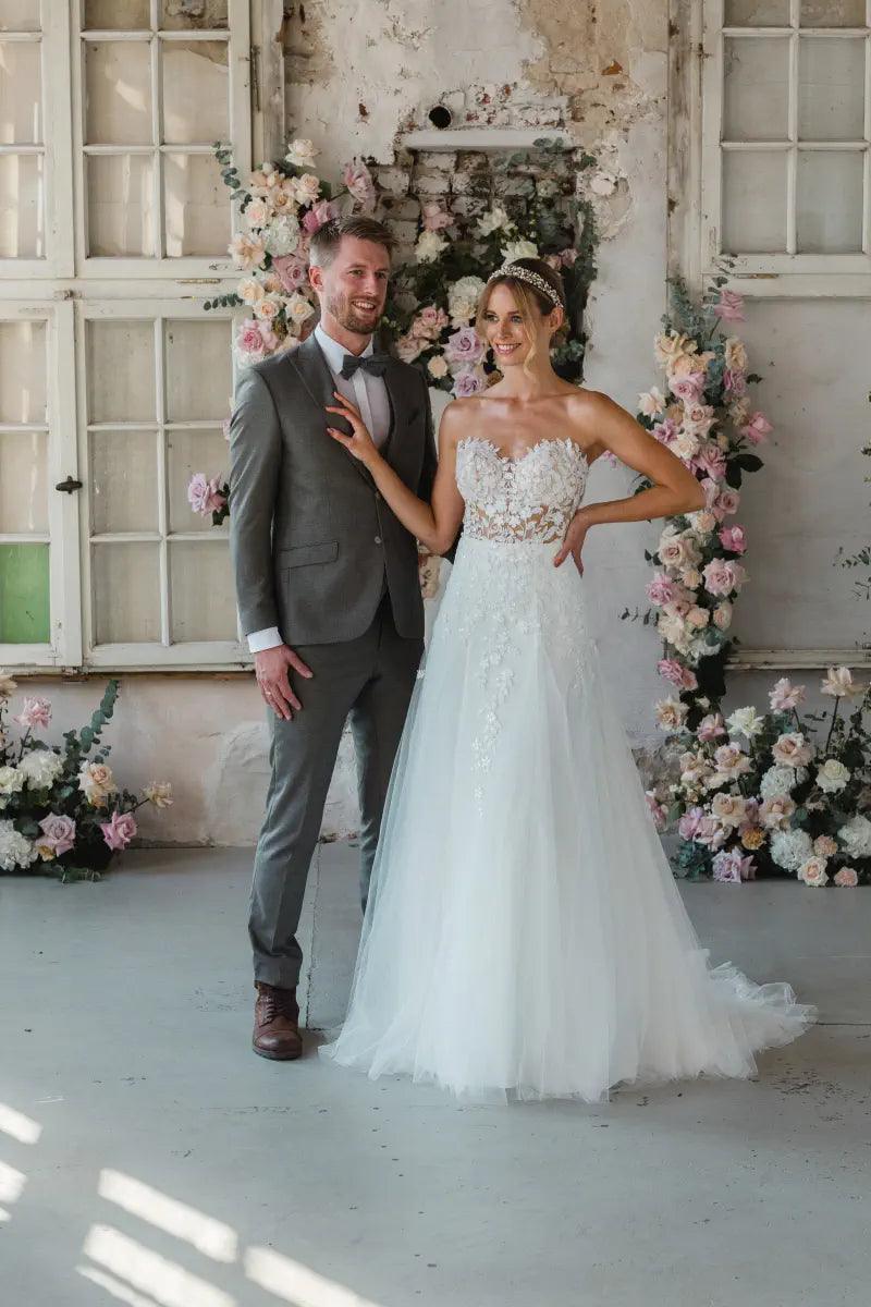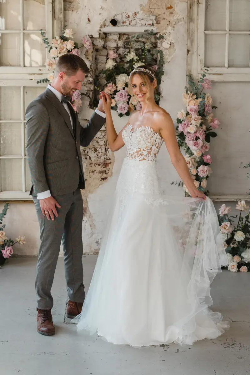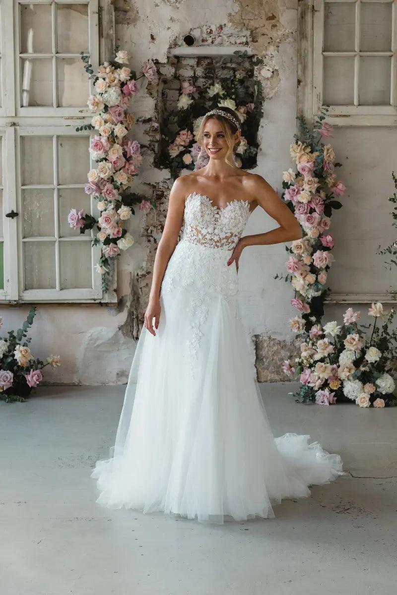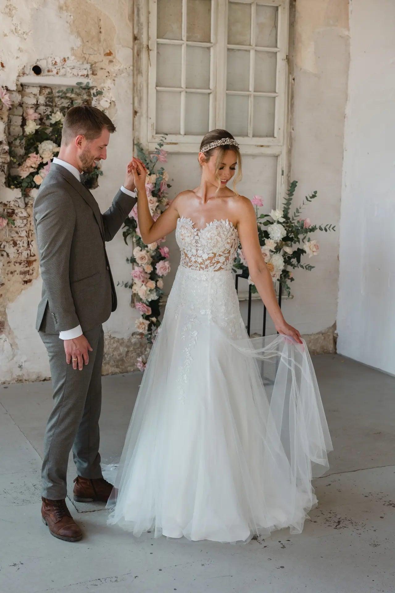 Hallo Ballkönigin, es ist an der Zeit, dein Hochzeitskleid zu finden! Das Modehaus Bridonista möchte nicht nur moderne Traumkleider entwerfen, sondern auch aktuelle Trends mit klassischen Formen kombinieren. Das Brautkleid BG23-05 wurde auf der Grundlage einer klassischen Passform, der heruntergezogenen Taille und in Kombination mit dem modernen Lingerie-Look entworfen. Der romantische Herzchen-Ausschnitt hat einen organischen Rand, so dass sich die feinen Blätter aus Spitze ganz natürlich über die Corsage und in den Tüllrock hineinschlängeln. Die verlängerte Taille betont die feminine Figur der Braut, ohne dabei auf ein bequemes Tragegefühl zu verzichten. Diese Passform ist perfekt für alle Kurvenköniginnen, die ihren Körper auf raffinierte Weise betonen, aber trotzdem nicht auf das Ballkleidgefühl verzichten wollen.