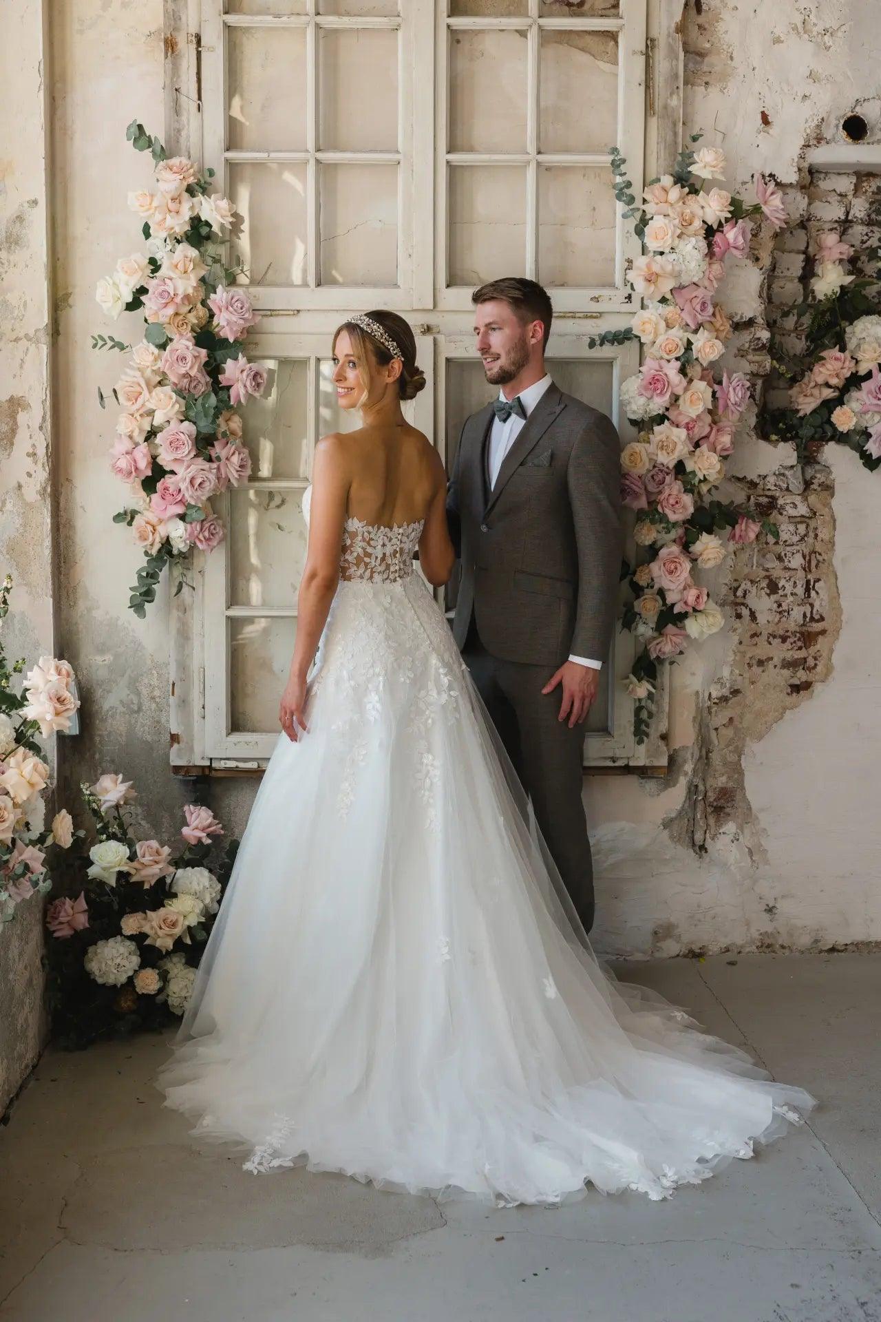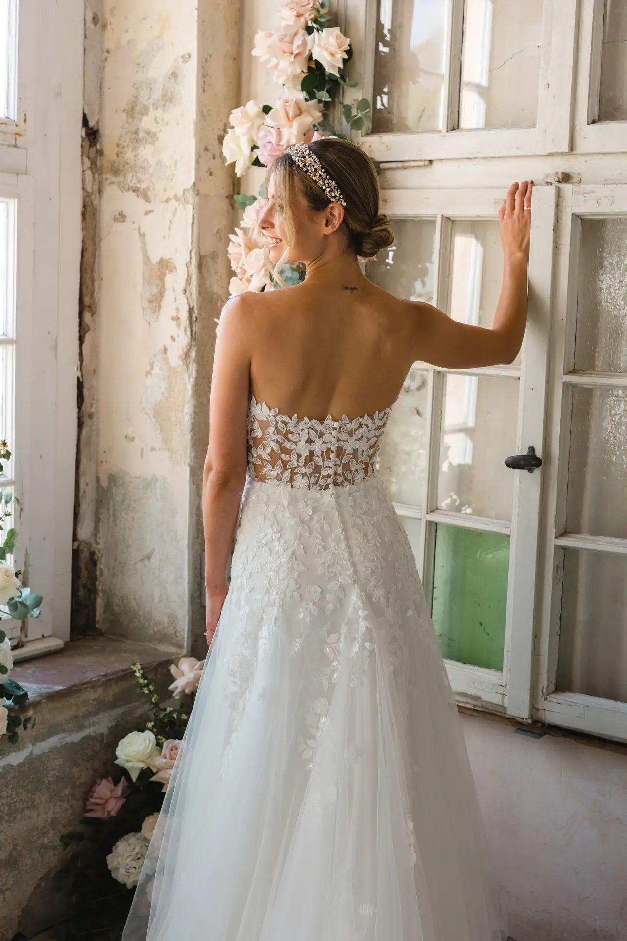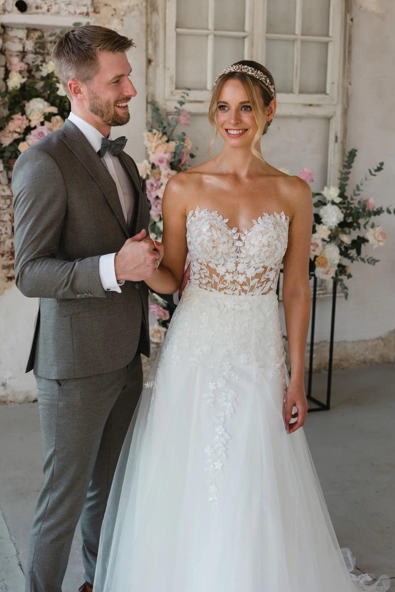 Hallo Ballkönigin, es ist an der Zeit, dein Hochzeitskleid zu finden! Das Modehaus Bridonista möchte nicht nur moderne Traumkleider entwerfen, sondern auch aktuelle Trends mit klassischen Formen kombinieren. Das Brautkleid BG23-05 wurde auf der Grundlage einer klassischen Passform, der heruntergezogenen Taille und in Kombination mit dem modernen Lingerie-Look entworfen. Der romantische Herzchen-Ausschnitt hat einen organischen Rand, so dass sich die feinen Blätter aus Spitze ganz natürlich über die Corsage und in den Tüllrock hineinschlängeln. Die verlängerte Taille betont die feminine Figur der Braut, ohne dabei auf ein bequemes Tragegefühl zu verzichten. Diese Passform ist perfekt für alle Kurvenköniginnen, die ihren Körper auf raffinierte Weise betonen, aber trotzdem nicht auf das Ballkleidgefühl verzichten wollen.