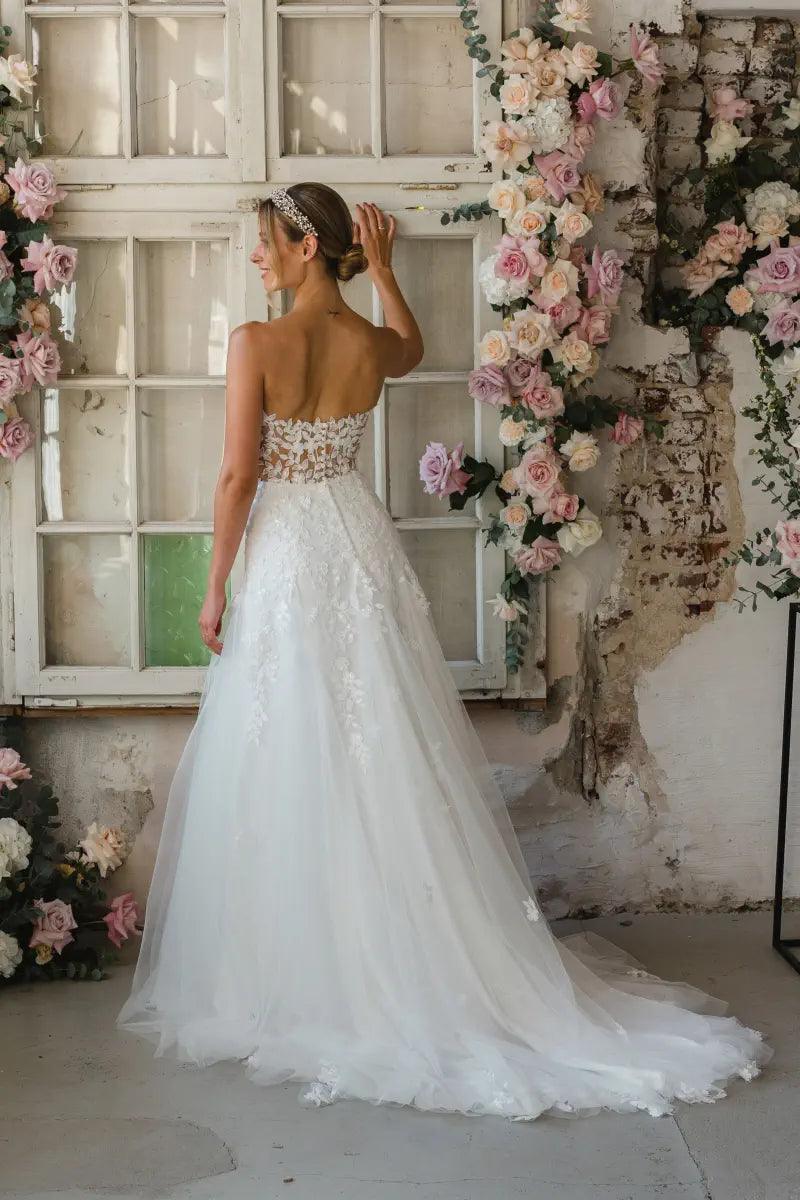 Dieses Hochzeitskleid ist mit haut-/ oder elfenbeinfarbenen Mesh-Farben in der Corsage sowie Futterfarben des Rocks in Elfenbein/ Champagner/ Blush erhältlich.