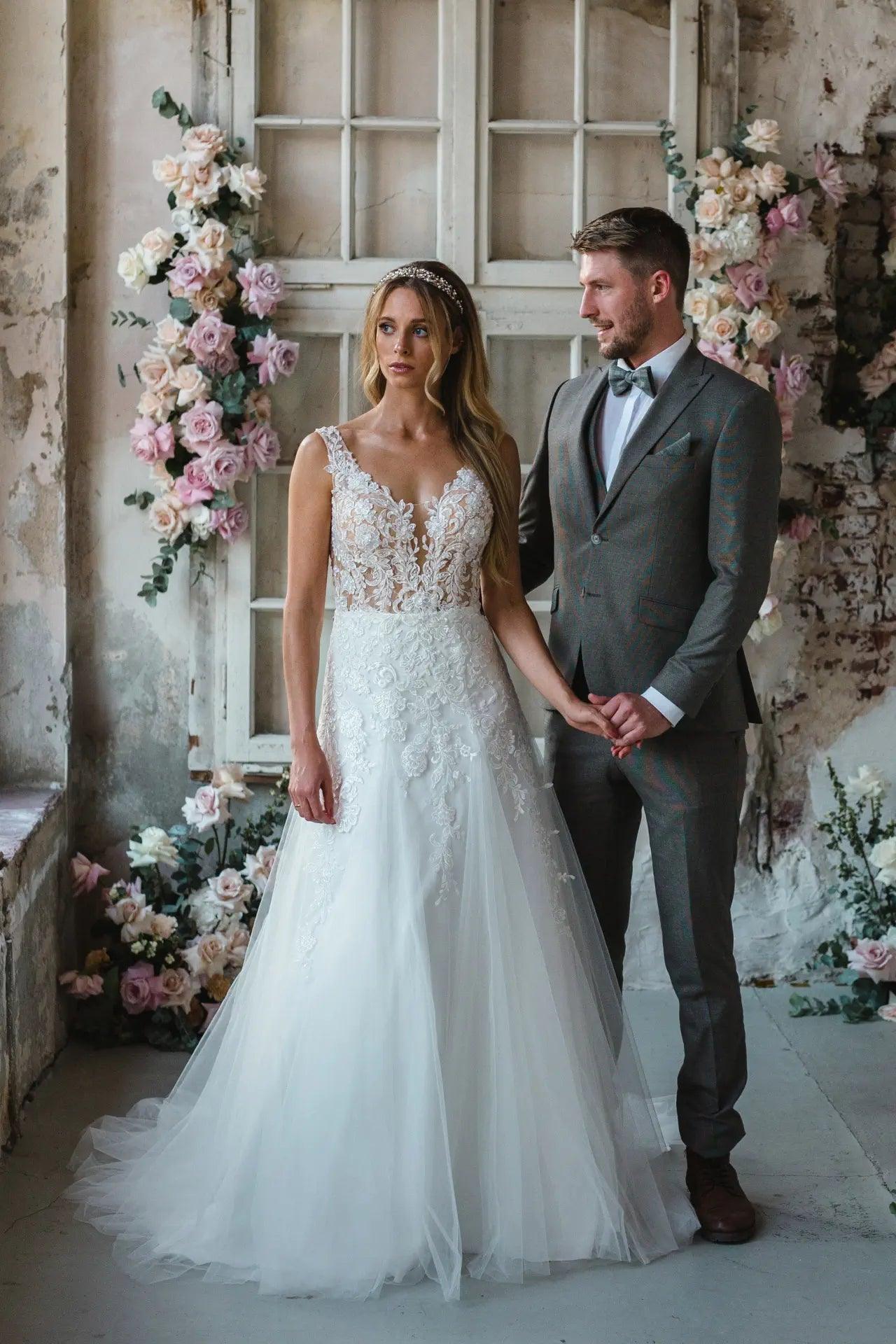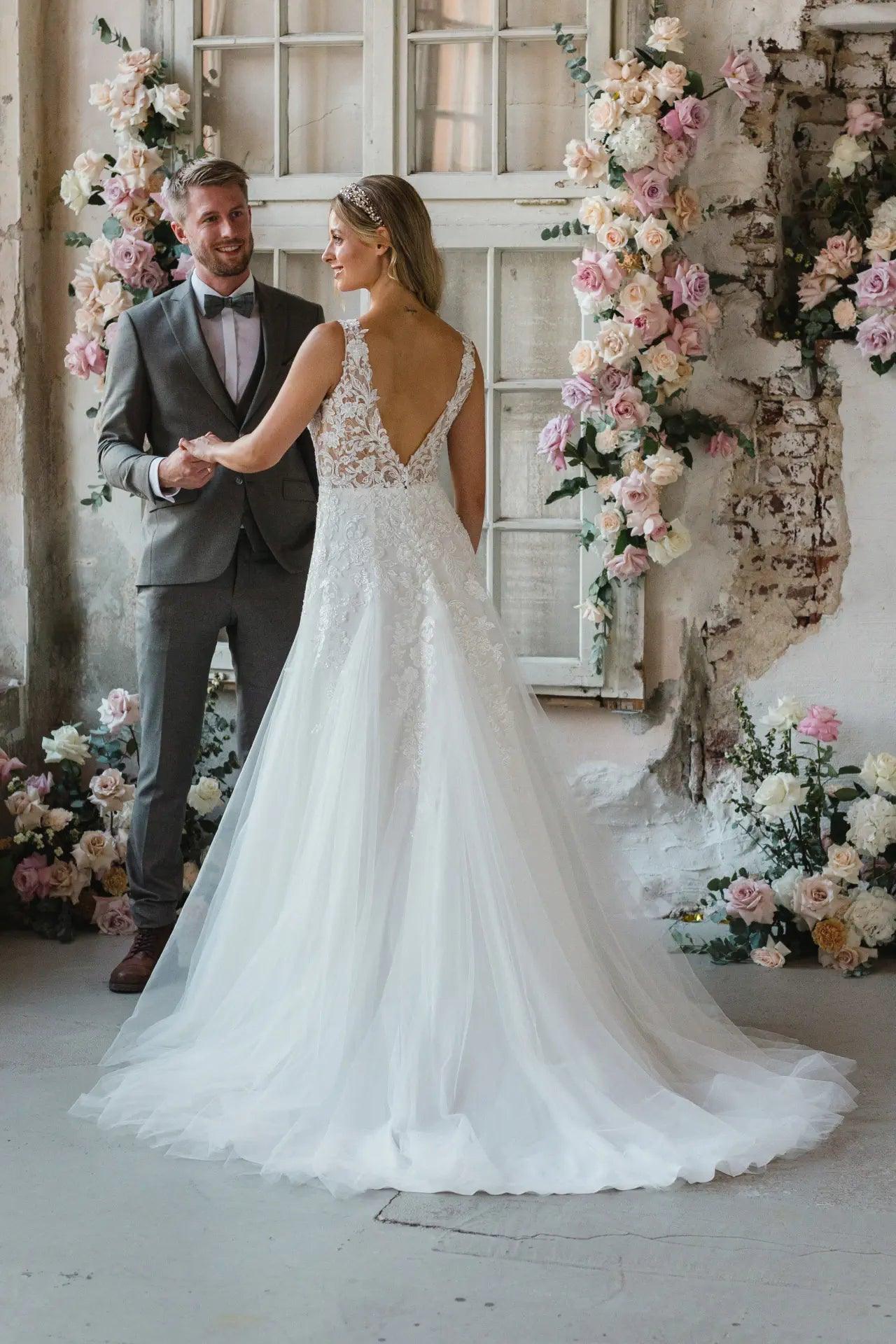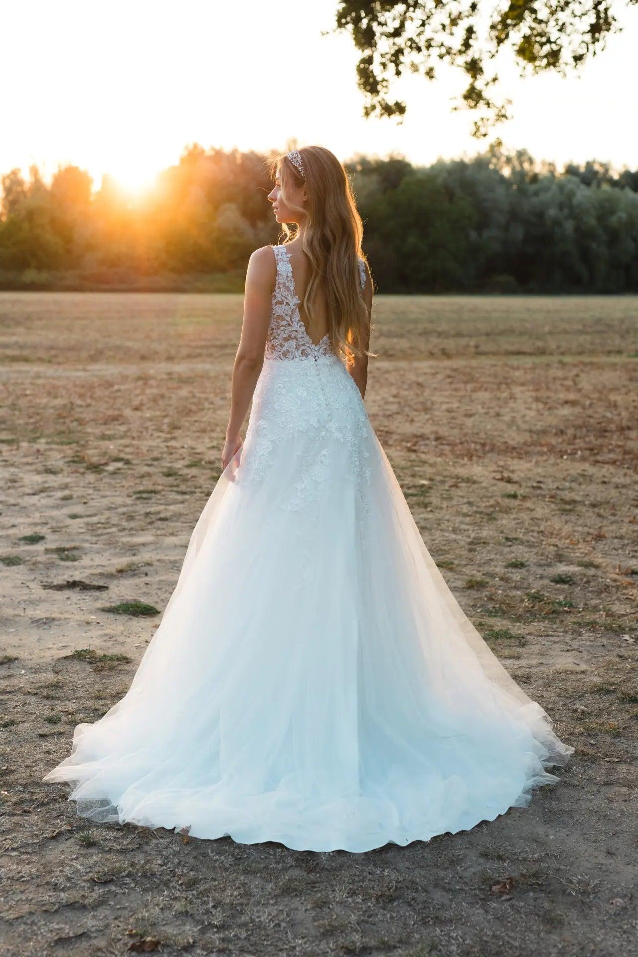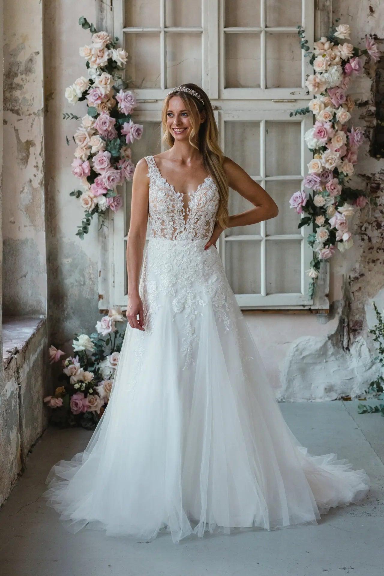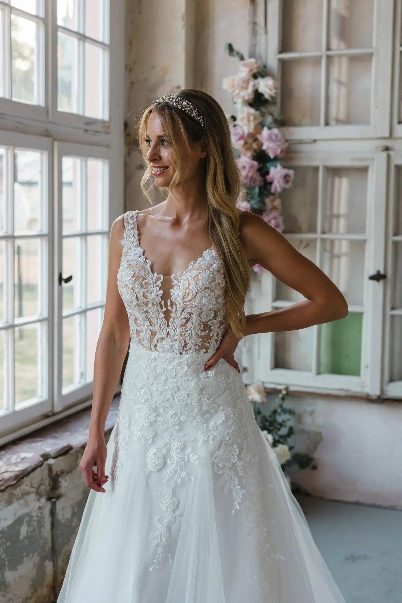 BG23-07 ist eine ausgereifte Mischung aus klassischer und moderner Brautmode und steht auch unter dem Einfluss des Lingerie-Looks. Neben einem zeitlosen Ensemble aus Spitze und Stickereien präsentiert dir diese Bridonista A-Linie auch abnehmbare Ärmel. Unserer Designerin ist es ein Anliegen, die Bedürfnisse und Wünsche der Bräute zu erkennen und sie in den Entstehungsprozess einer Kollektion einfließen zu lassen. Sie haben nach Hochzeitskleidern mit langen Ärmeln gefragt, aber gleichzeitig wollen sich viele Bräute wohlfühlen und sich den ganzen Hochzeitstag lang bewegen können. Genau aus diesem Grund sind die Ärmel fast aller Bridonista-Traumkleider abnehmbar, so dass du dein Traumkleid mit oder ohne Ärmel tragen kannst. Wir finden, du solltest immer die Wahl haben und auf dein Herz hören, wenn es um das Thema lange Ärmel geht. Außerdem ist die Corsage durch verstärkte Stäbchen und Push-up-Cups in Nude mit großer Stabilität ausgestattet, was eine fantastische Passform für alle Größen garantiert. Das charakteristische Merkmal dieses Stils ist die überschnittene Taille, die die weiblichen Kurven perfekt formt.