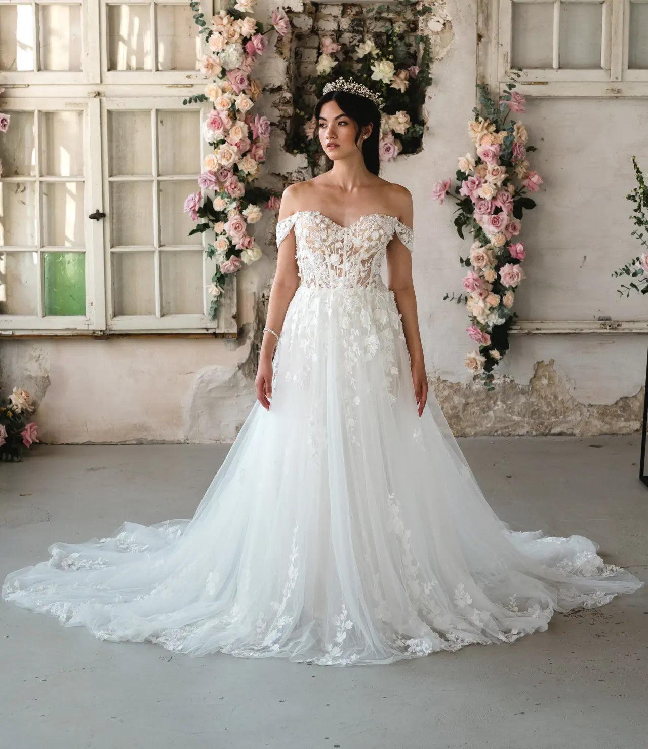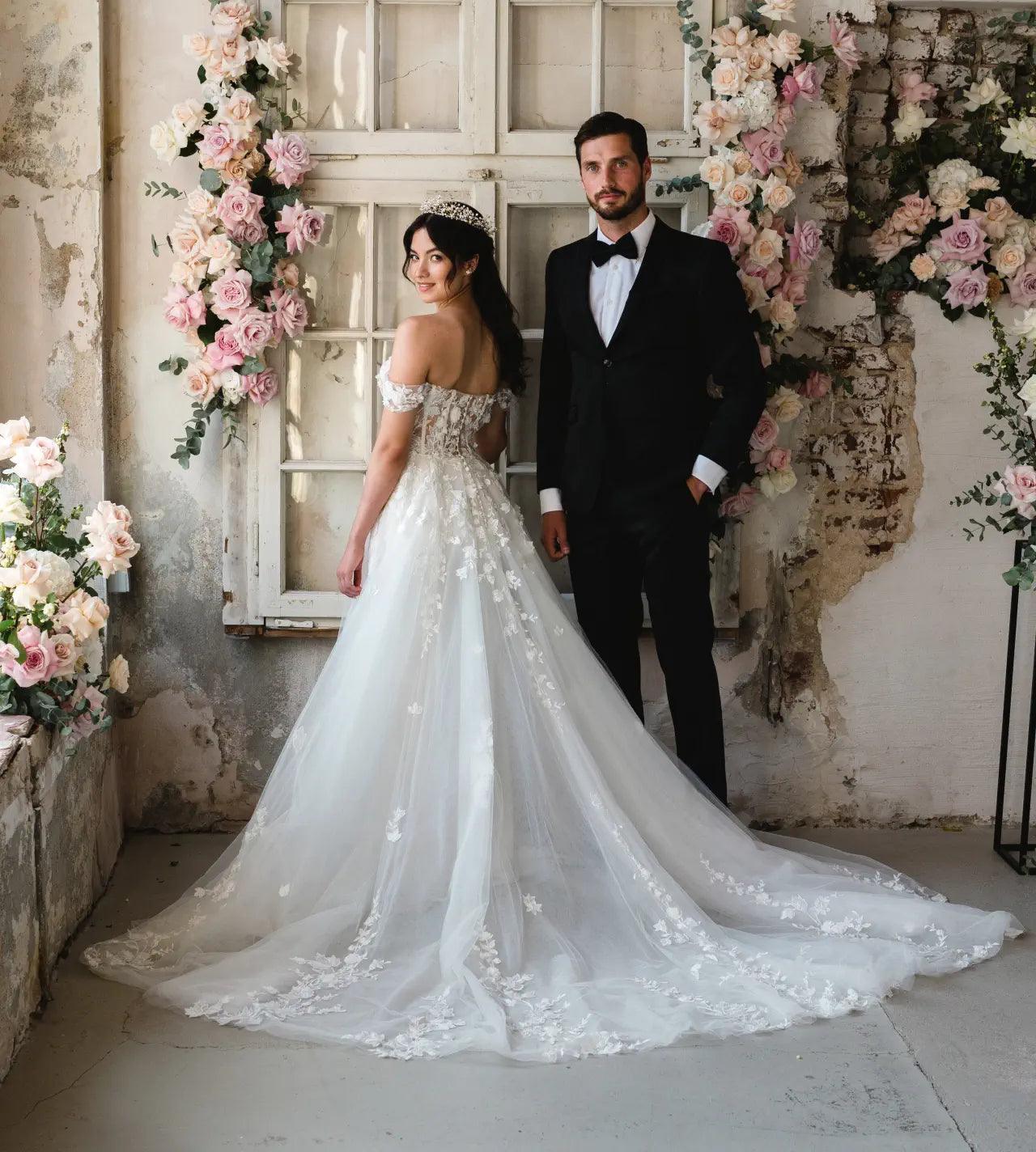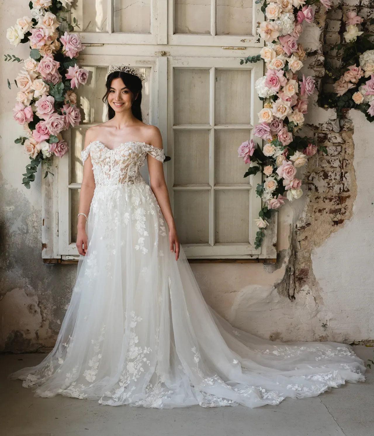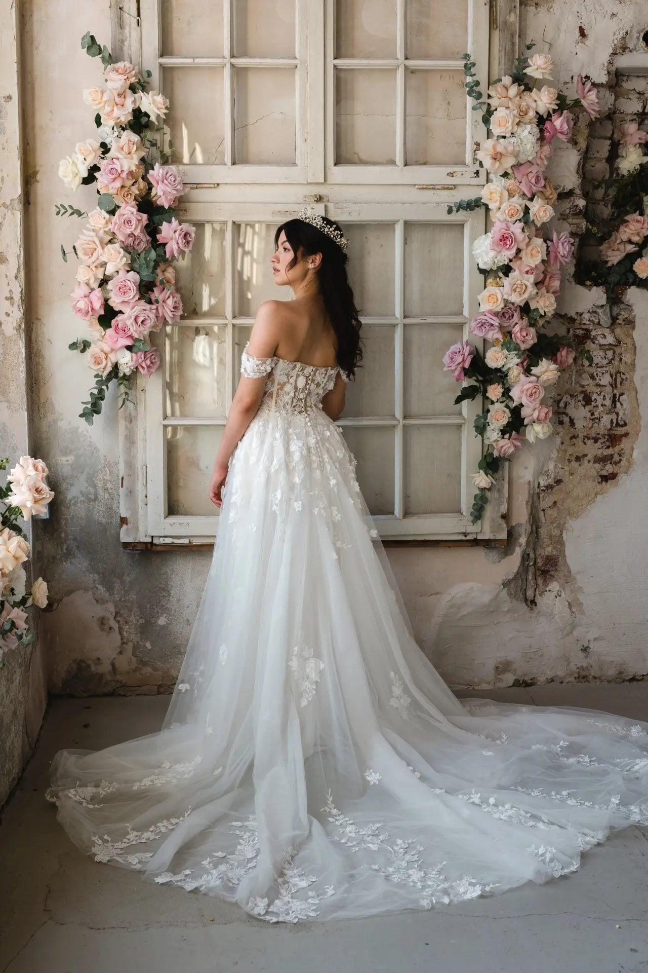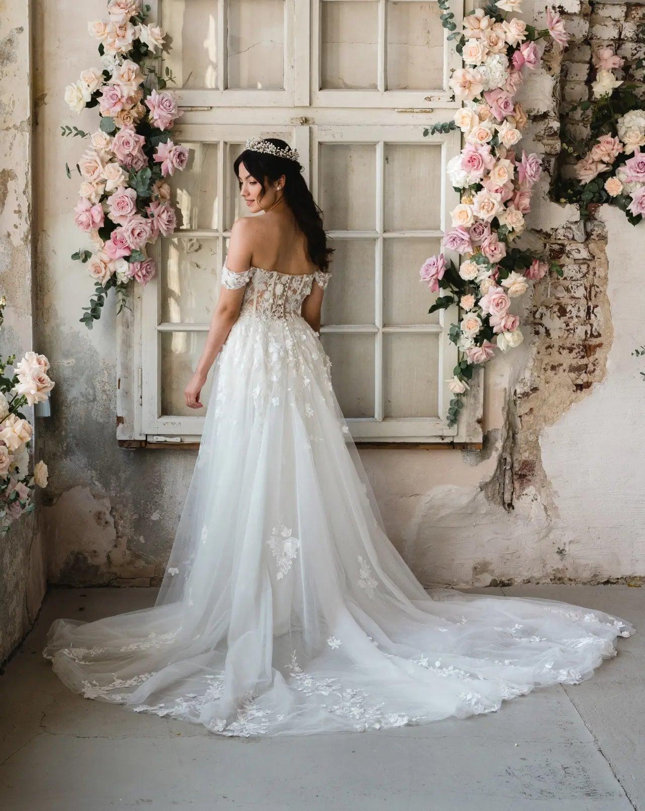 Im Design BG23-09 lernen sich bohemische Vibes und prinzessinnenhafte Attitüde kennen. Das Ergebnis ist eine Harmonie aus romantischer Spitze und klassischer Schneiderei mit einem modernen Twist. Liebe Braut, wenn du verrückt nach 3D-Blumen, Transparenz und Glamour bist, dann buche deinen Brauttermin bei einem Bridonista-Händler und schlüpfe in dieses Traumkleid. Der prinzessinnenhafte Herzchen-Ausschnitt wird durch Träger, die über die Schultern fallen, gekonnt ergänzt. Natürlich kannst du die Träger jederzeit abnehmen oder sie wieder an der Corsage befestigen, ganz wie du willst. Außerdem hat die Corsage dank der verstärkten Stäbchen und Push-up-Cups in Nude eine hohe Stabilität, die eine fantastische Passform für alle Größen garantiert. Eine wunderschöne Komposition aus feiner Spitze, Blattspitze und 3D-Blumen schmückt die Corsage und verläuft in den Rock und die Schleppe.