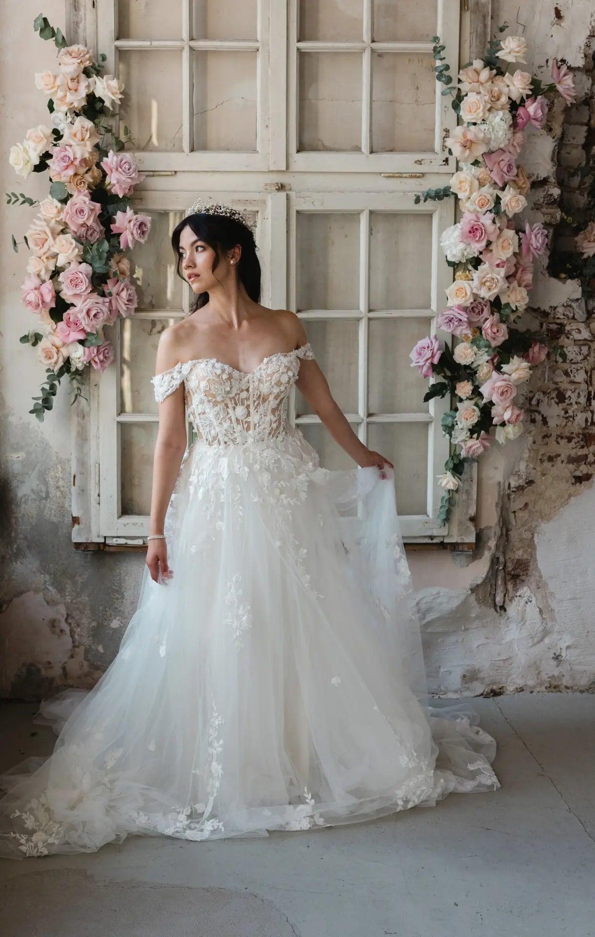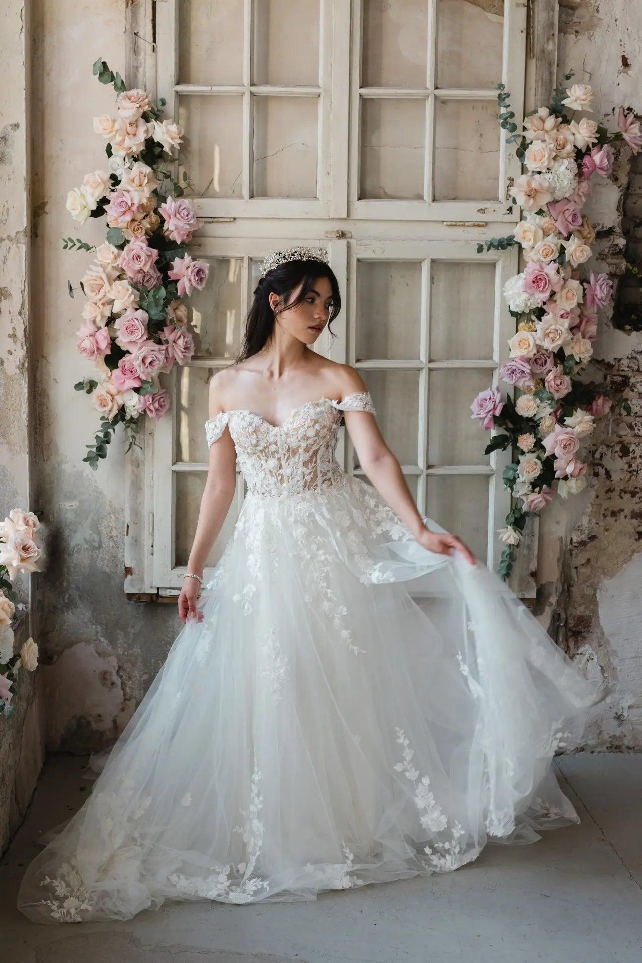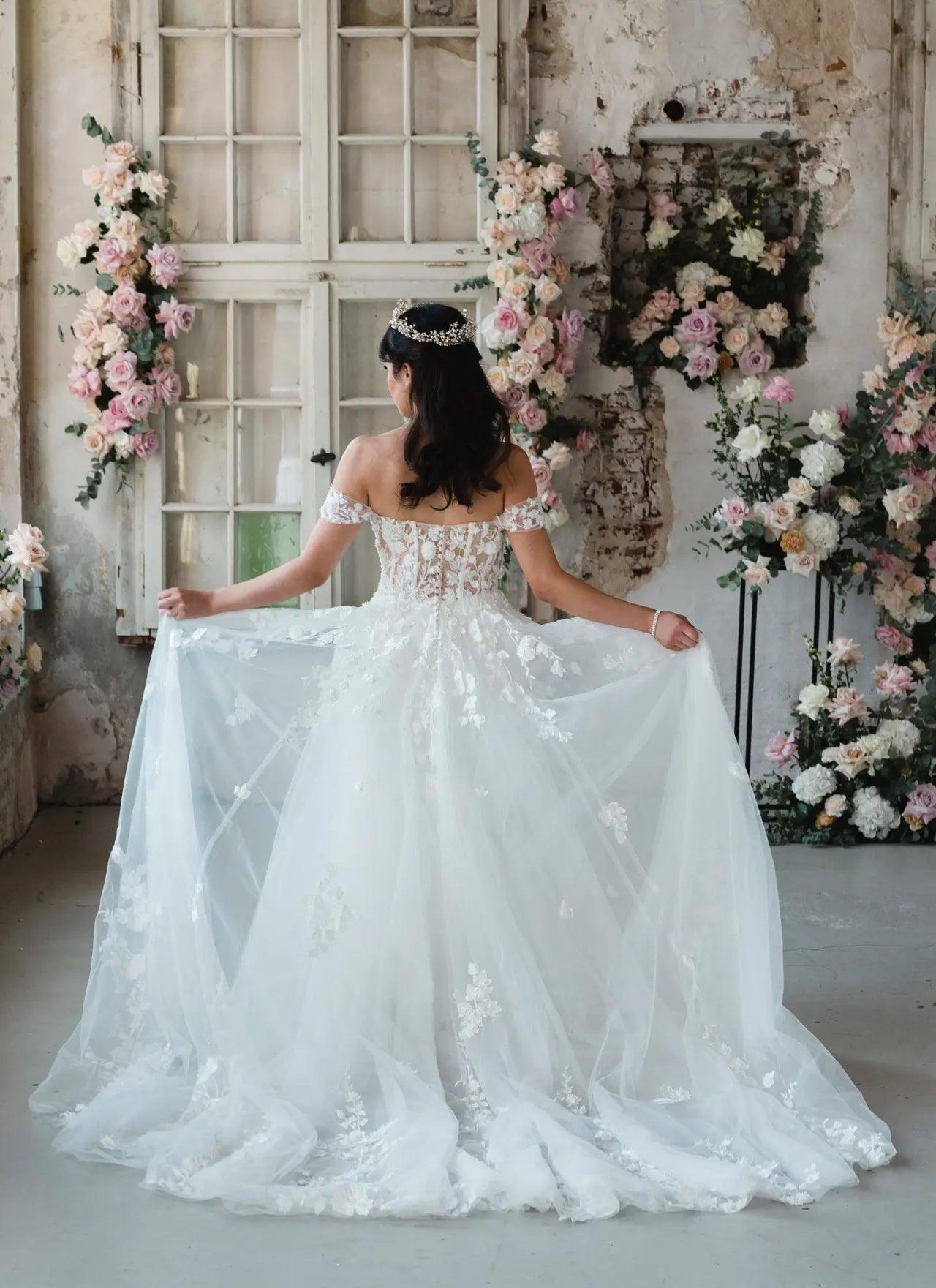 Ein herausragendes Merkmal von Style BG23-09 ist die Freiheit, den Rock als enge oder weite Passform zu wählen. Wenn du dir einen Blumentraum mit feiner Figurbetonung wünschst, ist der Unterrock in einem Fit-and-Flare-Schnitt geschnitten. Durch den darüber liegenden Tüll in A-Linienform sieht man diese Figurbetonung erst auf den zweiten Blick, wenn du dich bewegst. Wenn dir aber Komfort wichtig ist und du nicht eingeengt werden möchtest, empfehlen wir dir, dieses Traumkleid mit einem klassischen weiten Unterrock zu probieren.