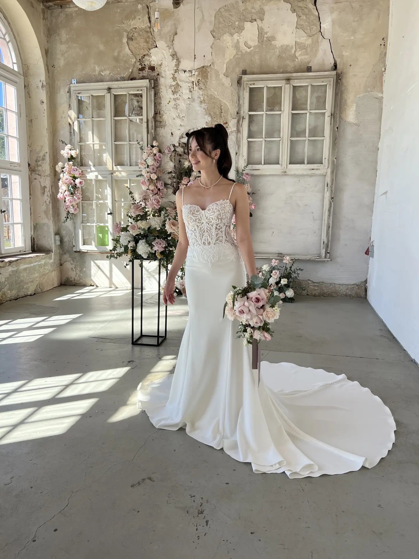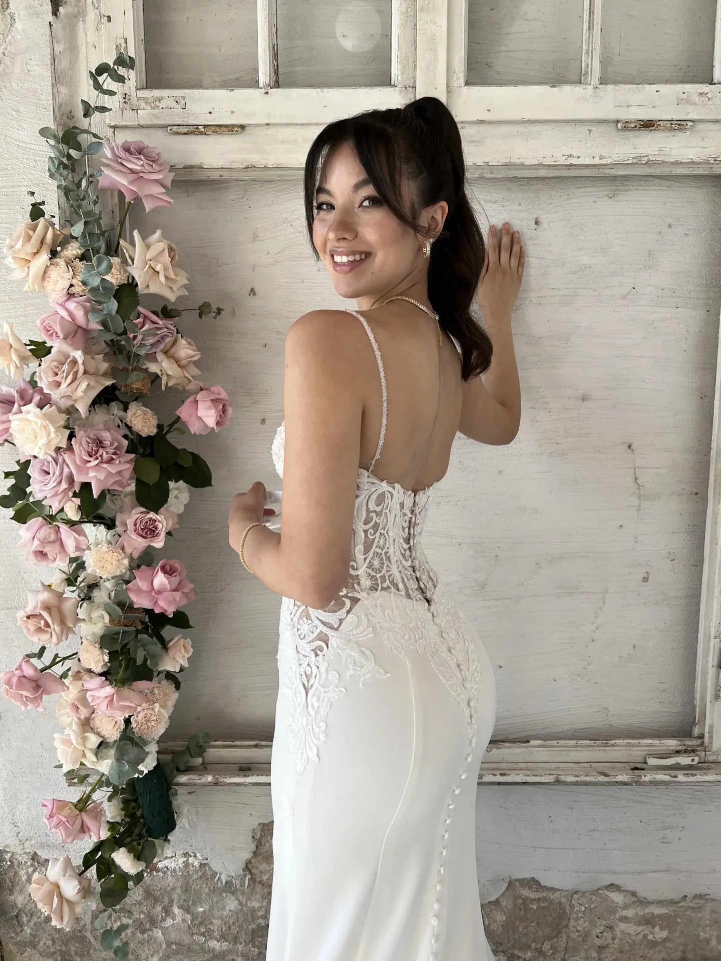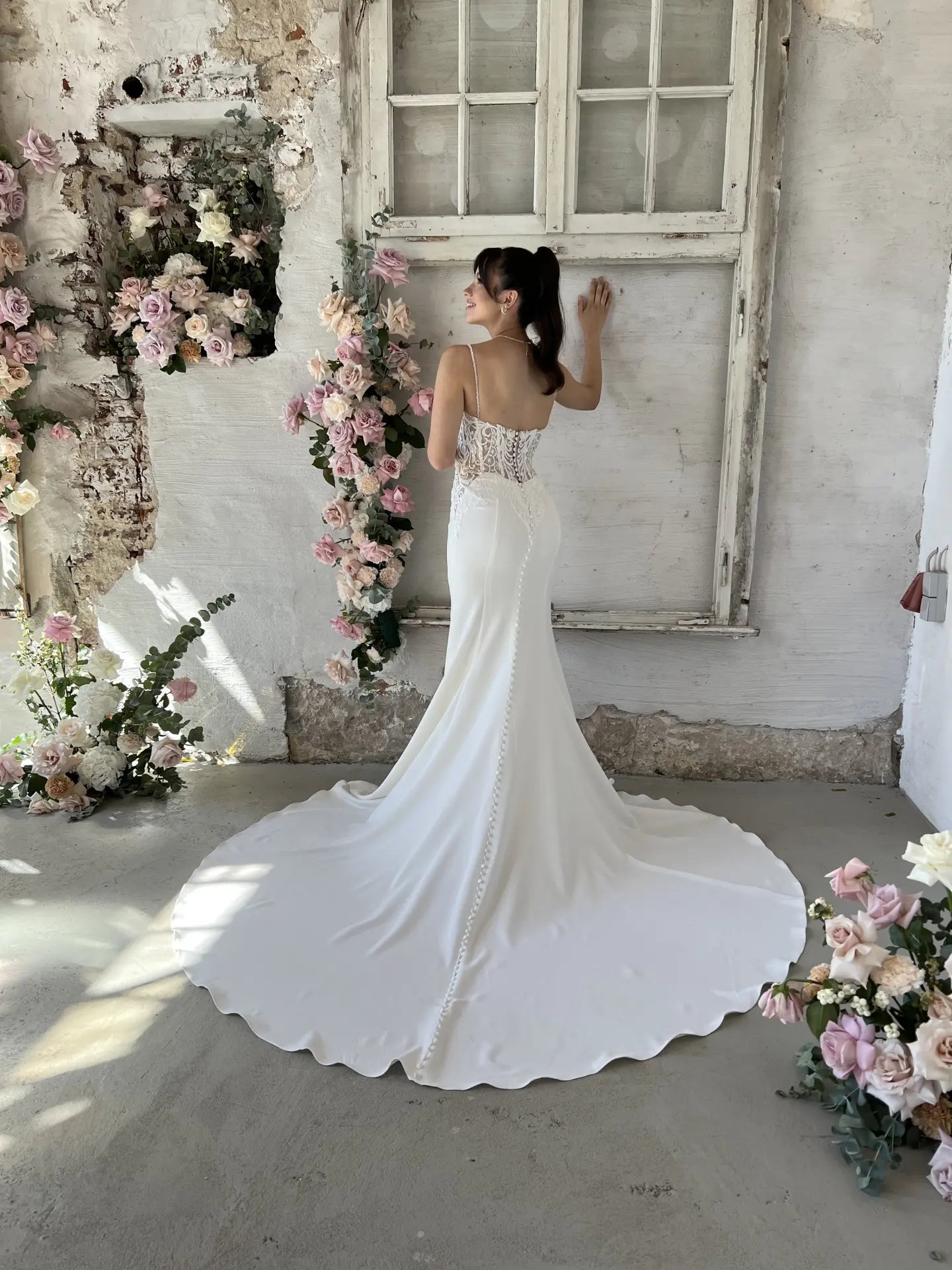 Willst du eine Göttin sein, wenn du zum Traualtar schreitest? Das Modell BG23-14 ist der Inbegriff von Glamour und zeitloser Eleganz. Die Corsage kombiniert moderne Spitzen mit Kristallperlen und einem femininen Hauch von Zartheit. Wir lieben die Komposition aus abstrakten und klassischen Details; während schimmernde Perlen und seitliche Ausschnitte für feine Sexyness sorgen, verleihen stoffbesetzte Knöpfe dem schicken und minimalistischen Rock eine zeitlose Eleganz. Wie alle Brautkleider von Bridonista ist auch die Corsage dieses Modells durch verstärkte Stäbchen und nudefarbene Push-up-Cups sehr stabil, was eine fantastische Passform für alle Größen garantiert. Gemacht für die moderne Braut mit zeitloser Anmut und Stil, wird dieses atemberaubende Fit-and-Flare Brautkleid dafür sorgen, dass du dich verzaubern lässt?