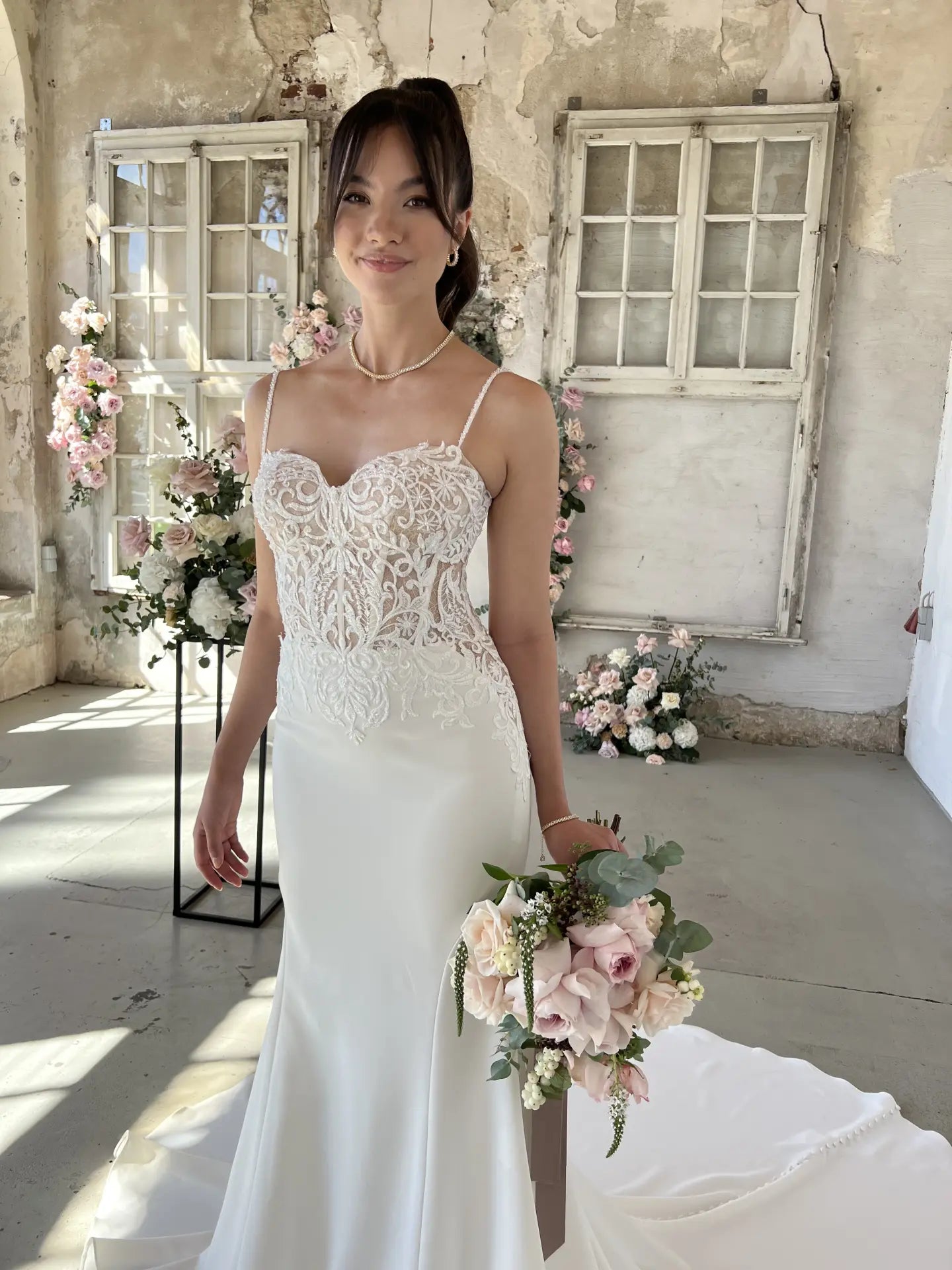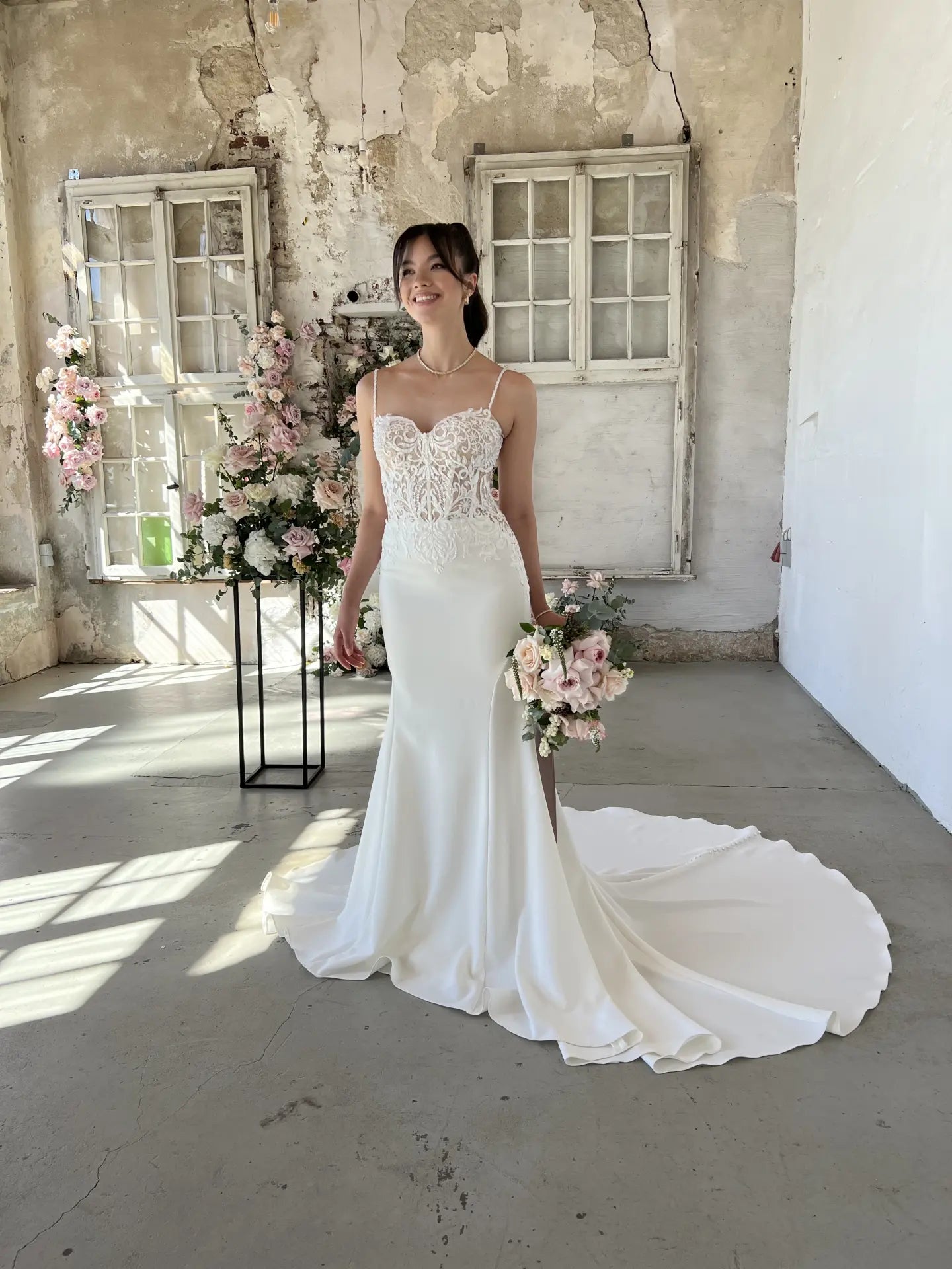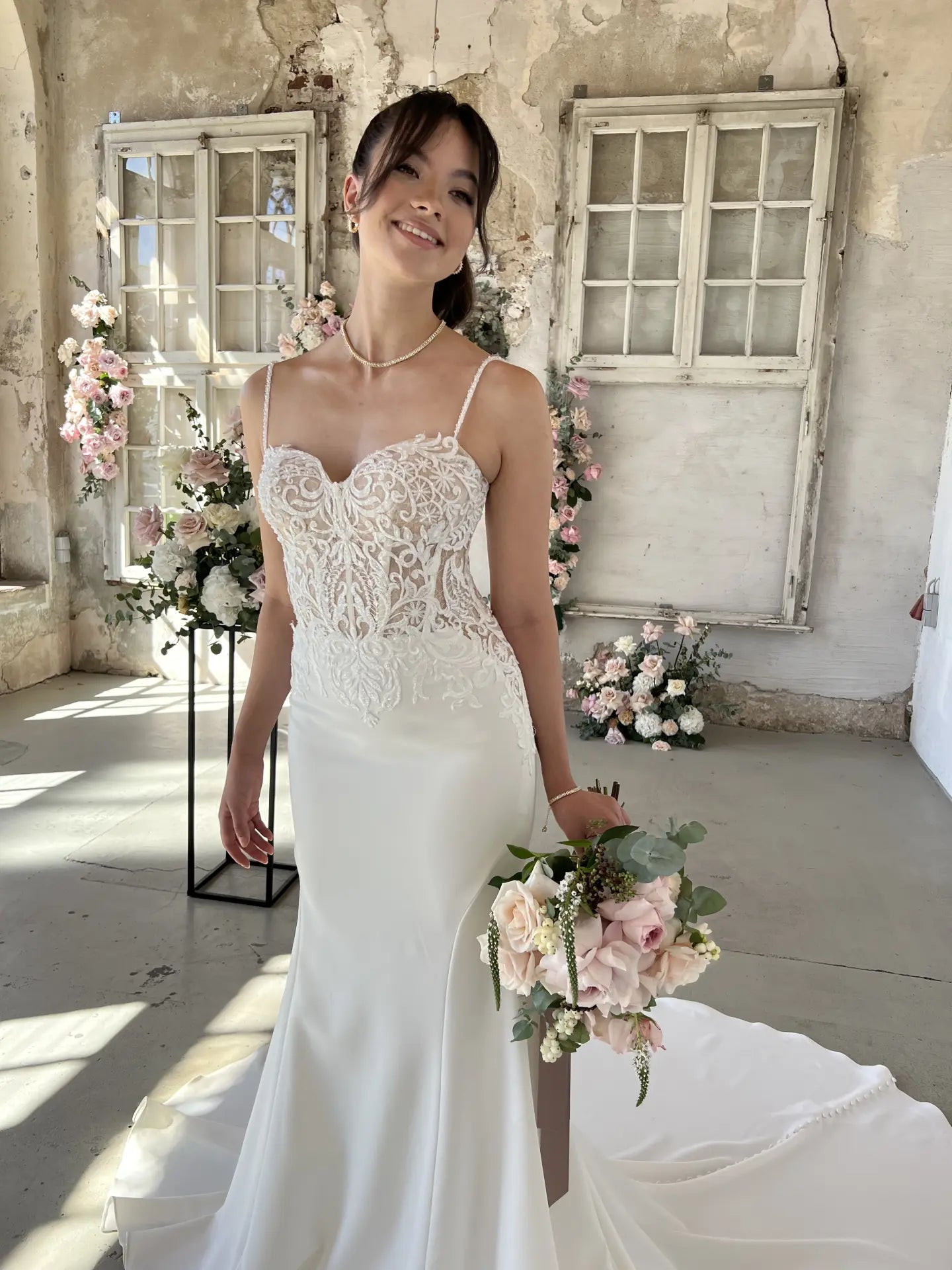 Willst du eine Göttin sein, wenn du zum Traualtar schreitest? Das Modell BG23-14 ist der Inbegriff von Glamour und zeitloser Eleganz. Die Corsage kombiniert moderne Spitzen mit Kristallperlen und einem femininen Hauch von Zartheit. Wir lieben die Komposition aus abstrakten und klassischen Details; während schimmernde Perlen und seitliche Ausschnitte für feine Sexyness sorgen, verleihen stoffbesetzte Knöpfe dem schicken und minimalistischen Rock eine zeitlose Eleganz. Wie alle Brautkleider von Bridonista ist auch die Corsage dieses Modells durch verstärkte Stäbchen und nudefarbene Push-up-Cups sehr stabil, was eine fantastische Passform für alle Größen garantiert. Gemacht für die moderne Braut mit zeitloser Anmut und Stil, wird dieses atemberaubende Fit-and-Flare Brautkleid dafür sorgen, dass du dich verzaubern lässt?