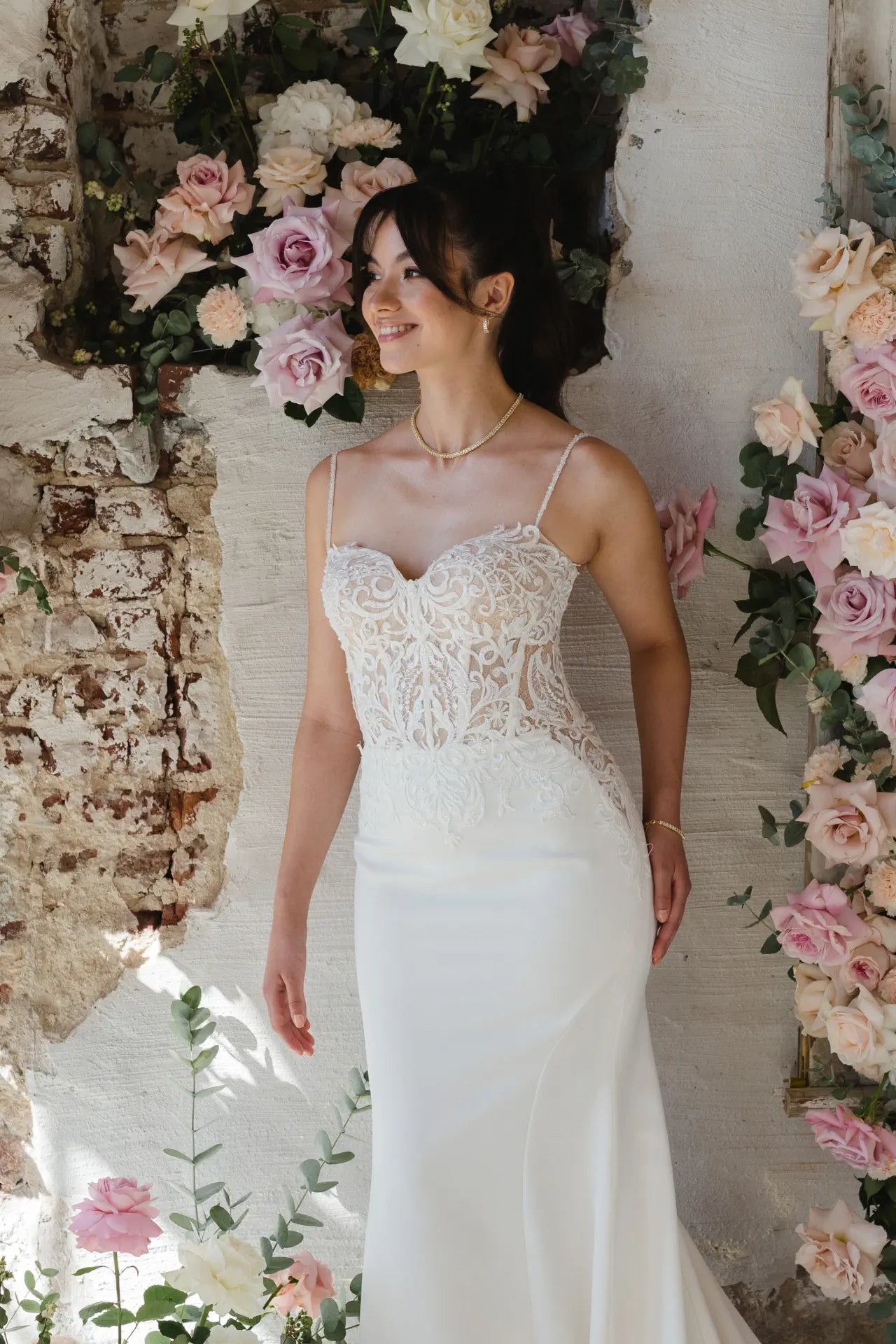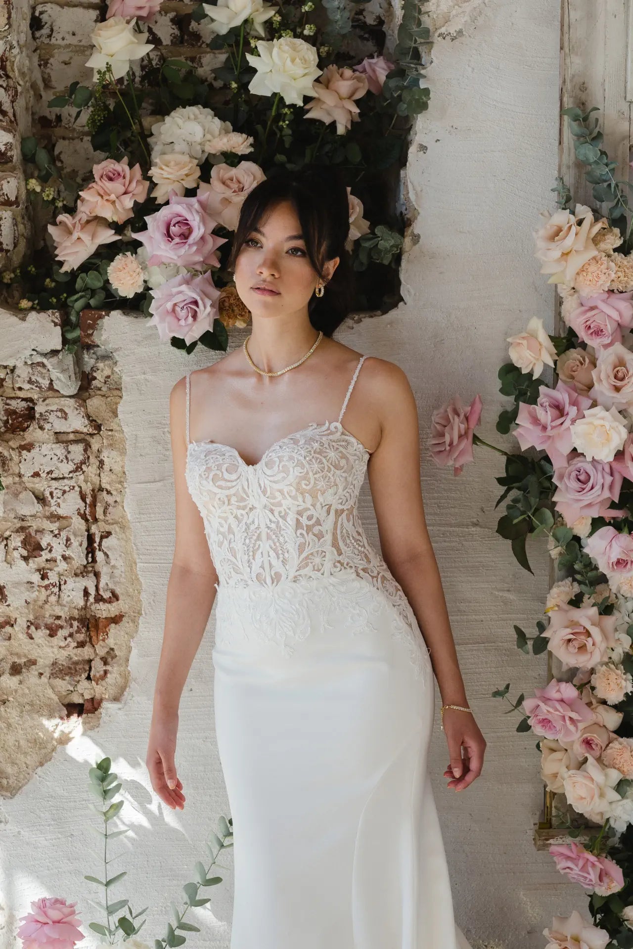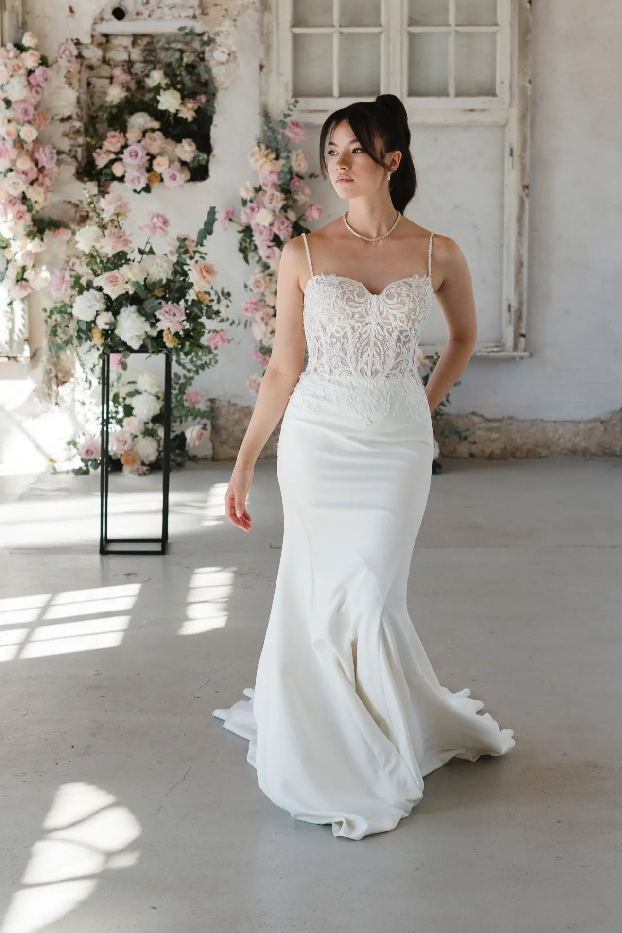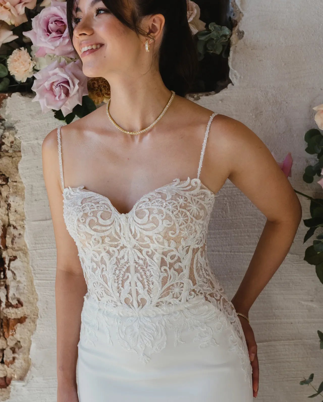 Dieses Hochzeitskleid ist mit haut- oder elfenbeinfarbenen Mesh-Einsätzen in der Corsage und seitlichen Ausschnitten erhältlich.