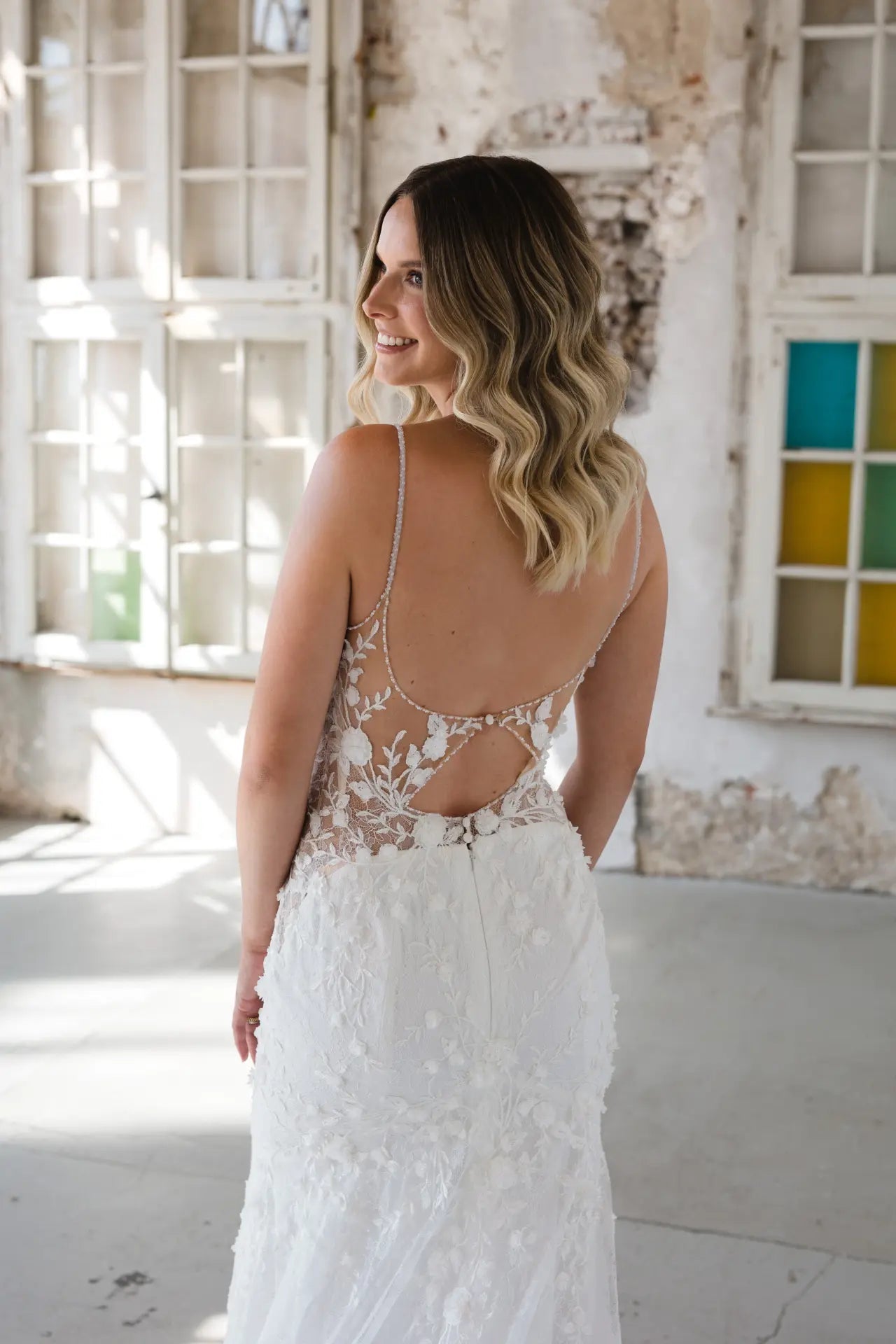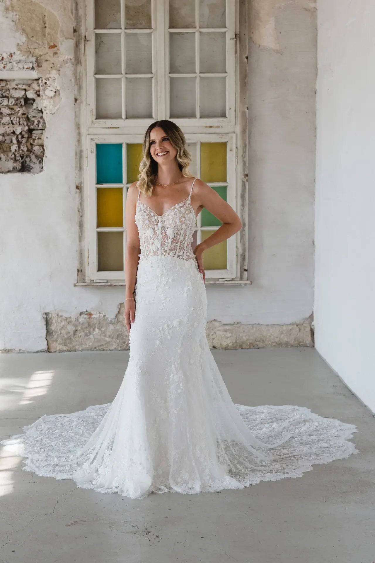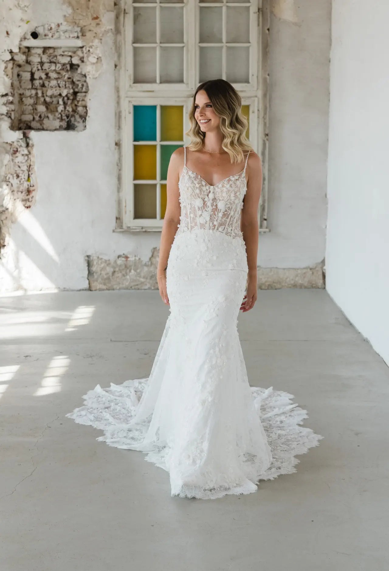 3D-Elemente liegen im Trend, also hat unsere Designerin natürlich einen bezaubernden Fit-and-Flare-Schnitt mit Blumen entworfen. Das Hochzeitskleid BG23-17 ist eine feine Komposition aus feiner französischer Chantilly-Spitze und organisch platzierten 3D-Blumen. Die Spaghetti-Träger und die Streublumen sind von Hand mit Perlen bestickt, die für einen edlen und doch dezenten Glanz sorgen. Die Corsage ist im Lingerie-Look geschneidert und bietet nicht nur Komfort und Sicherheit, sondern verleiht BG23-17 auch eine architektonische Raffinesse. Wir lieben die Komposition aus Struktur, seitlichen Ausschnitten, femininen Körperbetonungen und romantischen 3D-Blumen. Ein besonderer Blickfang ist der tiefe Schlüssellochrücken und die muschelförmige Schleppe, die für ein einzigartiges Design sorgen. Mach dich bereit, wunderschön und selbstbewusst auf deinen zukünftigen Ehemann zuzugehen; buche jetzt einen Termin bei deinem Bridonista-Händler und verliebe dich Hals über Kopf in diesen Brautlook.