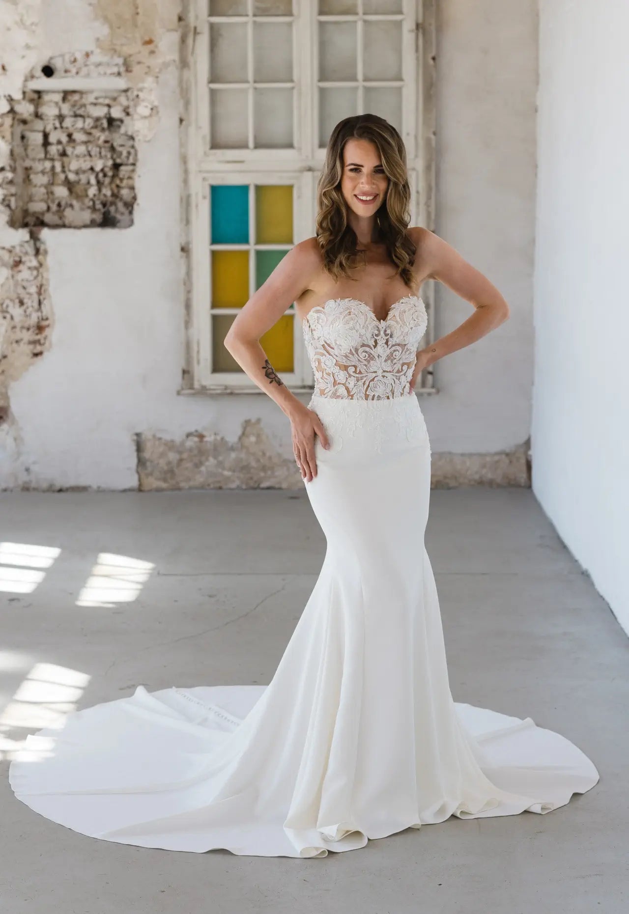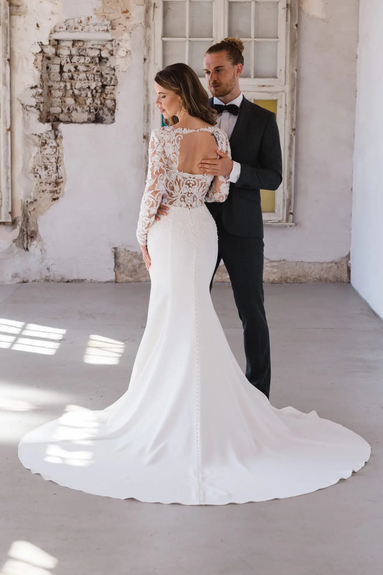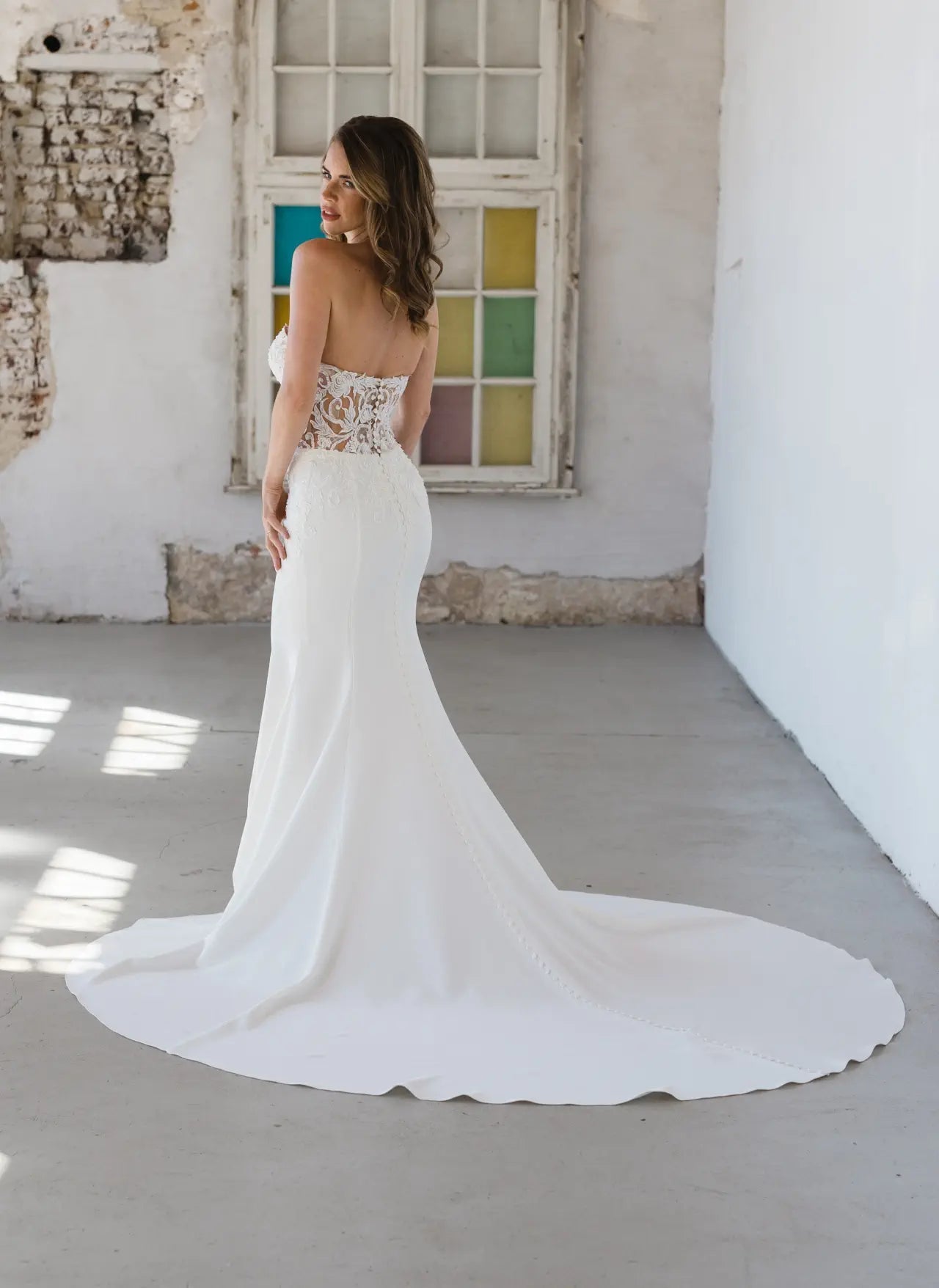 Enge Passform und sexy Transparenz lernen elegante Materialien kennen - BG23-22 wurde für die glamouröse Braut entworfen, die weiß, was sie will. Dieser atemberaubende Fit-and-Flare-Schnitt kombiniert verschiedene Couture-Elemente zu einer einzigartigen Komposition aus moderner Spitze und luxuriösem Krepp. Der anschmiegsame und dennoch bequeme Schnitt betont die weiblichen Kurven und hebt die Corsage hervor; diese sorgt nicht nur für einen verführerischen Look, sondern betont auch die Taille und lenkt die Aufmerksamkeit auf die ausgefallene rosa Spitze. Die Spitze ist von Hand mit Kristallen und Pailletten bestickt, was dem Hochzeitskleid einen edlen Glanz verleiht. Wandelbarkeit steht bei Bridonista an erster Stelle, deshalb überzeugt dieser Stil auch mit einer unsichtbaren Überraschung. Der lange Ärmel inklusive Schlüsselloch im Rücken kann aufgeknöpft werden, so dass der Look im Handumdrehen schulterfrei getragen werden kann. Außerdem präsentiert die Corsage dank verstärkter Stege und Push-up-Cups in Nude eine tolle Stabilität und sorgt für eine fantastische Passform bei allen Größen. Die bestickte rosa Spitze geht organisch über die Corsage in den Crêpe-Rock über, wie in einem Rosengarten; diese natürliche Platzierung schafft einen weichen, femininen Übergang. Der Rock aus hochwertigem Crêpe überzeugt durch seinen Tragekomfort und lässt durch seine Schlichtheit Raum für die Corsage, um zu glänzen. Ein klassisches Highlight sind die mit Crêpe überzogenen Zierknöpfe, die über den Rücken und den Rock bis in die Schleppe verlaufen.