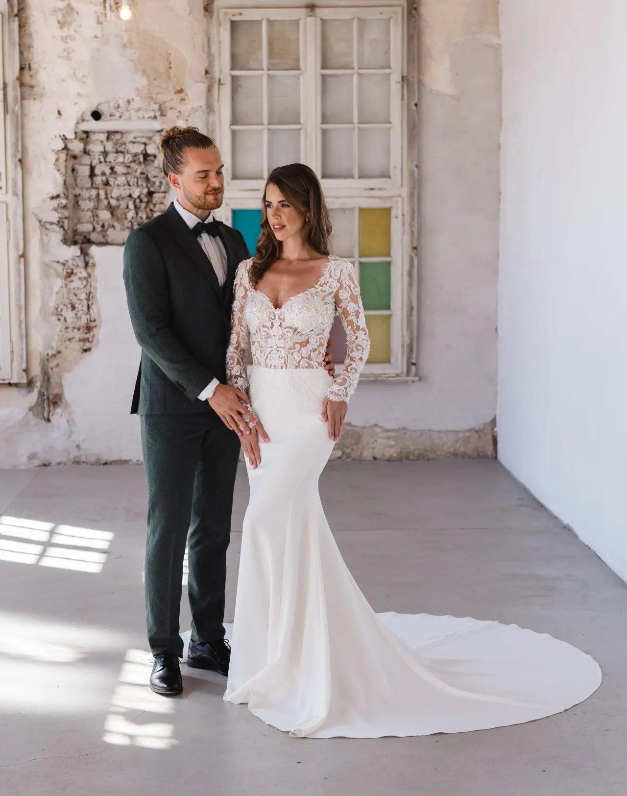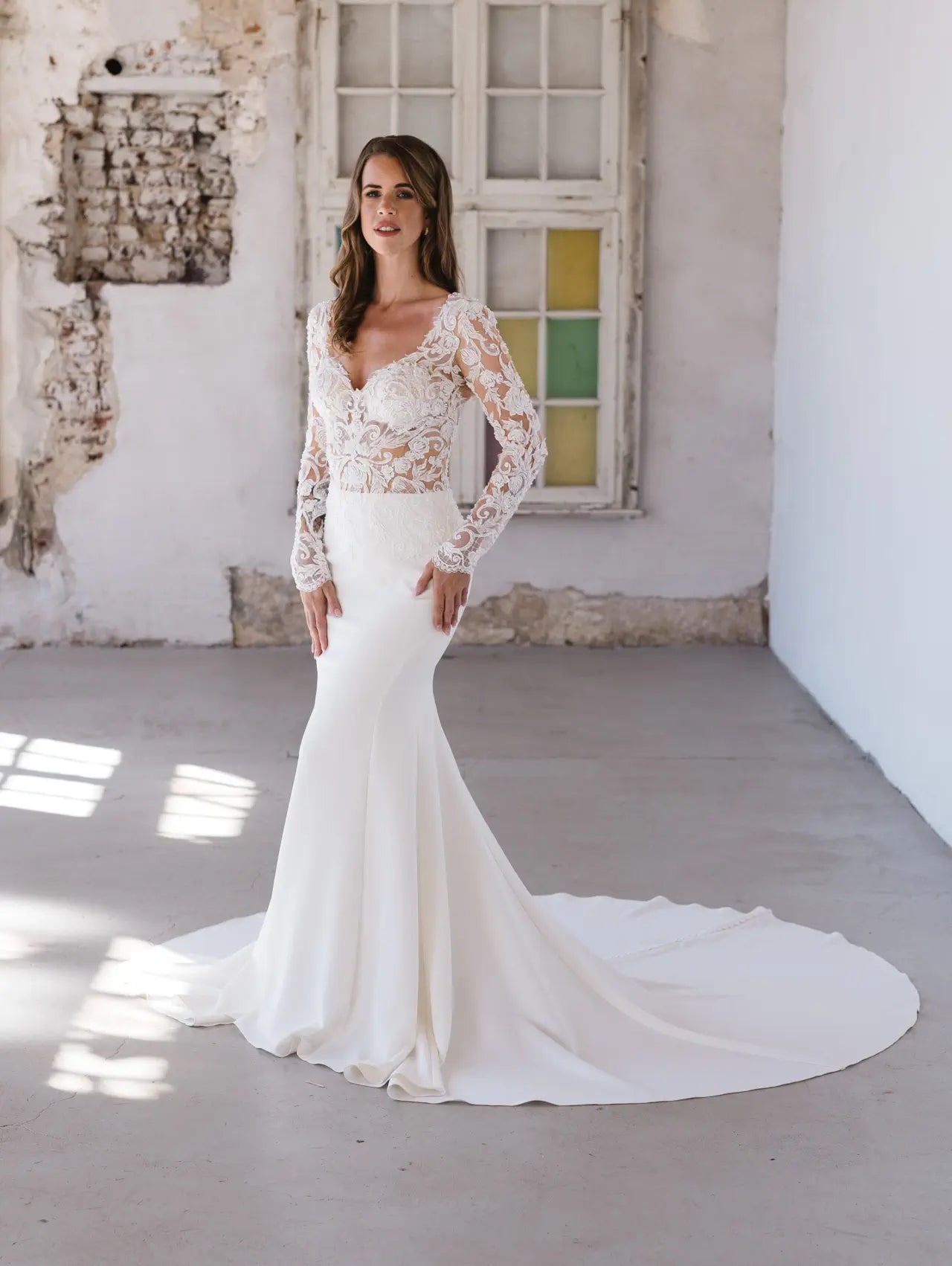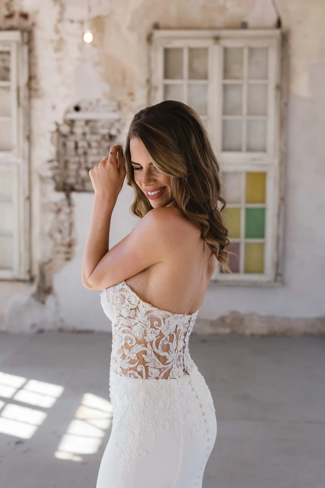 Enge Passform und sexy Transparenz lernen elegante Materialien kennen - BG23-22 wurde für die glamouröse Braut entworfen, die weiß, was sie will. Dieser atemberaubende Fit-and-Flare-Schnitt kombiniert verschiedene Couture-Elemente zu einer einzigartigen Komposition aus moderner Spitze und luxuriösem Krepp. Der anschmiegsame und dennoch bequeme Schnitt betont die weiblichen Kurven und hebt die Corsage hervor; diese sorgt nicht nur für einen verführerischen Look, sondern betont auch die Taille und lenkt die Aufmerksamkeit auf die ausgefallene rosa Spitze. Die Spitze ist von Hand mit Kristallen und Pailletten bestickt, was dem Hochzeitskleid einen edlen Glanz verleiht. Wandelbarkeit steht bei Bridonista an erster Stelle, deshalb überzeugt dieser Stil auch mit einer unsichtbaren Überraschung. Der lange Ärmel inklusive Schlüsselloch im Rücken kann aufgeknöpft werden, so dass der Look im Handumdrehen schulterfrei getragen werden kann. Außerdem präsentiert die Corsage dank verstärkter Stege und Push-up-Cups in Nude eine tolle Stabilität und sorgt für eine fantastische Passform bei allen Größen. Die bestickte rosa Spitze geht organisch über die Corsage in den Crêpe-Rock über, wie in einem Rosengarten; diese natürliche Platzierung schafft einen weichen, femininen Übergang. Der Rock aus hochwertigem Crêpe überzeugt durch seinen Tragekomfort und lässt durch seine Schlichtheit Raum für die Corsage, um zu glänzen. Ein klassisches Highlight sind die mit Crêpe überzogenen Zierknöpfe, die über den Rücken und den Rock bis in die Schleppe verlaufen.
