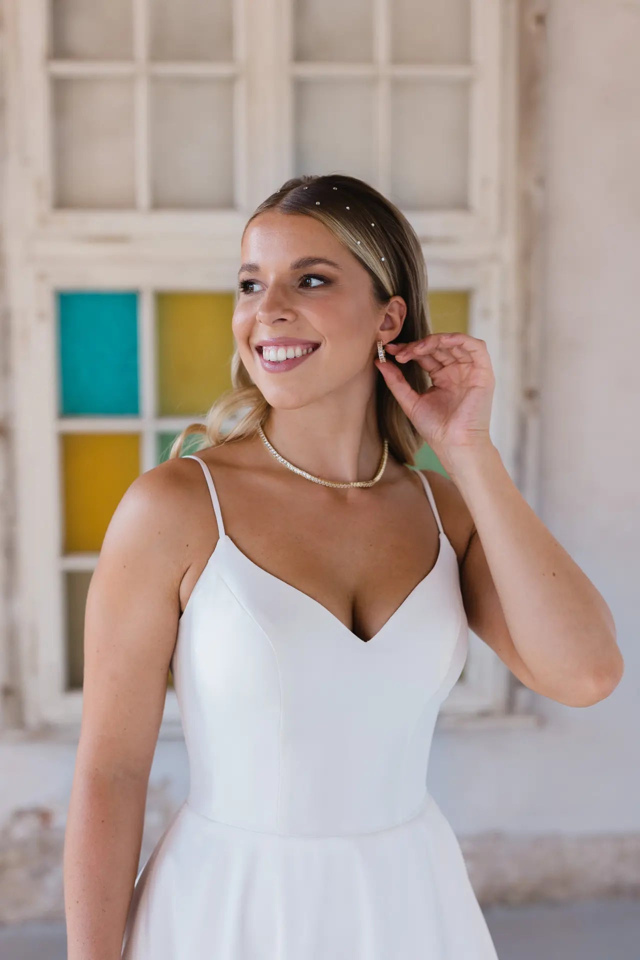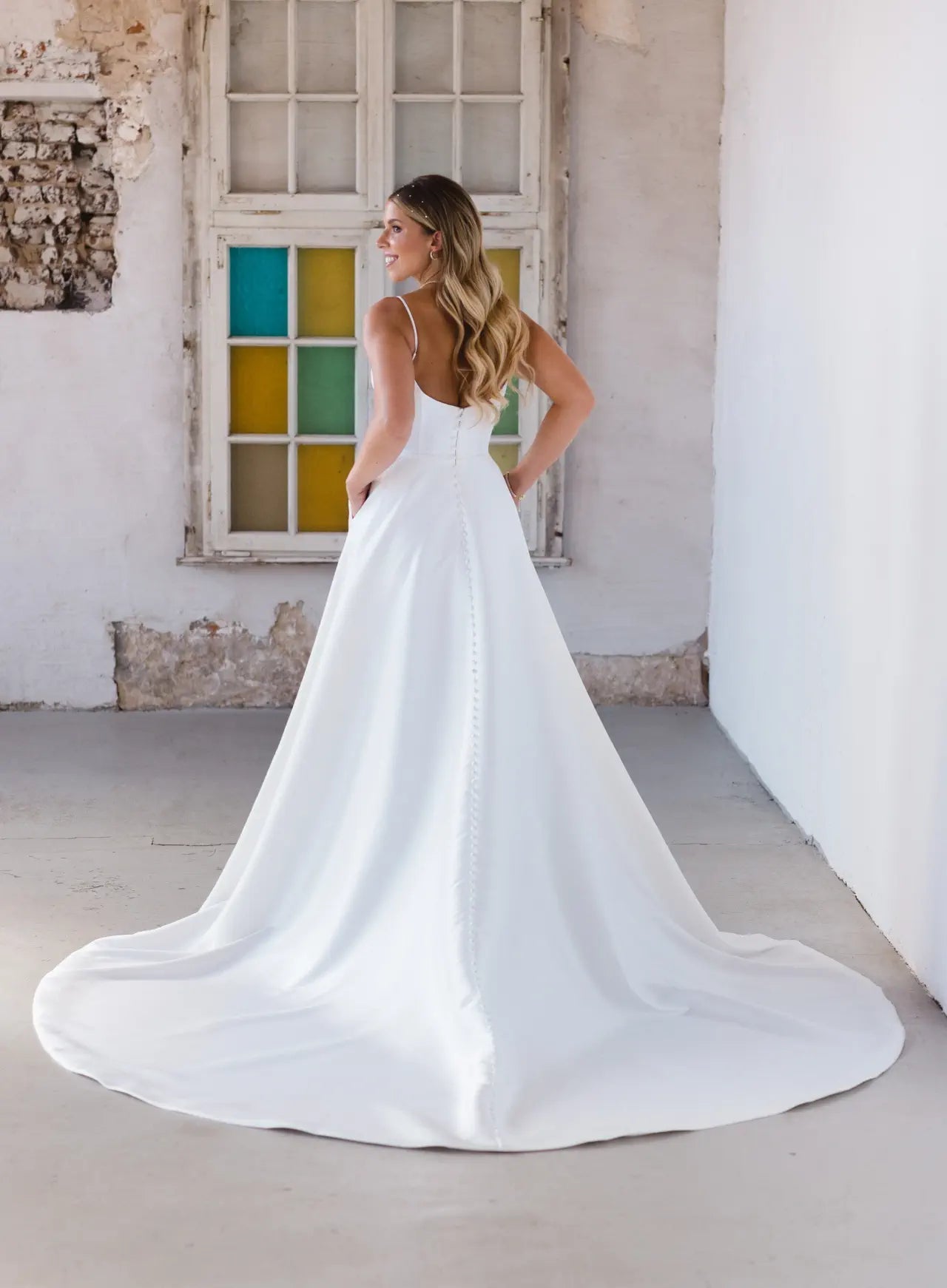 Du willst an deinem besonderen Tag königlich aussehen? Dann möchten wir dir das Modell BG23-23 vorstellen. Diese bezaubernde A-Linie aus Mikado-Seide besticht durch ihren schlichten Schnitt und das einfache, aber elegante Design. Bei diesem Traumkleid wurde besonders auf die kleinen Details geachtet: Die feinen Spaghettiträger liegen sanft auf den Schultern, der feminine V-Ausschnitt zaubert ein wunderschönes Dekolleté und die mit Stoff besetzten Zierknöpfe verlaufen vom runden Rückenausschnitt bis zur langen Schleppe. Die solide Corsage garantiert eine hohe Stabilität und betont die Taille besonders. Der wunderschöne und voluminöse Tellerrock sorgt für einen königlichen Auftritt. Ein besonderes Highlight sind die eingenähten Taschen, in denen das eine oder andere Taschentuch für deine Freudentränen Platz findet.