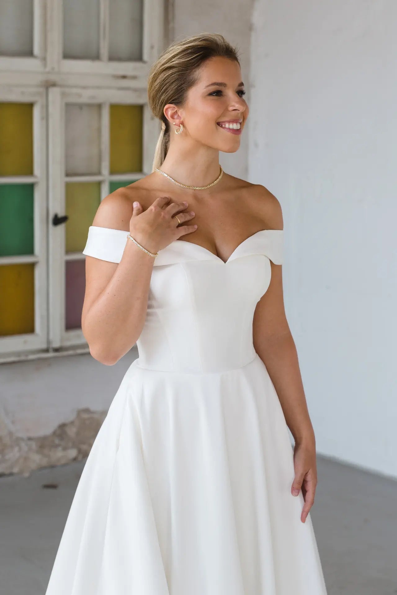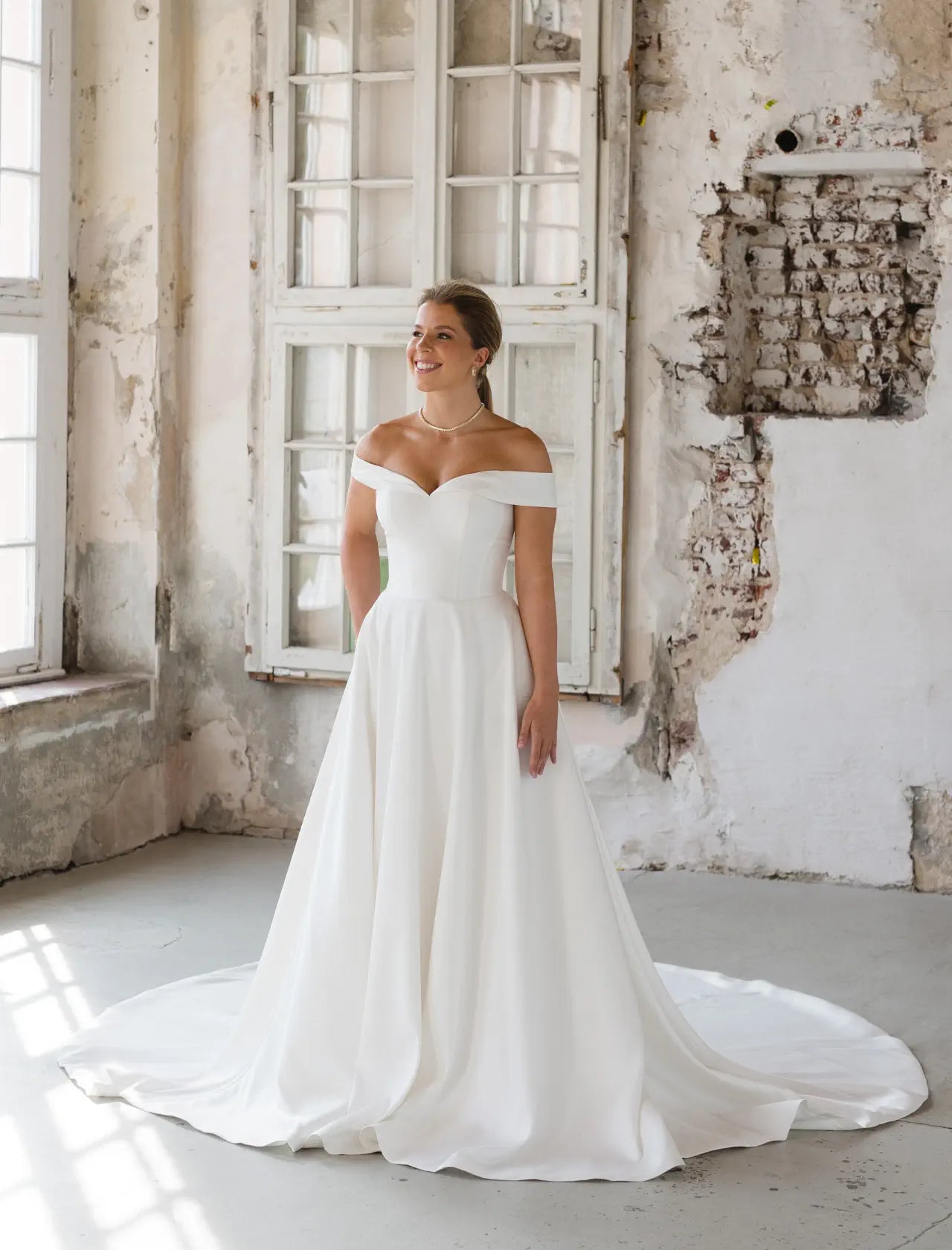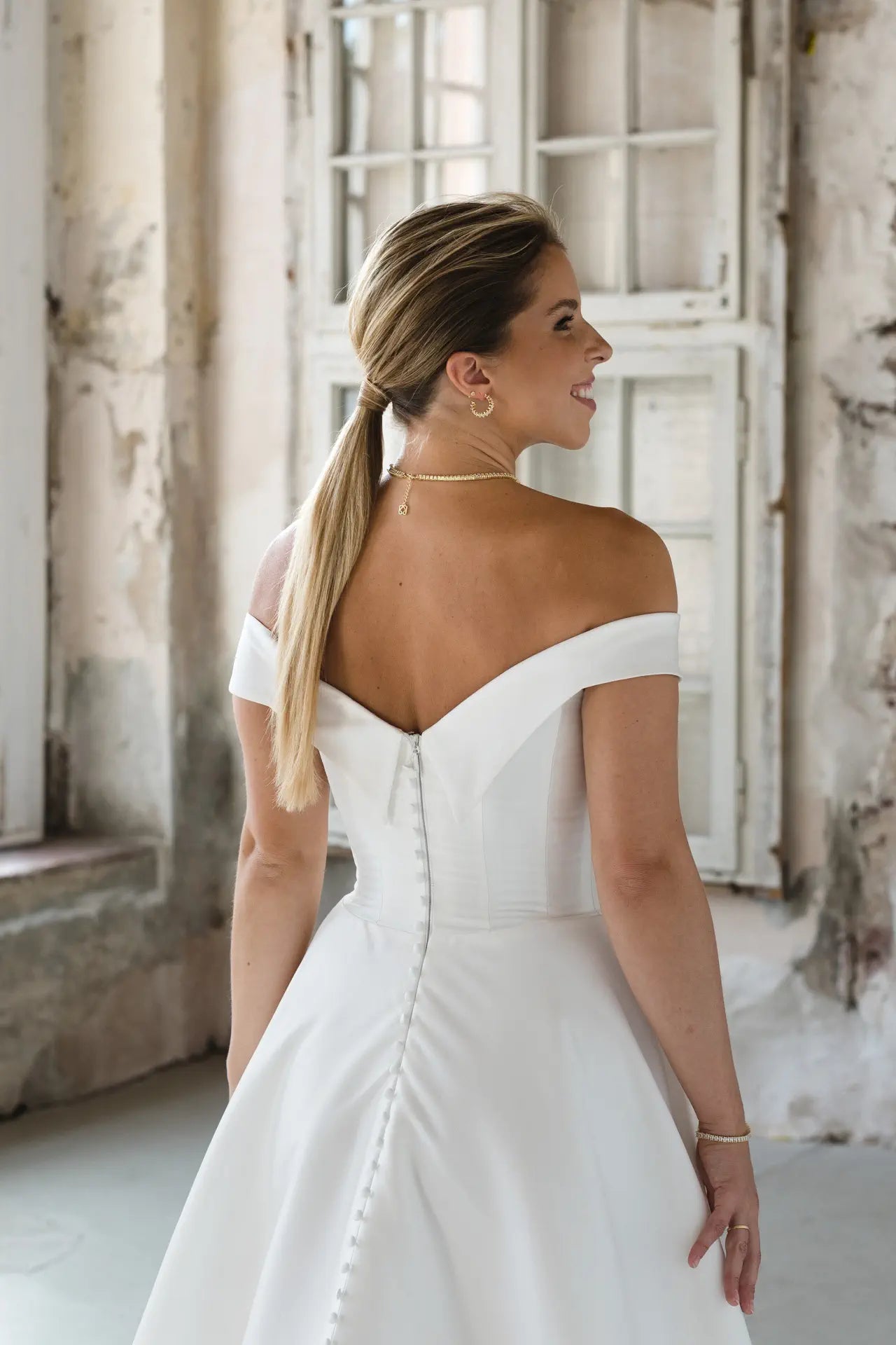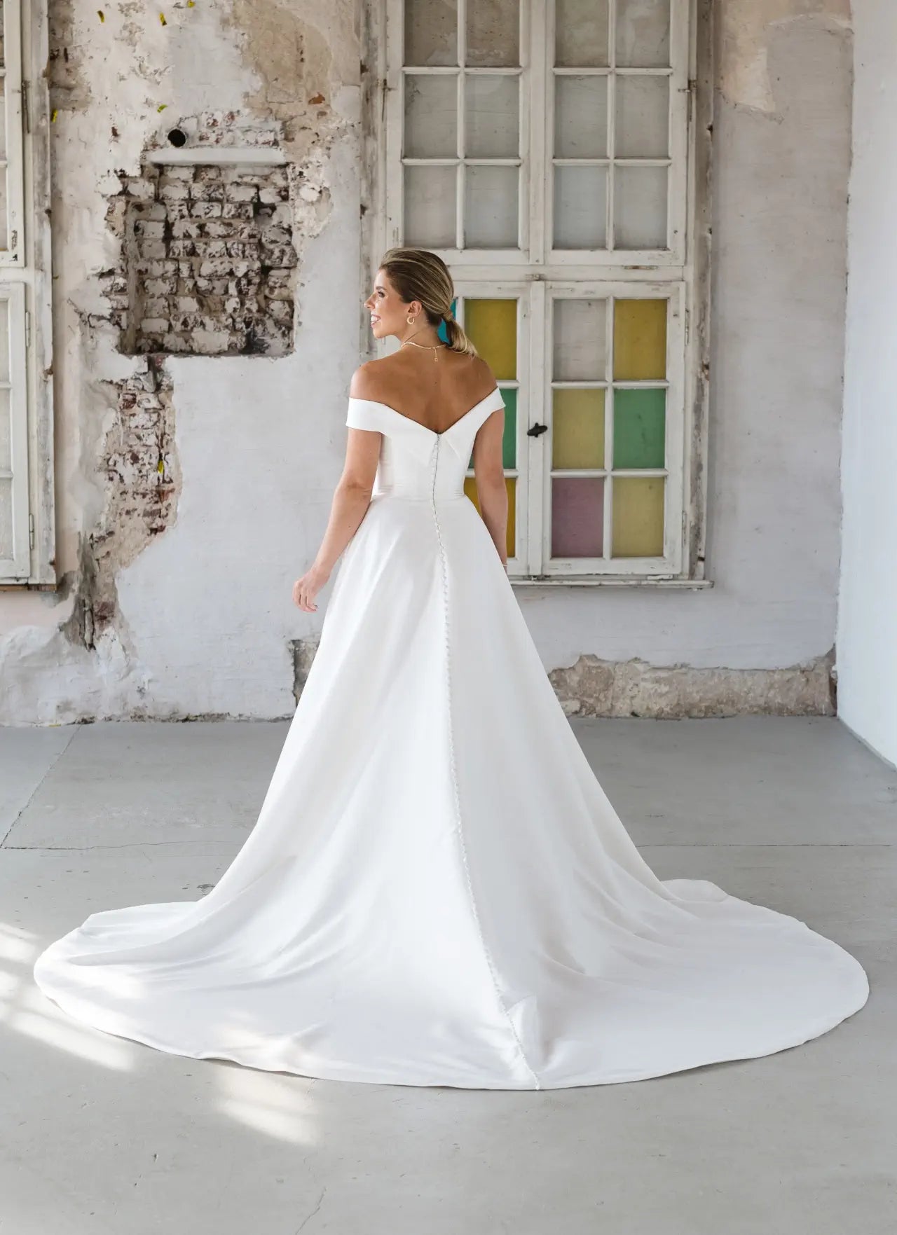 Du träumst von einem schlichten, modernen und königlichen Look, mit dem du jeden verzauberst? Dann könnte BG23-25 dein wahr gewordener Traum sein. Dieses Traumkleid ist eine bezaubernde A-Linie mit einem Herzchen-Ausschnitt, der komplett aus Mikado gefertigt ist. Dieser feminine Ausschnitt wird durch Carmen-Träger ergänzt, die diesem Traumkleid etwas Königliches verleihen und den Blick auf die wunderschöne Corsage lenken. Dieses präsentiert mit seinen eingenähten Stegen eine große Stabilität, die es dir erlaubt, dich den ganzen Tag über frei und bequem zu bewegen. Die Carmenärmel verlaufen wunderschön in den Rücken und sorgen mit ihrer zusammenlaufenden Kragenoptik für einen schönen eleganten Blickfang. Dieses Kleid besticht auch durch seine kleinen und besonderen Details. Das Material ziert Zierknöpfe, die den Rücken bis in die lange Schleppe hinein schmücken, und die eingenähten Taschen bieten Platz für das eine oder andere Taschentuch, um die Freudentränen zu trocknen. Dieses Kleid präsentiert alles, was eine Königin begehrt - zögere nicht und probiere dieses Traumkleid an.
