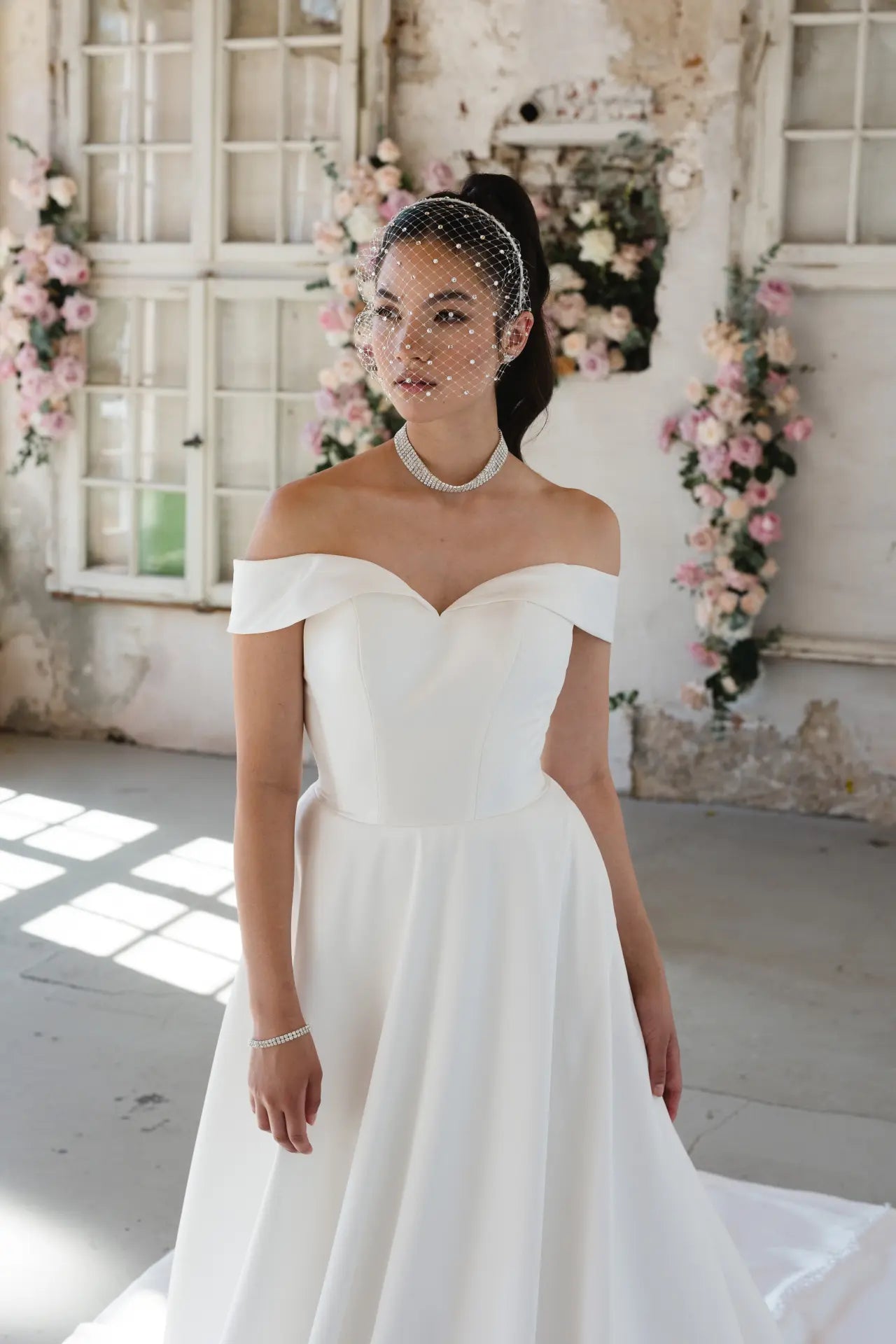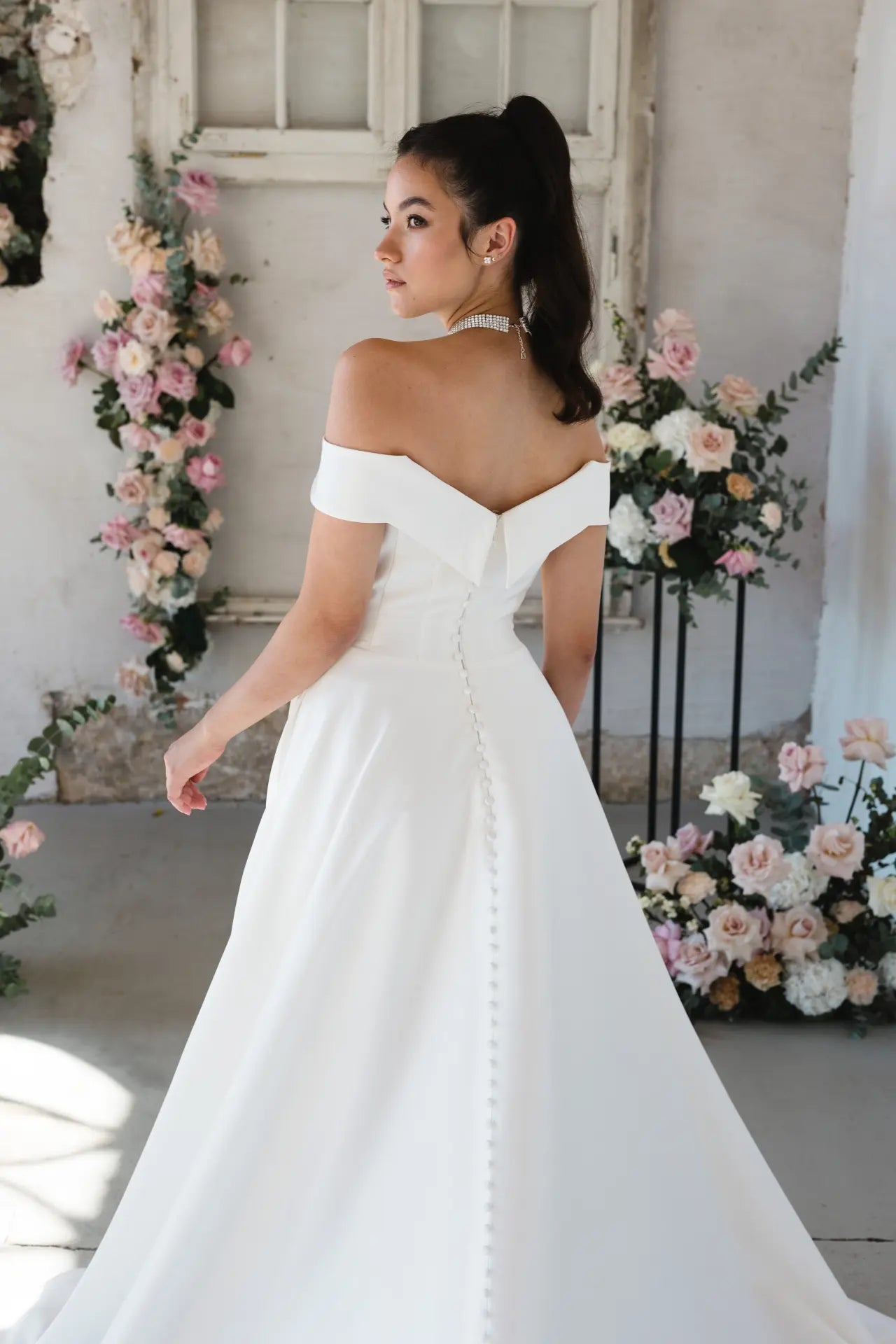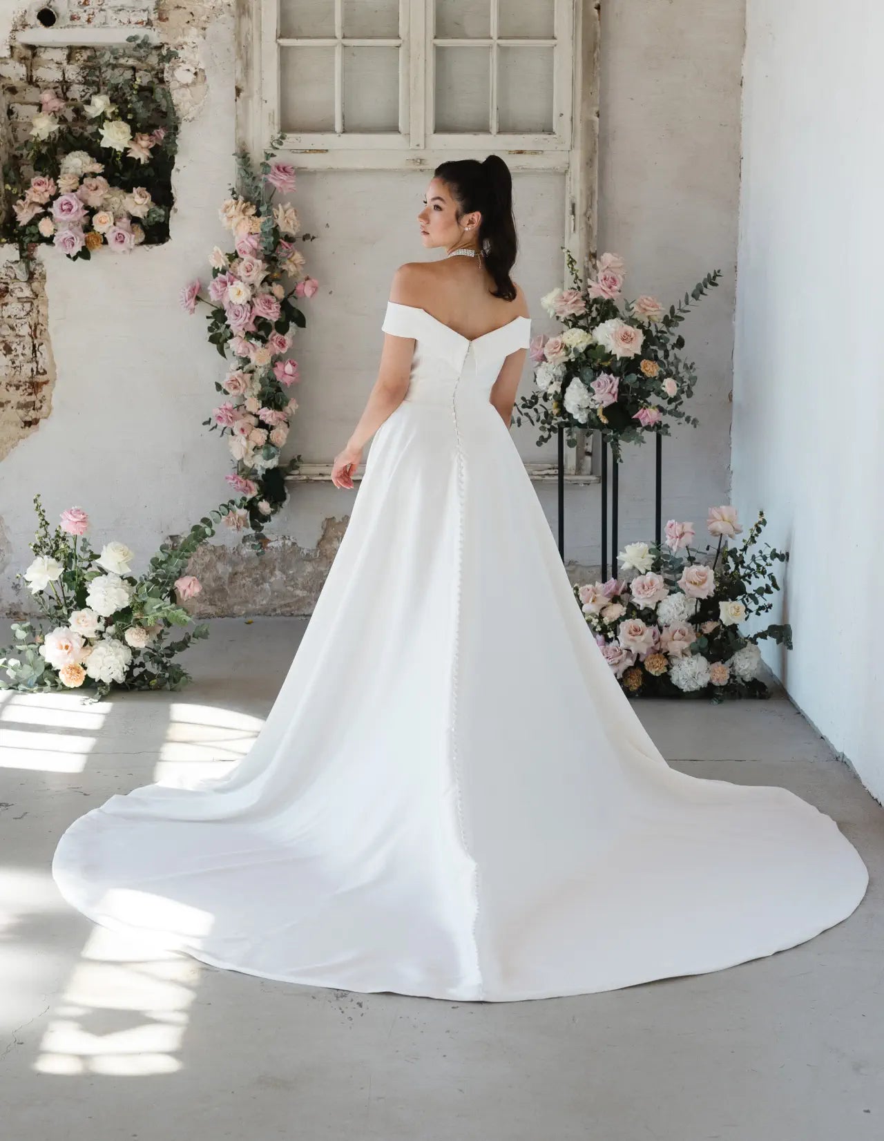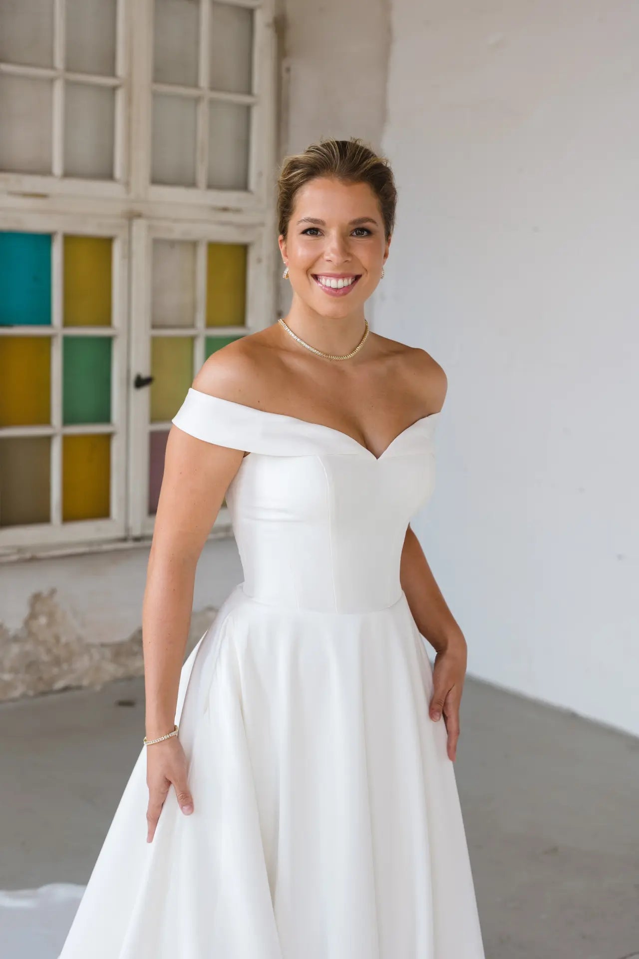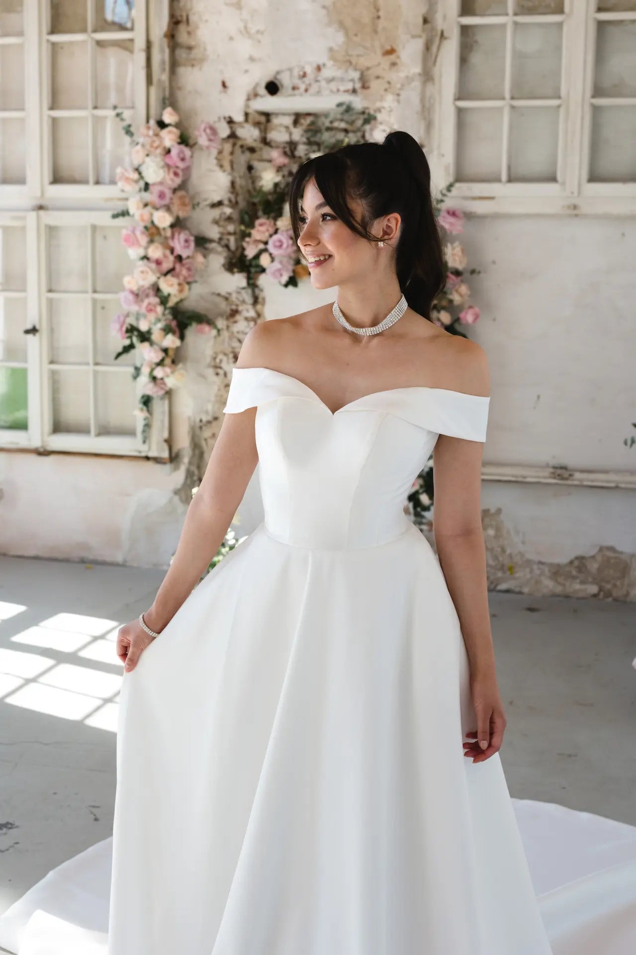 Du träumst von einem schlichten, modernen und königlichen Look, mit dem du jeden verzauberst? Dann könnte BG23-25 dein wahr gewordener Traum sein. Dieses Traumkleid ist eine bezaubernde A-Linie mit einem Herzchen-Ausschnitt, der komplett aus Mikado gefertigt ist. Dieser feminine Ausschnitt wird durch Carmen-Träger ergänzt, die diesem Traumkleid etwas Königliches verleihen und den Blick auf die wunderschöne Corsage lenken. Dieses präsentiert mit seinen eingenähten Stegen eine große Stabilität, die es dir erlaubt, dich den ganzen Tag über frei und bequem zu bewegen. Die Carmenärmel verlaufen wunderschön in den Rücken und sorgen mit ihrer zusammenlaufenden Kragenoptik für einen schönen eleganten Blickfang. Dieses Kleid besticht auch durch seine kleinen und besonderen Details. Das Material ziert Zierknöpfe, die den Rücken bis in die lange Schleppe hinein schmücken, und die eingenähten Taschen bieten Platz für das eine oder andere Taschentuch, um die Freudentränen zu trocknen. Dieses Kleid präsentiert alles, was eine Königin begehrt - zögere nicht und probiere dieses Traumkleid an.