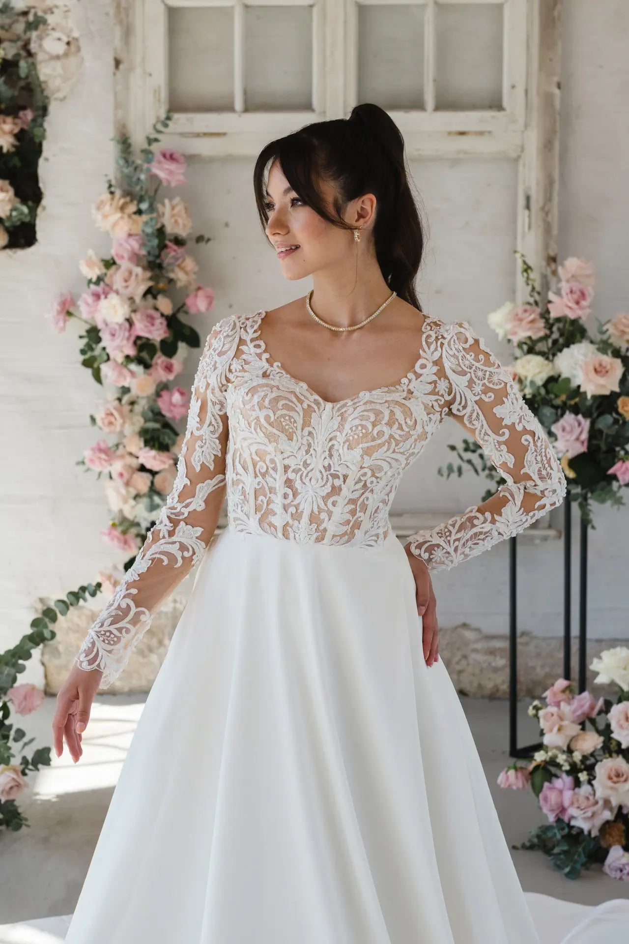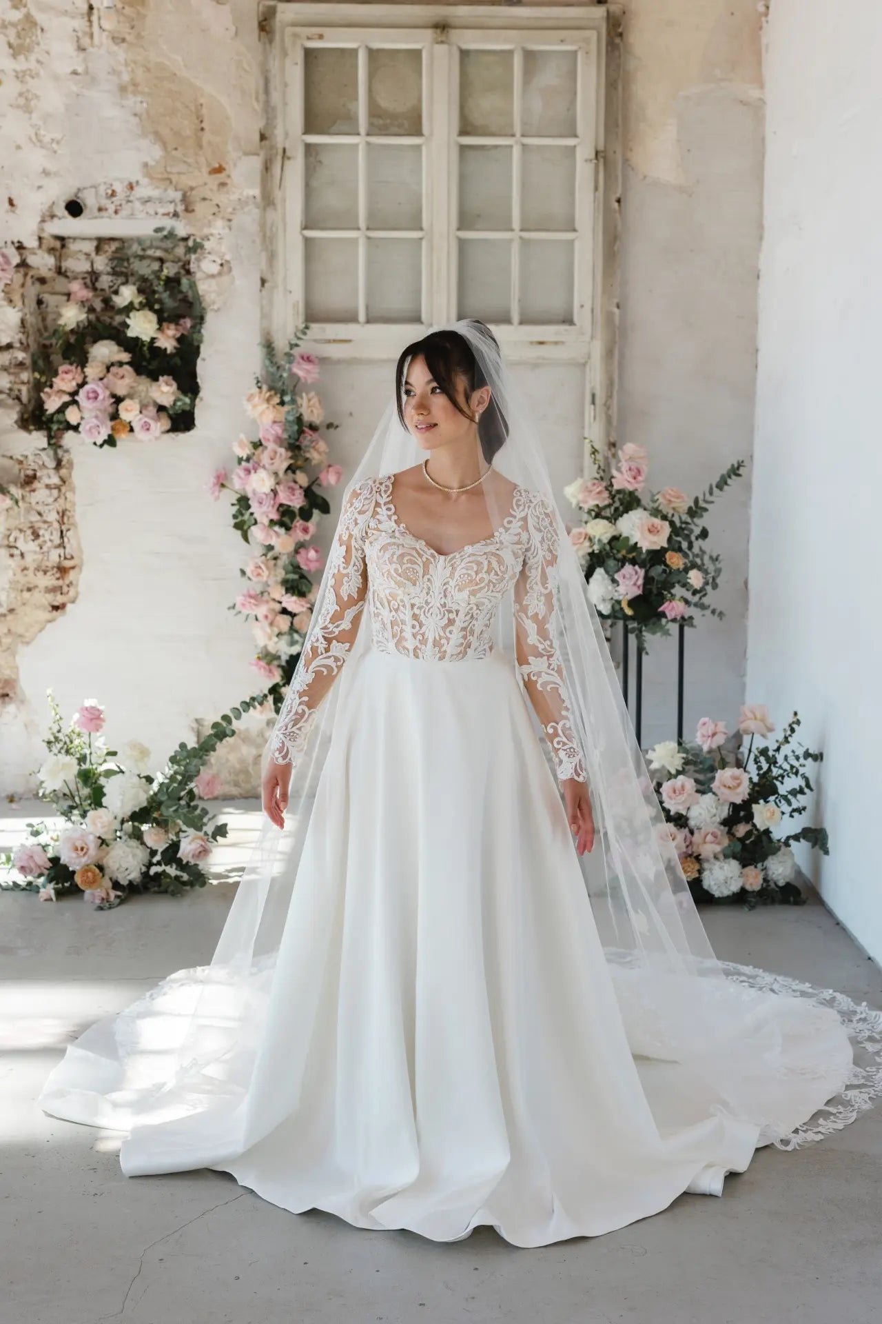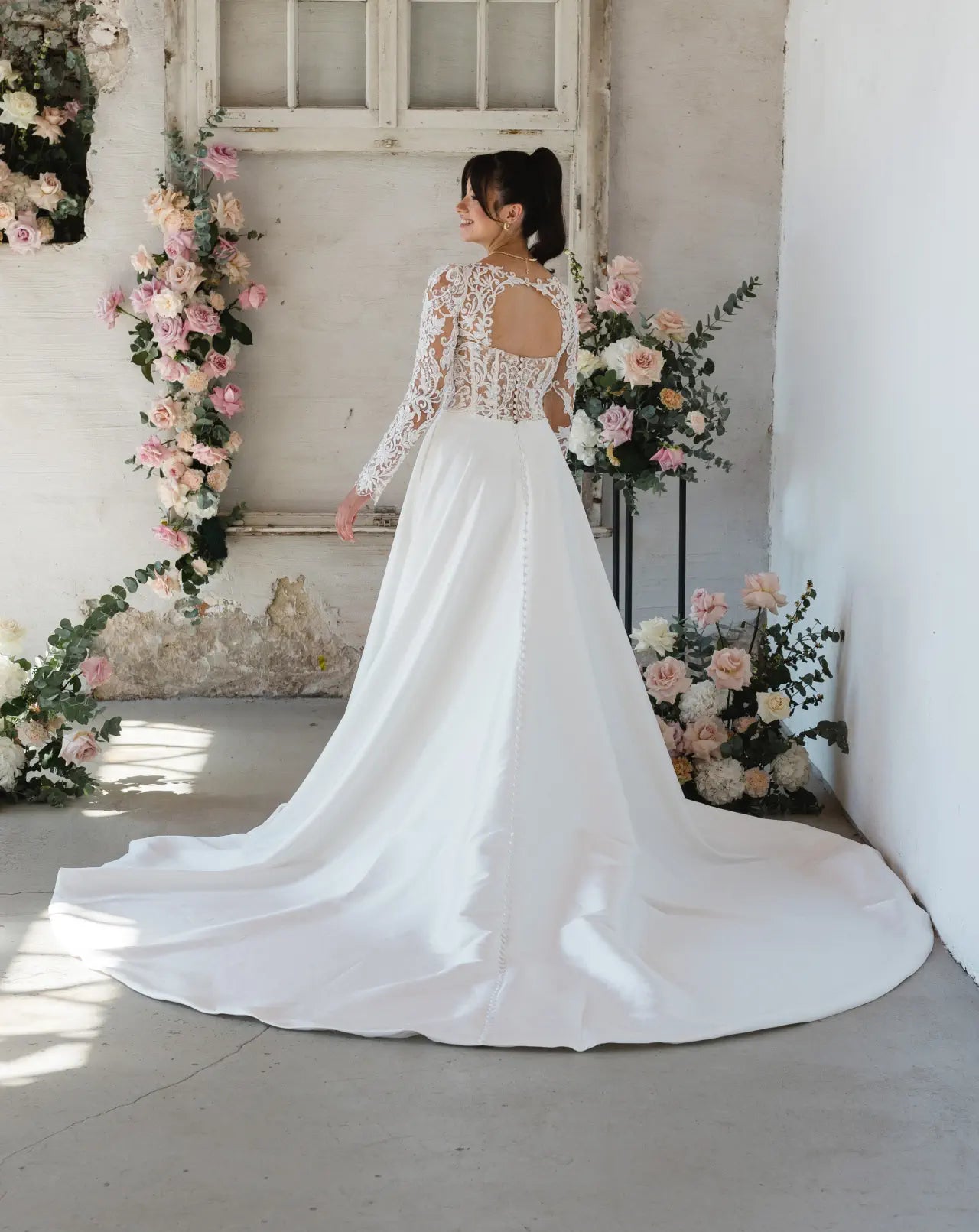 Königliche Spitze trifft auf schlichte Eleganz - wir lieben die Kombination der verschiedenen Materialien, die einen ganz besonderen Effekt erzeugen. Dieses Kleid ist in seinen Elementen so unterschiedlich, dass sich daraus eine wunderschöne Harmonie ergibt. Die feste Corsage überzeugt mit einer modernen Transparenz, die dem Kleid einen verführerischen Touch verleiht. Die eingearbeiteten Corsagenstäbchen und die nudefarbenen Push-up-Cups präsentieren große Stabilität und eine fantastische Passform für alle Größen. Die königliche Spitze verläuft über das gesamte Oberteil. Der feminine Herzchen-Ausschnitt betont das Dekolleté und setzt es wundervoll in Szene. Besonders schön dabei: Das Kleid kann schulterfrei oder mit langen Ärmeln getragen werden. Wie bei jedem Bridonista-Traumkleid hat der Designer diesem Detail besondere Aufmerksamkeit geschenkt. So kannst du frei entscheiden, wie du dein Kleid an deinem großen Tag tragen möchtest. Der schlichte und elegante Tellerrock besticht durch seine Schlichtheit und die angebrachten Zierknöpfe, die vom Rücken bis zur langen Schleppe verlaufen. Außerdem hat dieses Traumkleid eingenähte Taschen, die perfekt sind, um hier ein oder zwei Taschentücher zum Trocknen der Freudentränen aufzubewahren.