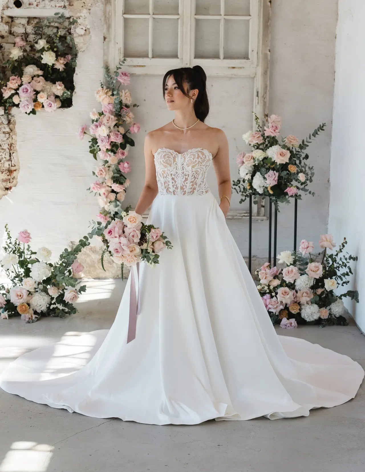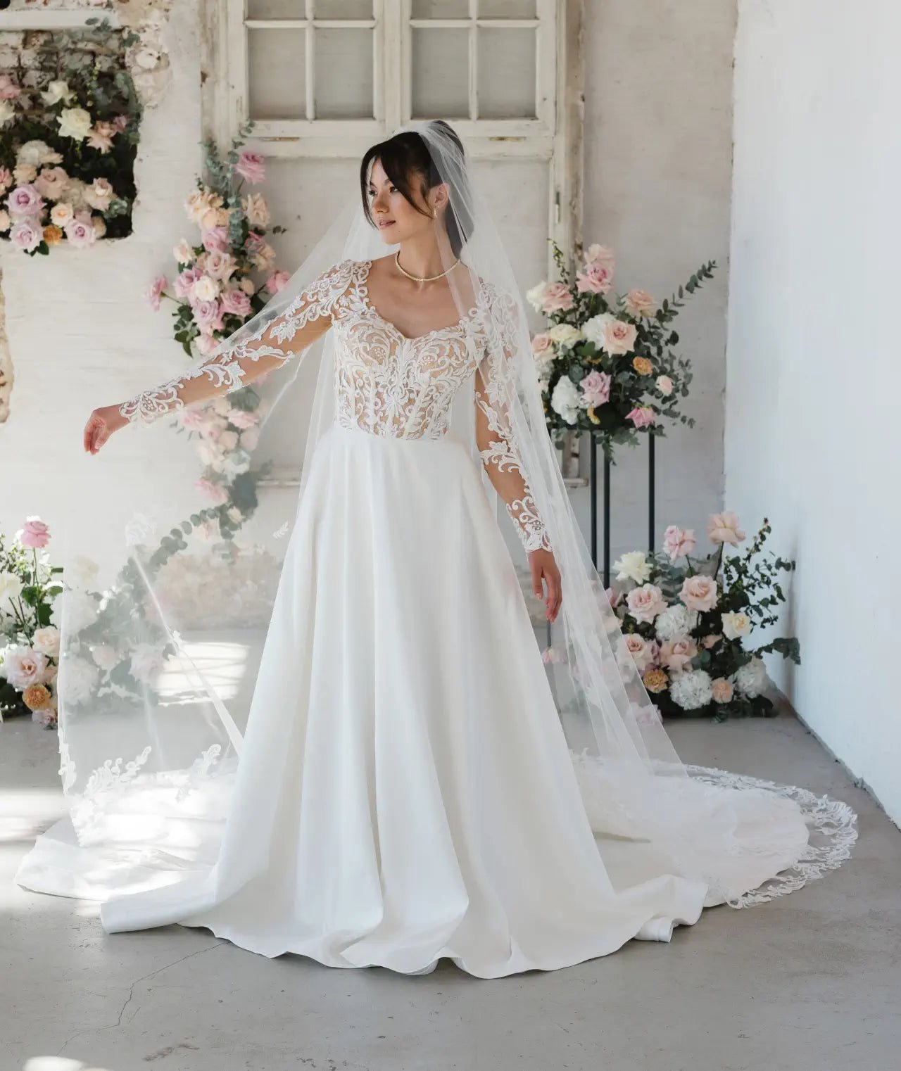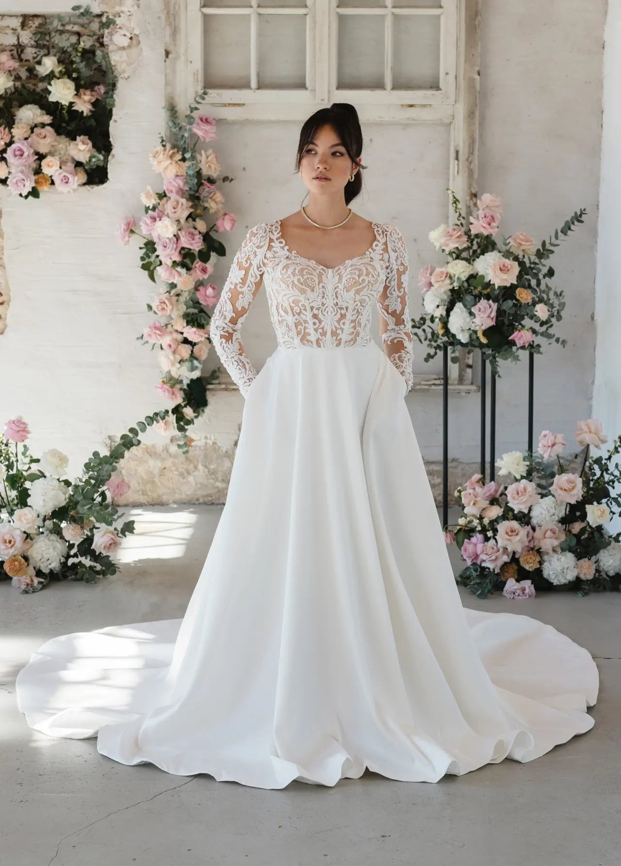 Königliche Spitze trifft auf schlichte Eleganz - wir lieben die Kombination der verschiedenen Materialien, die einen ganz besonderen Effekt erzeugen. Dieses Kleid ist in seinen Elementen so unterschiedlich, dass sich daraus eine wunderschöne Harmonie ergibt. Die feste Corsage überzeugt mit einer modernen Transparenz, die dem Kleid einen verführerischen Touch verleiht. Die eingearbeiteten Corsagenstäbchen und die nudefarbenen Push-up-Cups präsentieren große Stabilität und eine fantastische Passform für alle Größen. Die königliche Spitze verläuft über das gesamte Oberteil. Der feminine Herzchen-Ausschnitt betont das Dekolleté und setzt es wundervoll in Szene. Besonders schön dabei: Das Kleid kann schulterfrei oder mit langen Ärmeln getragen werden. Wie bei jedem Bridonista-Traumkleid hat der Designer diesem Detail besondere Aufmerksamkeit geschenkt. So kannst du frei entscheiden, wie du dein Kleid an deinem großen Tag tragen möchtest. Der schlichte und elegante Tellerrock besticht durch seine Schlichtheit und die angebrachten Zierknöpfe, die vom Rücken bis zur langen Schleppe verlaufen. Außerdem hat dieses Traumkleid eingenähte Taschen, die perfekt sind, um hier ein oder zwei Taschentücher zum Trocknen der Freudentränen aufzubewahren.