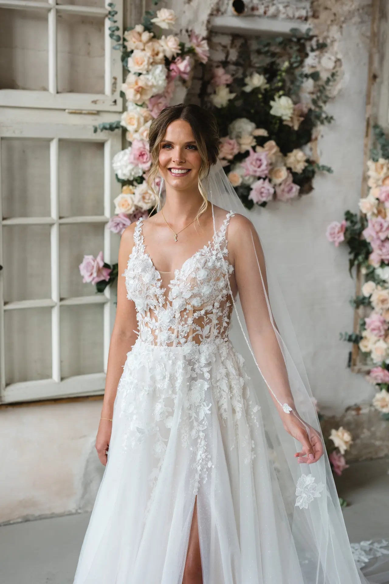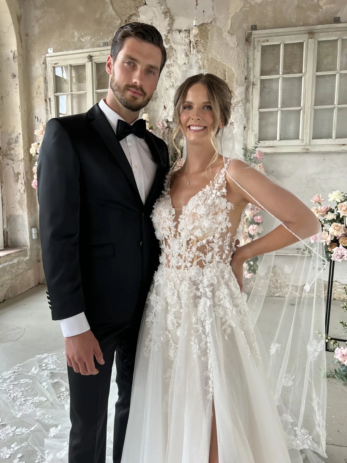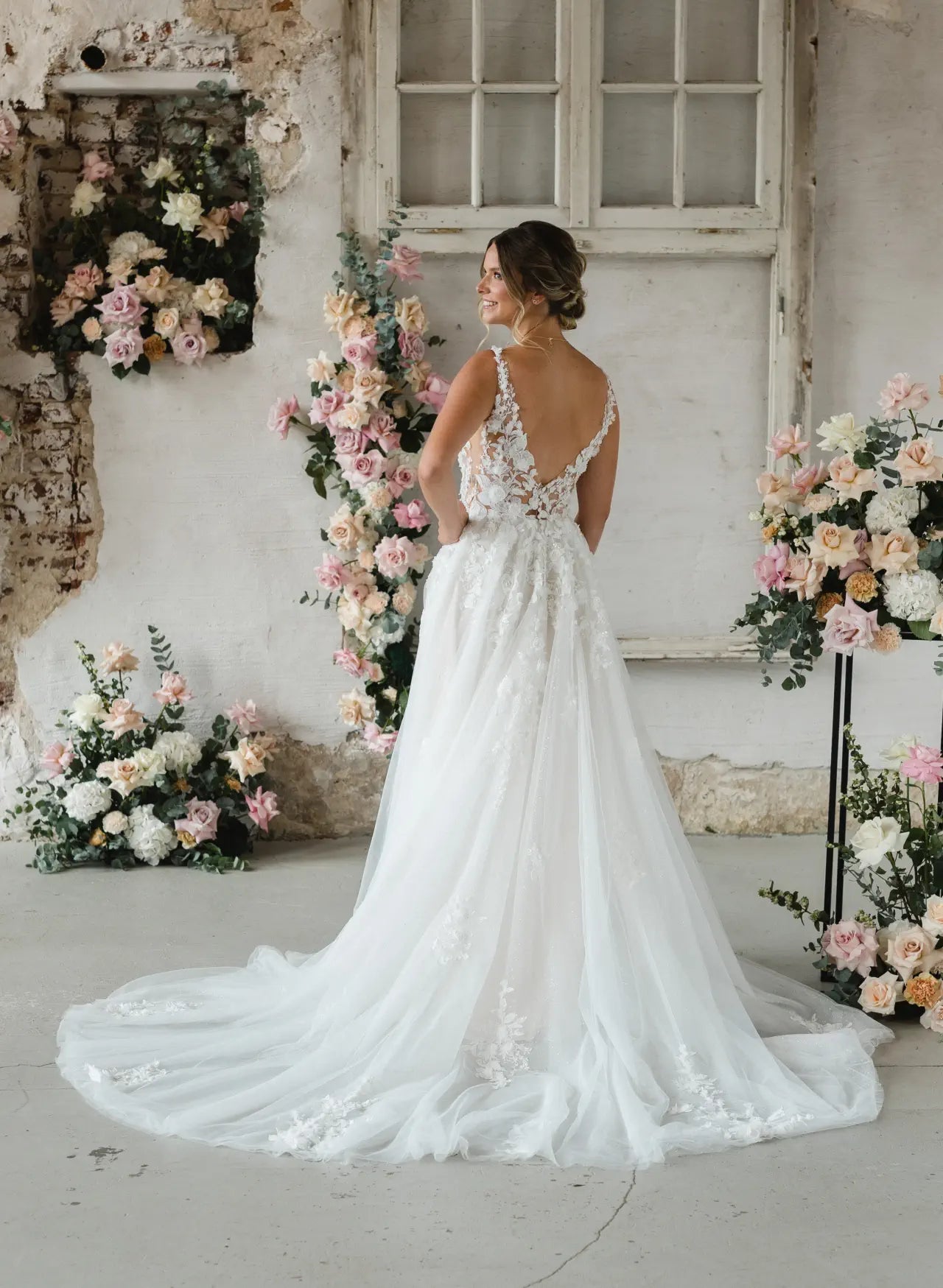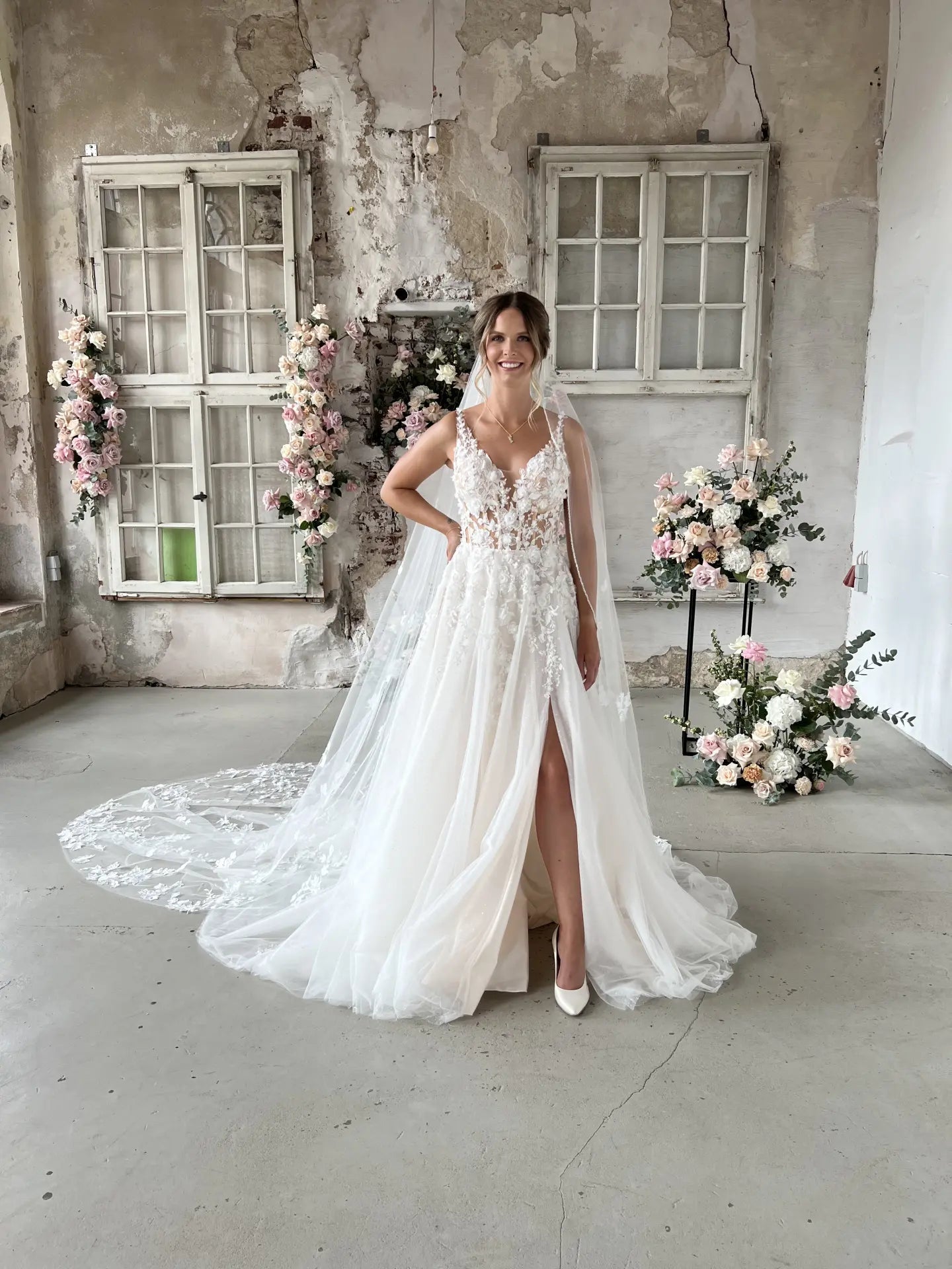Ein sexyness Beinschlitz, eine leicht transparente Corsage und viele romantische Details - all das kann dir das Traumkleid BG23-30 präsentieren! Mit seinen tiefen V-Ausschnitten am Ausschnitt und am Rücken siehst du besonders verführerisch aus. Die verschmälert wirkenden Träger unterstreichen das feminine Design und betonen deine Schultern. Wie bei fast allen Entwürfen von Bridonista hat die Designerin großen Wert auf eine moderne und transparente Corsage gelegt, die mit ihren Stegen und eingenähten Push-up-Cups eine sehr hohe Stabilität für alle Größen garantiert. Die wunderschöne florale Spitze und die aufgesetzten 3D-Blumen unterstreichen den femininen Look ebenso wie die kleinen Spiegelpailletten und der funkelnde Glitzertüllrock. Durch die Verarbeitung dieser beiden Details glänzt du in diesem Kleid noch einmal besonders! Ganz besondere Highlights sind auch der sexyness Beinschlitz, die wunderschöne Schleppe und die feinen Zierknöpfe am Rücken. Um die Aussage dieses Traumkleides zu unterstreichen, hat es sich Bridonista nicht nehmen lassen, einen passenden Kathedralschleier zu entwerfen. Achtung liebe Braut, du wirst dich Hals über Kopf verlieben und dieses Traumkleid mit passendem Traumschleier nicht mehr ausziehen wollen!