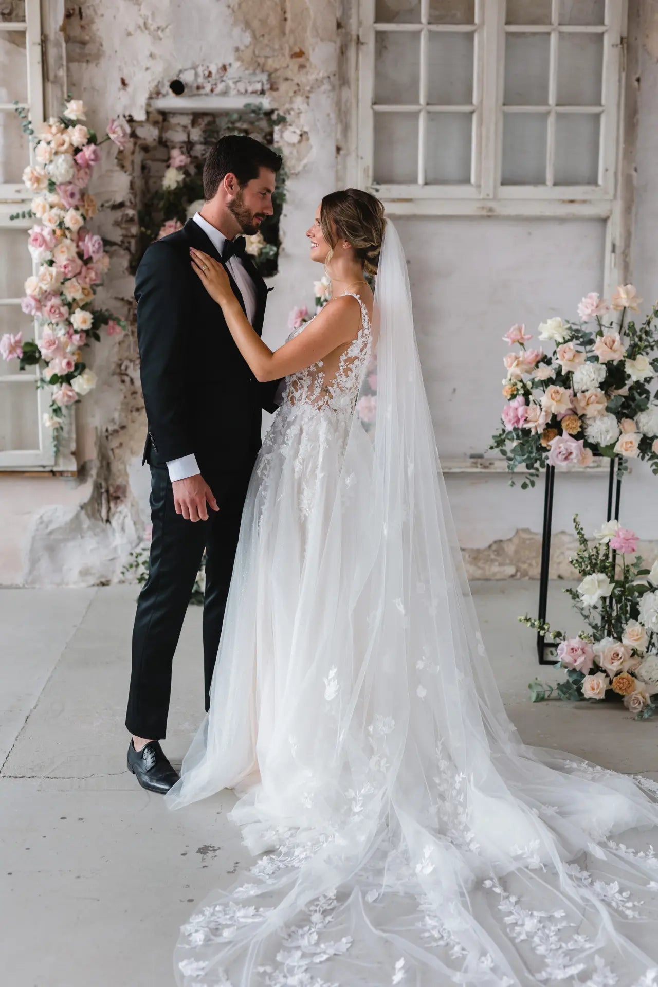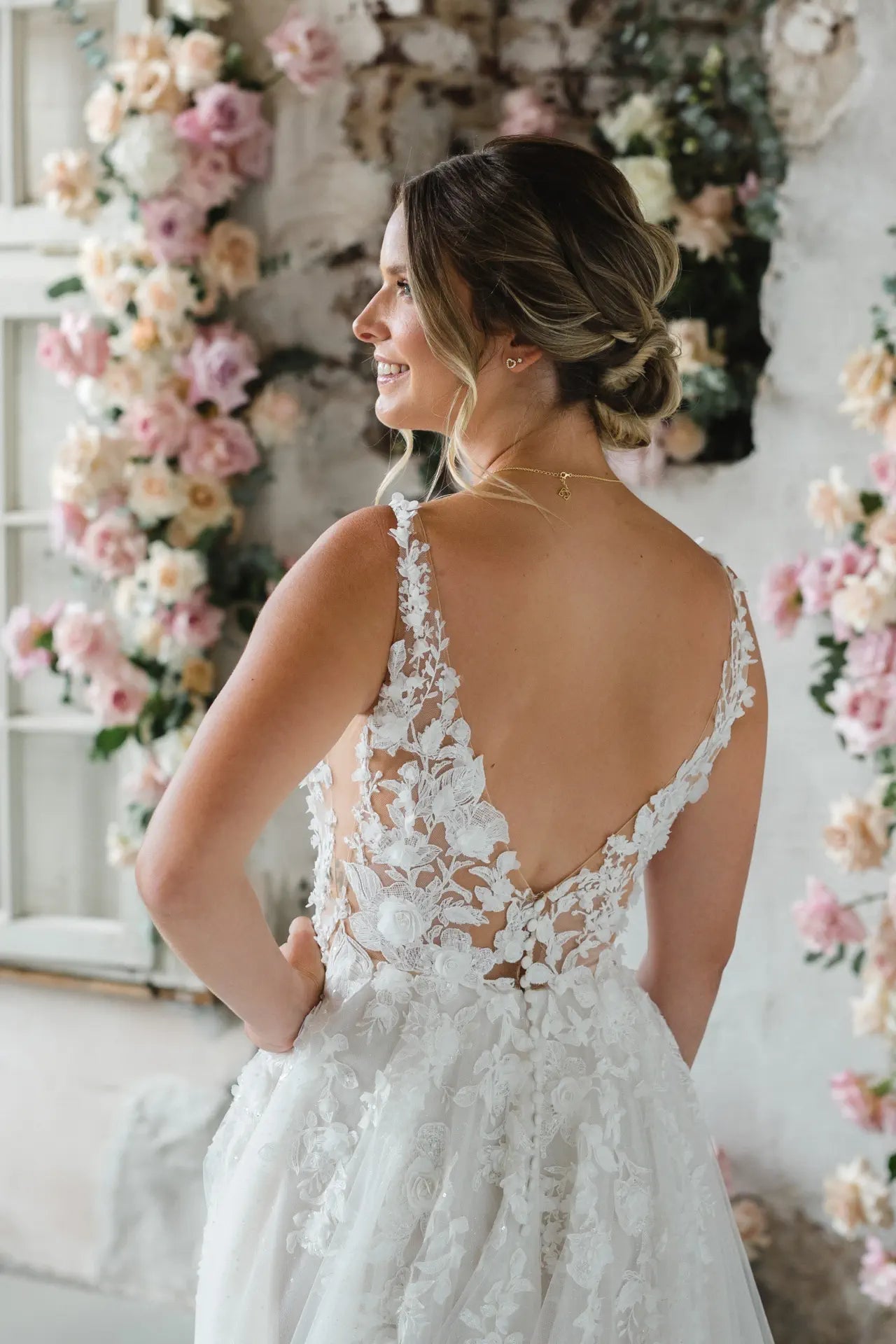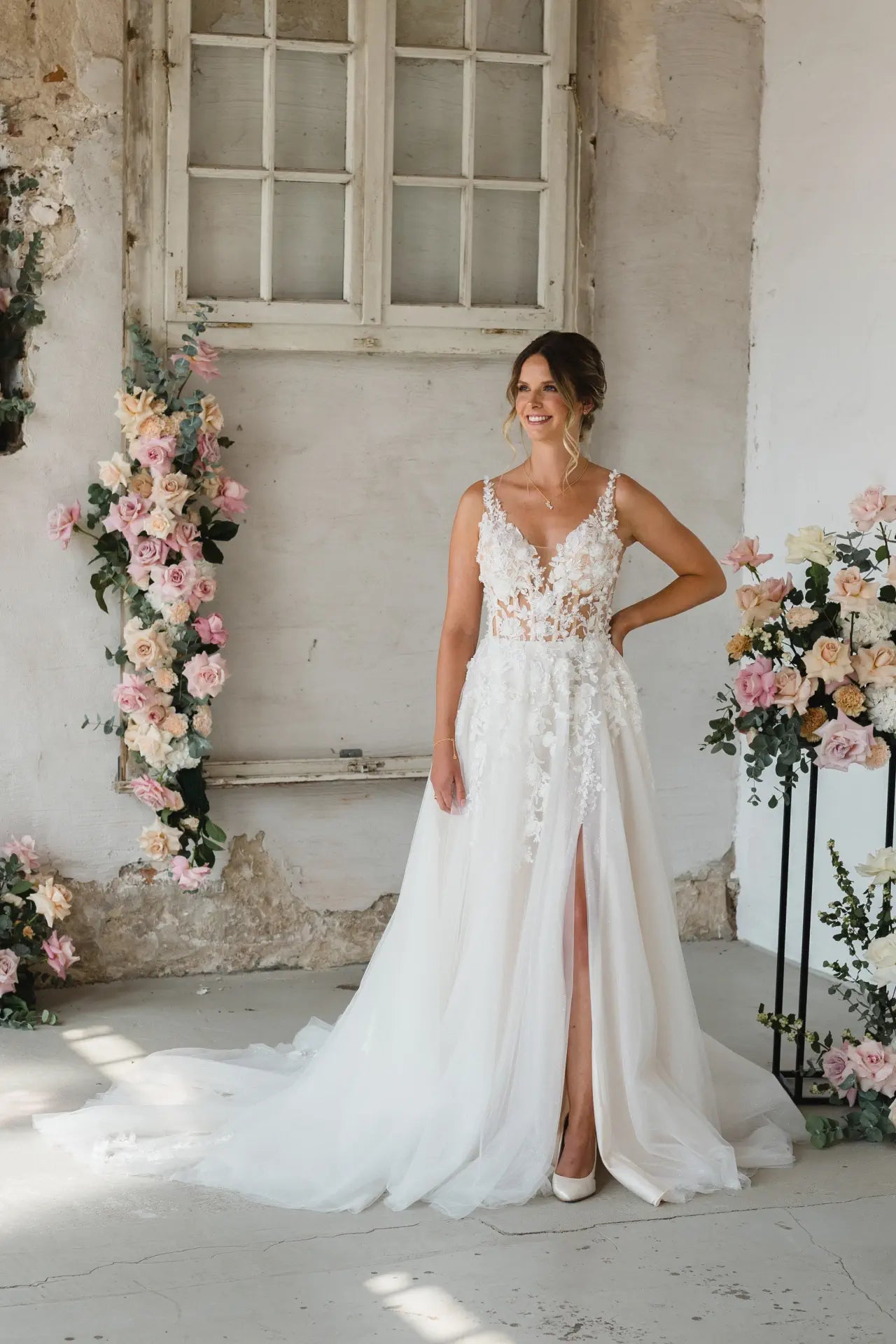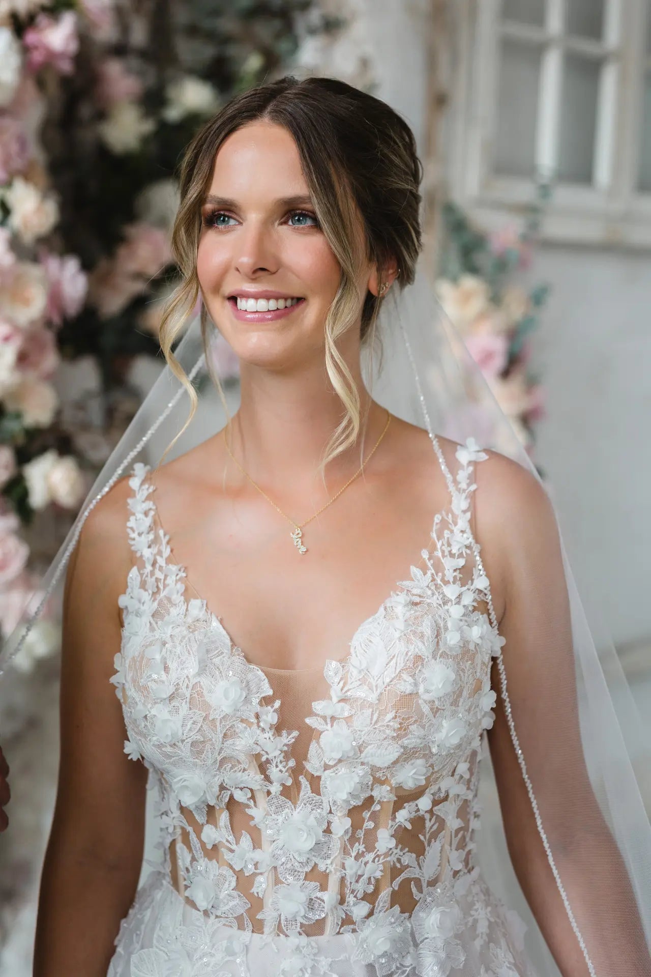 Ein sexyness Beinschlitz, eine leicht transparente Corsage und viele romantische Details - all das kann dir das Traumkleid BG23-30 präsentieren! Mit seinen tiefen V-Ausschnitten am Ausschnitt und am Rücken siehst du besonders verführerisch aus. Die verschmälert wirkenden Träger unterstreichen das feminine Design und betonen deine Schultern. Wie bei fast allen Entwürfen von Bridonista hat die Designerin großen Wert auf eine moderne und transparente Corsage gelegt, die mit ihren Stegen und eingenähten Push-up-Cups eine sehr hohe Stabilität für alle Größen garantiert. Die wunderschöne florale Spitze und die aufgesetzten 3D-Blumen unterstreichen den femininen Look ebenso wie die kleinen Spiegelpailletten und der funkelnde Glitzertüllrock. Durch die Verarbeitung dieser beiden Details glänzt du in diesem Kleid noch einmal besonders! Ganz besondere Highlights sind auch der sexyness Beinschlitz, die wunderschöne Schleppe und die feinen Zierknöpfe am Rücken. Um die Aussage dieses Traumkleides zu unterstreichen, hat es sich Bridonista nicht nehmen lassen, einen passenden Kathedralschleier zu entwerfen. Achtung liebe Braut, du wirst dich Hals über Kopf verlieben und dieses Traumkleid mit passendem Traumschleier nicht mehr ausziehen wollen!