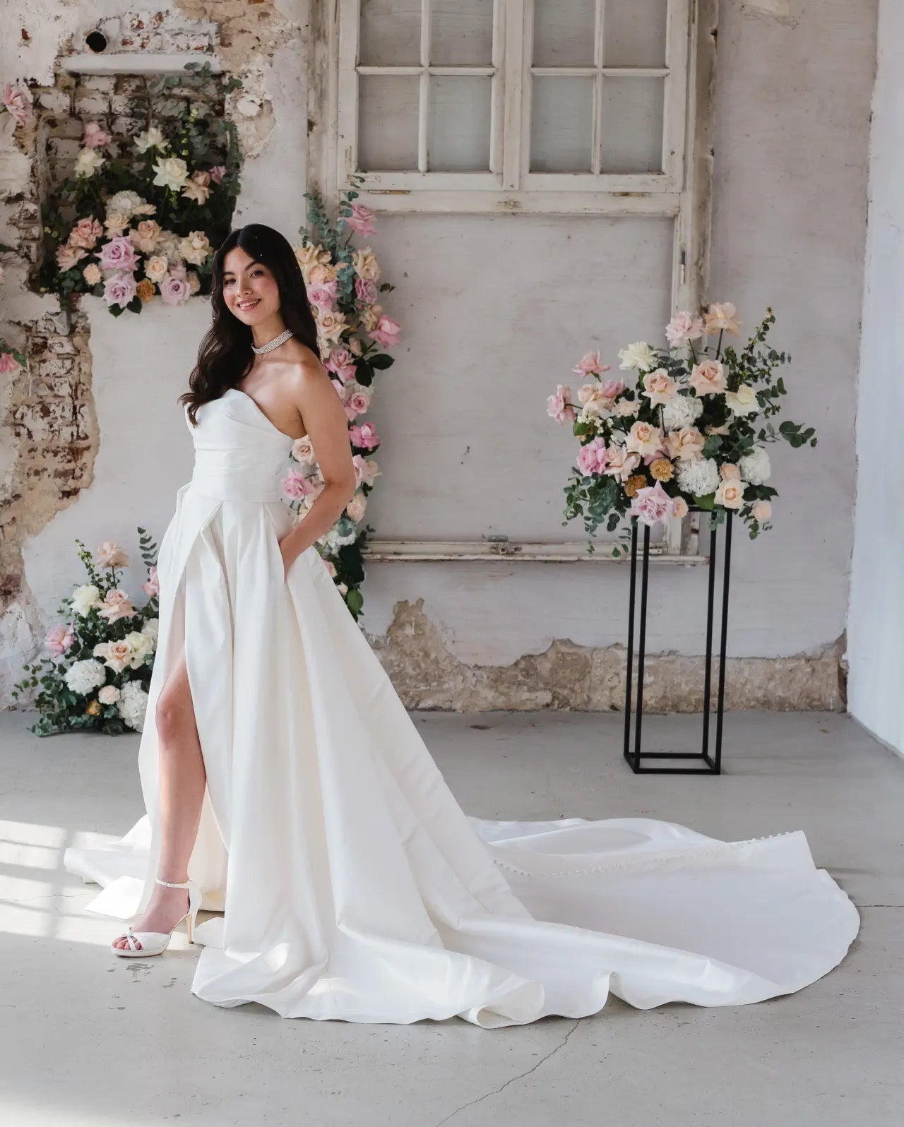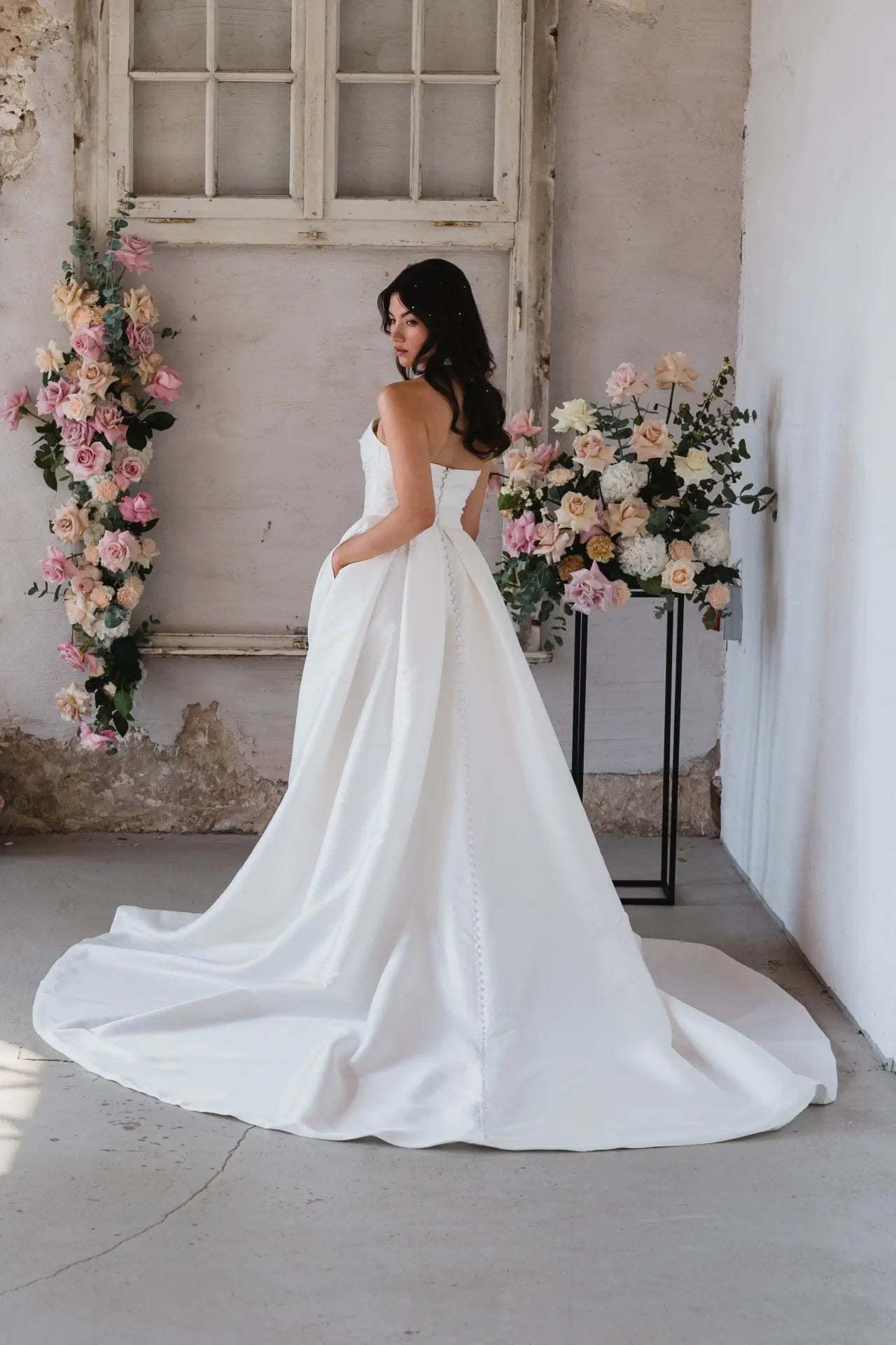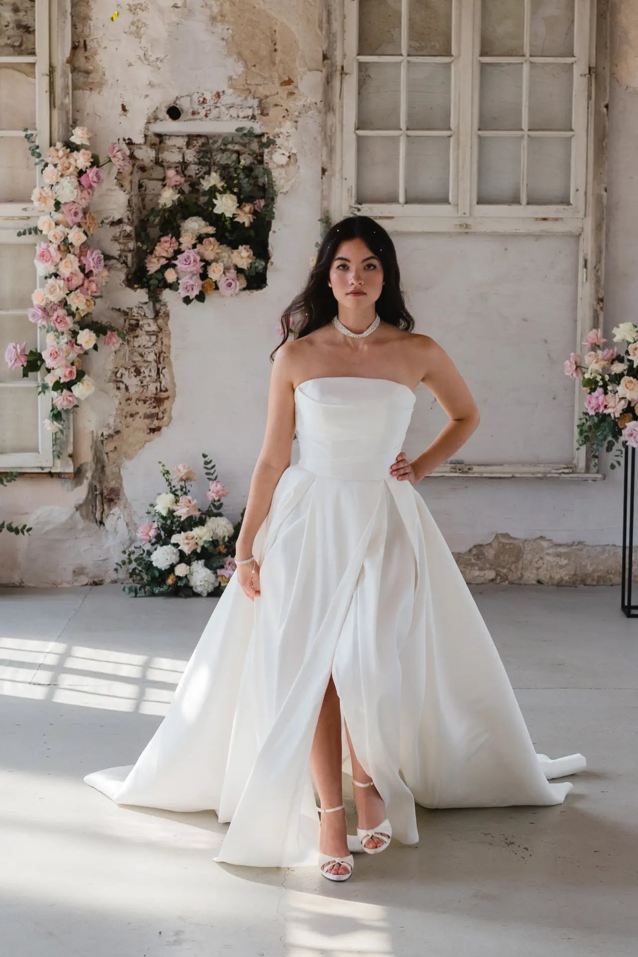 Ganz ohne Spitze und Glitzer kommt dieses Traumkleid aus. Die schlichte Eleganz steht bei BG23-31 im Vordergrund und überzeugt mit feinen und eleganten Details. Das schulterfreie Oberteil besteht aus einer eng anliegenden Corsage, die mit ihrem runden Ausschnitt eine perfekte Passform für alle Größen garantiert. Die wunderschönen Rüschen setzen noch einmal einen besonderen Akzent auf das kurze Oberteil und zaubern eine wunderschöne Silhouette. Der Tellerrock aus Mikado ist in wunderschöne Falten gelegt und sorgt so für wunderschöne Kellerfalten, die das Kleid lebendig wirken lassen. Ein besonderer Blickfang ist der sexyness Beinschlitz, der für absolute Bewegungsfreiheit sorgt. Die feinen Zierknöpfe, die vom Rücken bis zur langen Schleppe verlaufen, sind ebenfalls ein besonderes und elegantes Detail. Außerdem hat dieses Traumkleid eingenähte Taschen, die perfekt sind, um hier ein oder zwei Taschentücher zum Trocknen deiner Freudentränen zu verstauen.