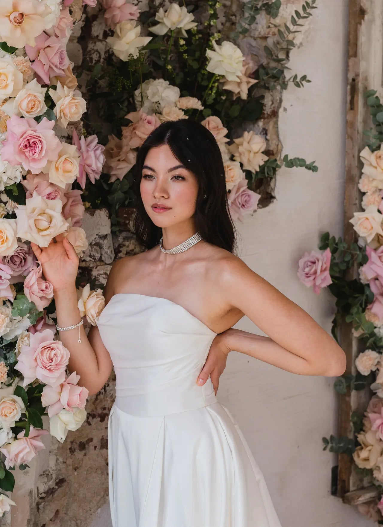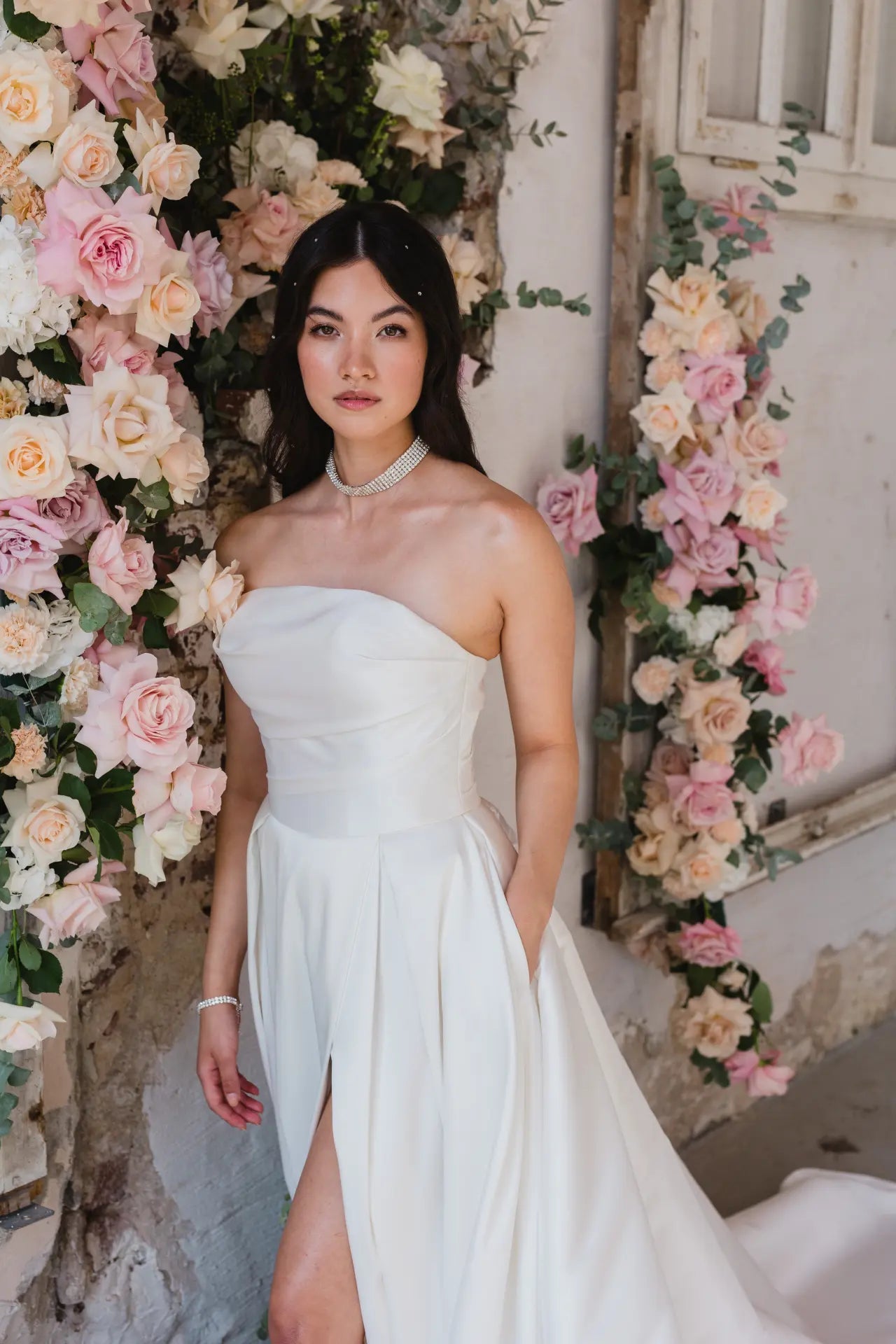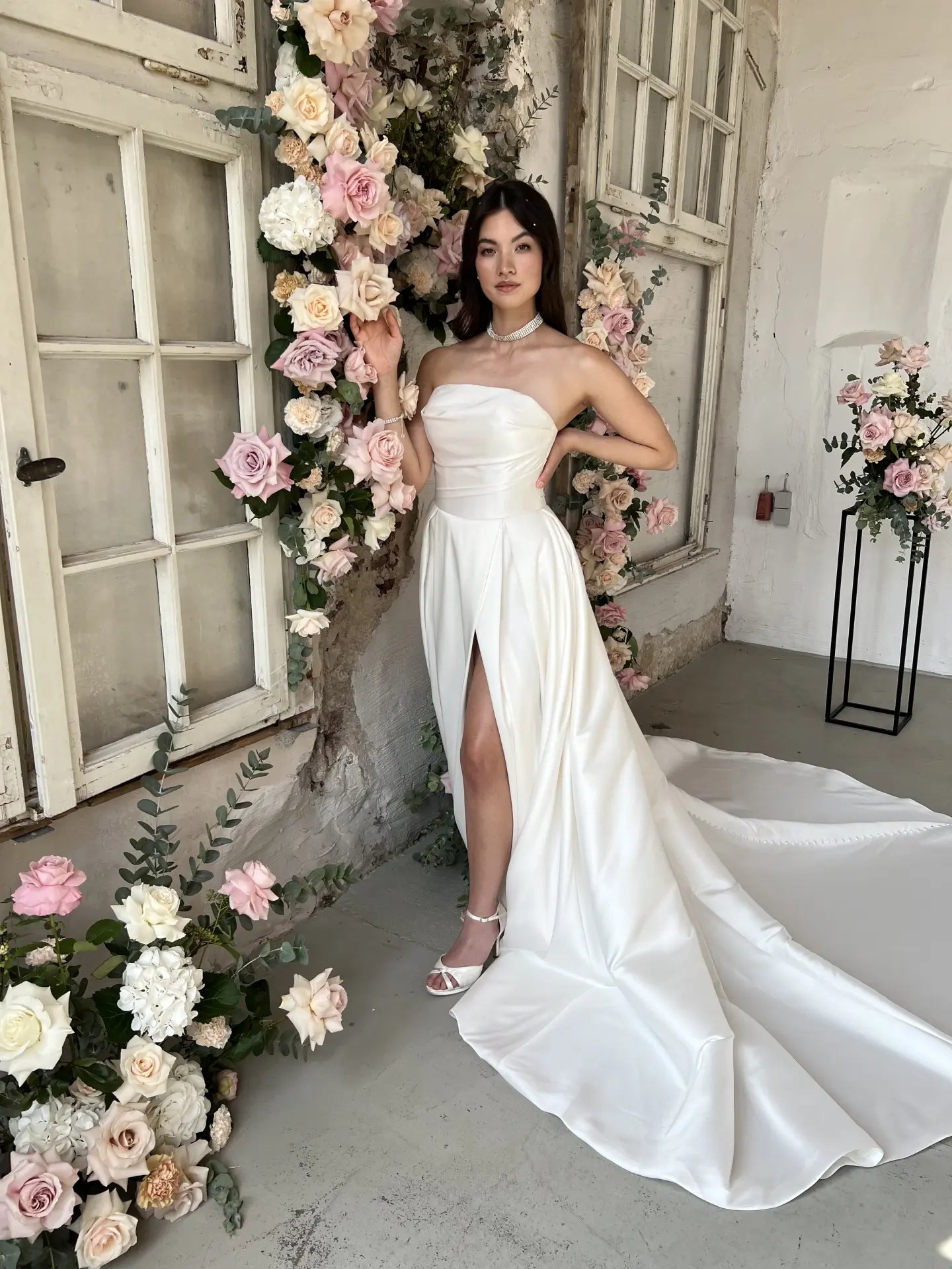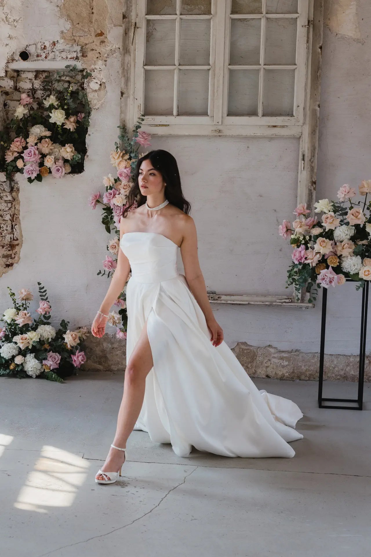 Ganz ohne Spitze und Glitzer kommt dieses Traumkleid aus. Die schlichte Eleganz steht bei BG23-31 im Vordergrund und überzeugt mit feinen und eleganten Details. Das schulterfreie Oberteil besteht aus einer eng anliegenden Corsage, die mit ihrem runden Ausschnitt eine perfekte Passform für alle Größen garantiert. Die wunderschönen Rüschen setzen noch einmal einen besonderen Akzent auf das kurze Oberteil und zaubern eine wunderschöne Silhouette. Der Tellerrock aus Mikado ist in wunderschöne Falten gelegt und sorgt so für wunderschöne Kellerfalten, die das Kleid lebendig wirken lassen. Ein besonderer Blickfang ist der sexyness Beinschlitz, der für absolute Bewegungsfreiheit sorgt. Die feinen Zierknöpfe, die vom Rücken bis zur langen Schleppe verlaufen, sind ebenfalls ein besonderes und elegantes Detail. Außerdem hat dieses Traumkleid eingenähte Taschen, die perfekt sind, um hier ein oder zwei Taschentücher zum Trocknen deiner Freudentränen zu verstauen.