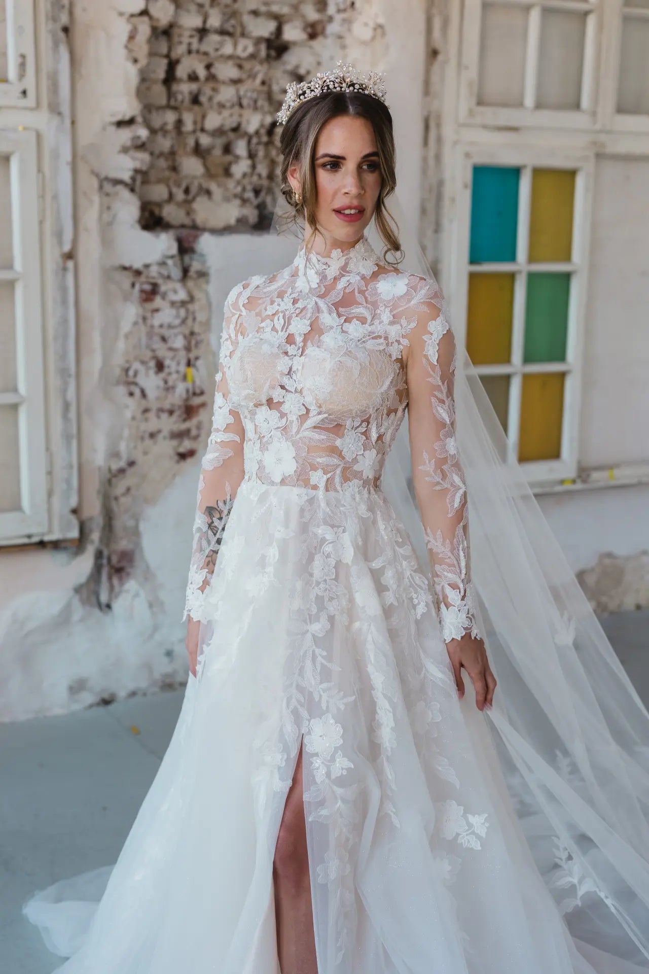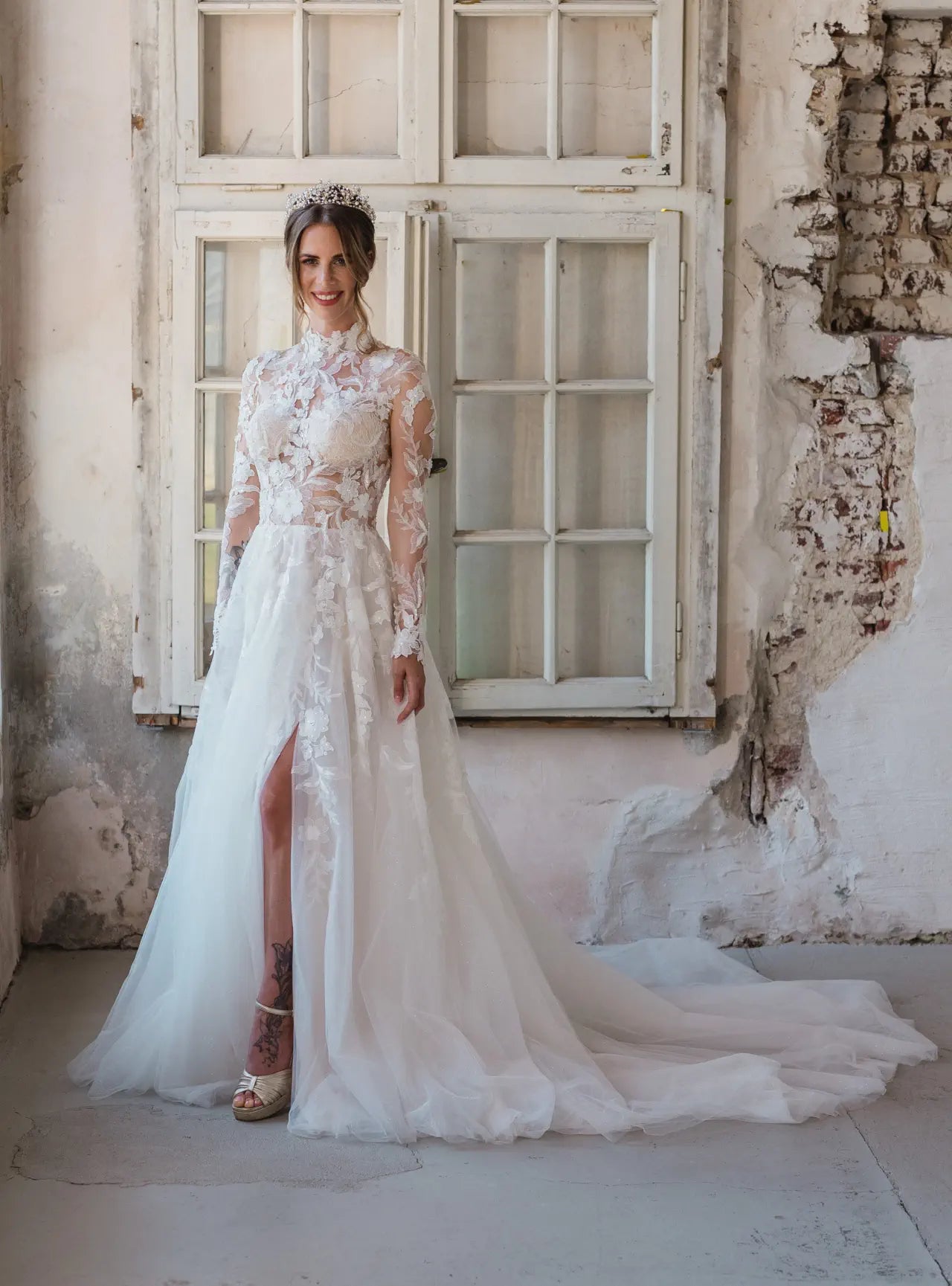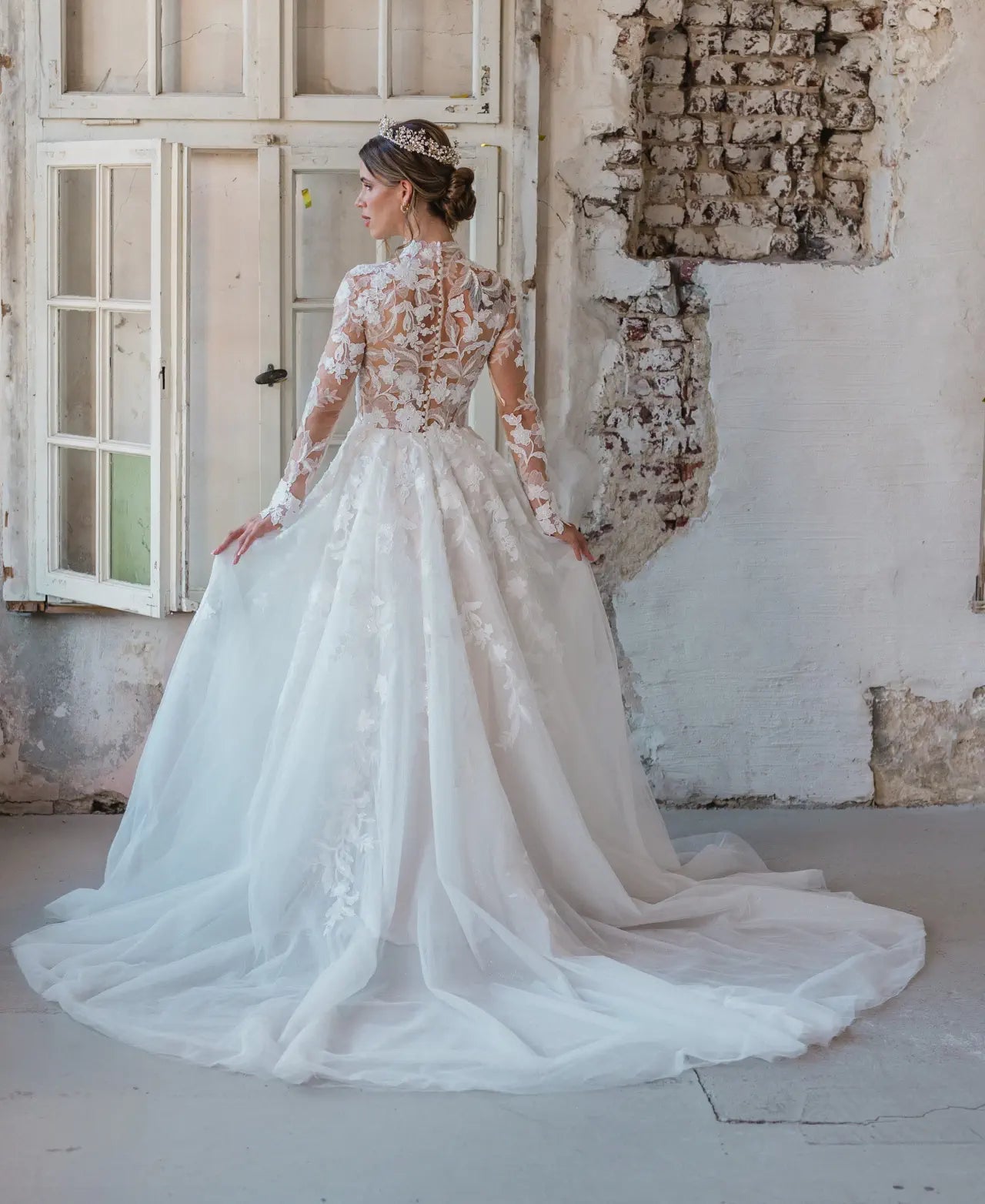 Bist du auf der Suche nach einem aufregenden Traumkleid, das elegant und sexy zugleich ist? Dann ist BG23-37 genau das Kleid, nach dem du schon immer gesucht hast! Mit diesem ausgefallenen Design hat der Designer hier einen Traum für alle Couture-Liebhaberinnen geschaffen. Das hochgeschlossene Kleid aus feiner, eleganter Spitze, transparentem Netz und voluminösem Tüll versprüht einen besonderen Glam! Die aufregende transparente Corsage bietet mit ihren eingearbeiteten Stäben und nudefarbenen Push-up-Cups tollen Halt für alle Größen. Die verspielte florale Spitze breitet sich über die gesamte Corsage, den hohen Ausschnitt und die langen Ärmel aus, bis sie in den fließenden Tüllrock übergeht und in der langen Schleppe endet. Das hautfarbene Netz sorgt für einen tollen Tattoo-Effekt und hinterlässt den Eindruck, dass die Spitze auf der Haut aufliegt. Die edle Spitze wird durch kleine aufgenähte Glasperlen abgerundet, die wunderschöne Akzente setzen. Besonders schöne Details finden sich am Rock und am Rücken: die stoffbesetzten Zierknöpfe, die vom Hals über den gesamten Rücken verlaufen, eine Schicht Glitzertüll für eine Extraportion Glanz und ein sexy Beinschlitz.