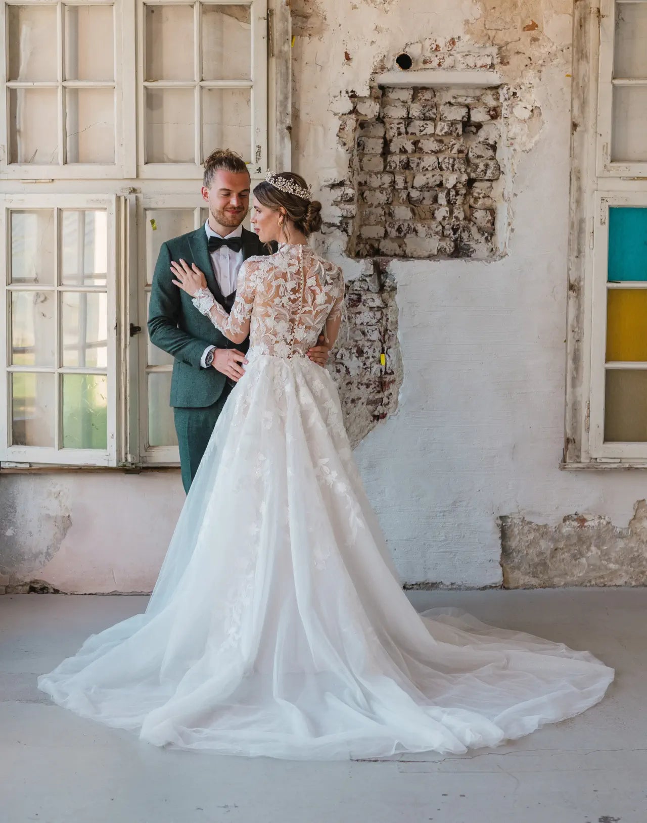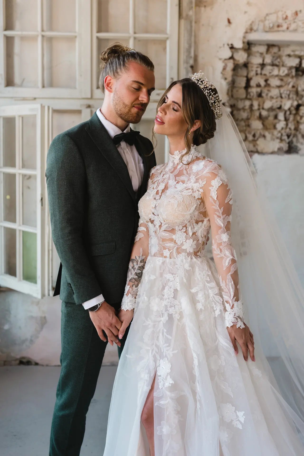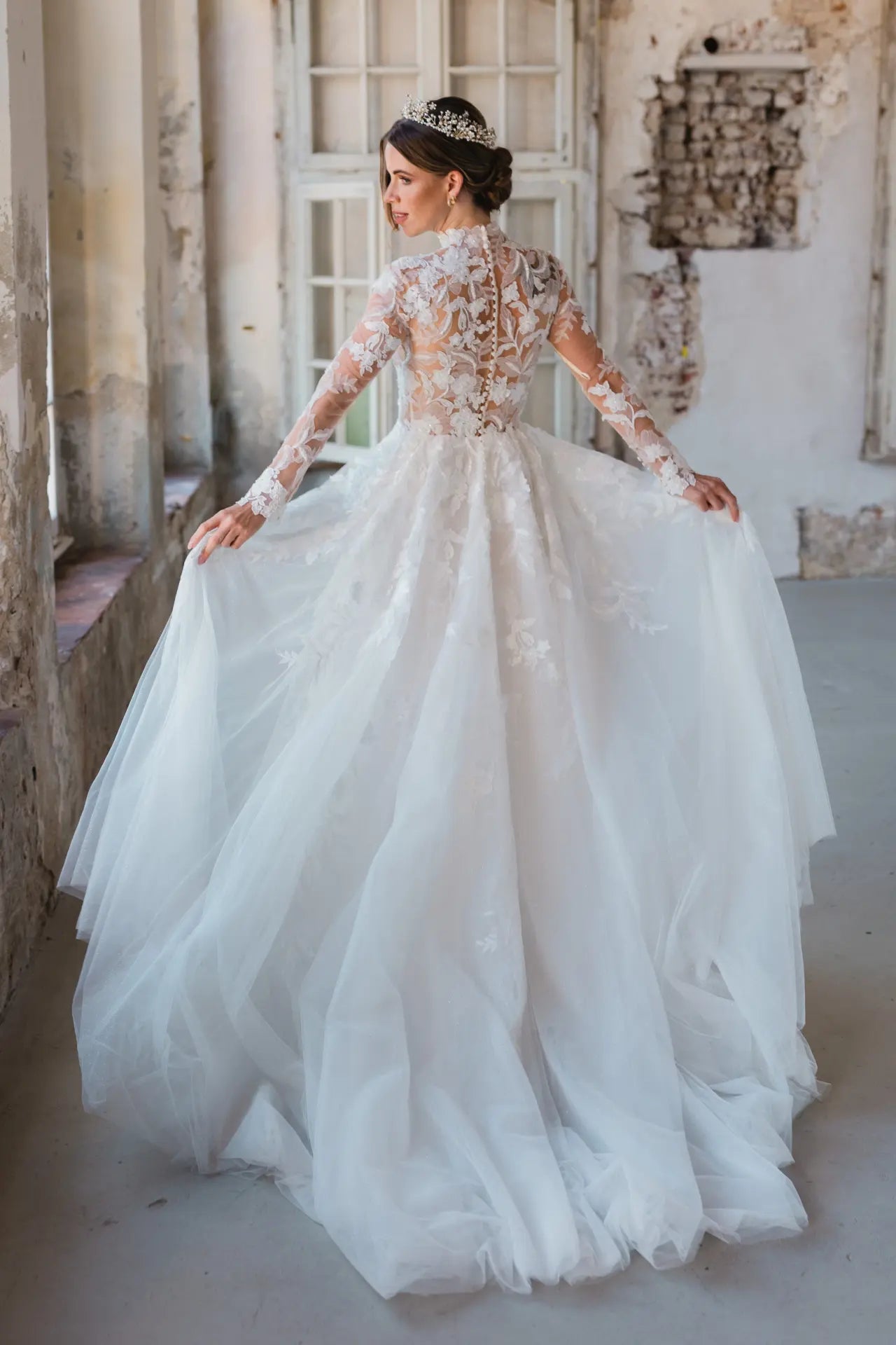 Bist du auf der Suche nach einem aufregenden Traumkleid, das elegant und sexy zugleich ist? Dann ist BG23-37 genau das Kleid, nach dem du schon immer gesucht hast! Mit diesem ausgefallenen Design hat der Designer hier einen Traum für alle Couture-Liebhaberinnen geschaffen. Das hochgeschlossene Kleid aus feiner, eleganter Spitze, transparentem Netz und voluminösem Tüll versprüht einen besonderen Glam! Die aufregende transparente Corsage bietet mit ihren eingearbeiteten Stäben und nudefarbenen Push-up-Cups tollen Halt für alle Größen. Die verspielte florale Spitze breitet sich über die gesamte Corsage, den hohen Ausschnitt und die langen Ärmel aus, bis sie in den fließenden Tüllrock übergeht und in der langen Schleppe endet. Das hautfarbene Netz sorgt für einen tollen Tattoo-Effekt und hinterlässt den Eindruck, dass die Spitze auf der Haut aufliegt. Die edle Spitze wird durch kleine aufgenähte Glasperlen abgerundet, die wunderschöne Akzente setzen. Besonders schöne Details finden sich am Rock und am Rücken: die stoffbesetzten Zierknöpfe, die vom Hals über den gesamten Rücken verlaufen, eine Schicht Glitzertüll für eine Extraportion Glanz und ein sexy Beinschlitz.