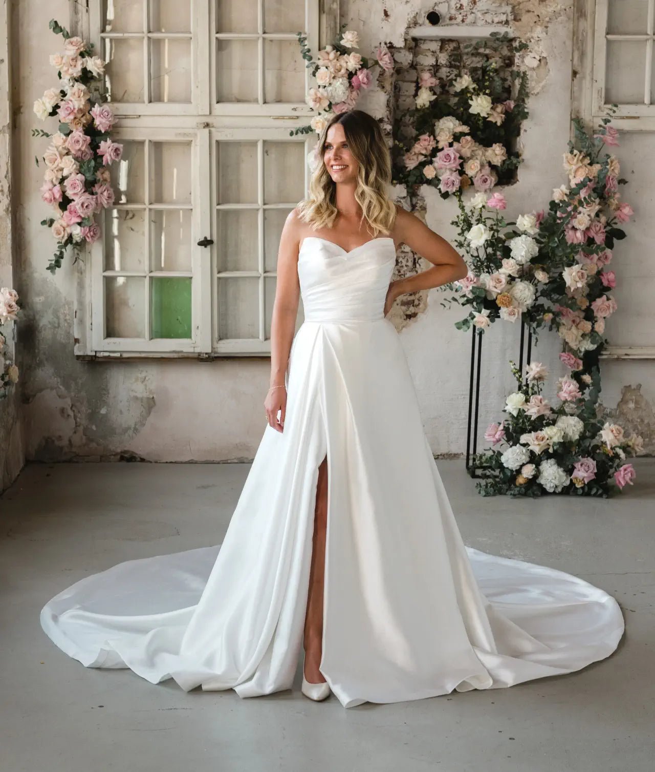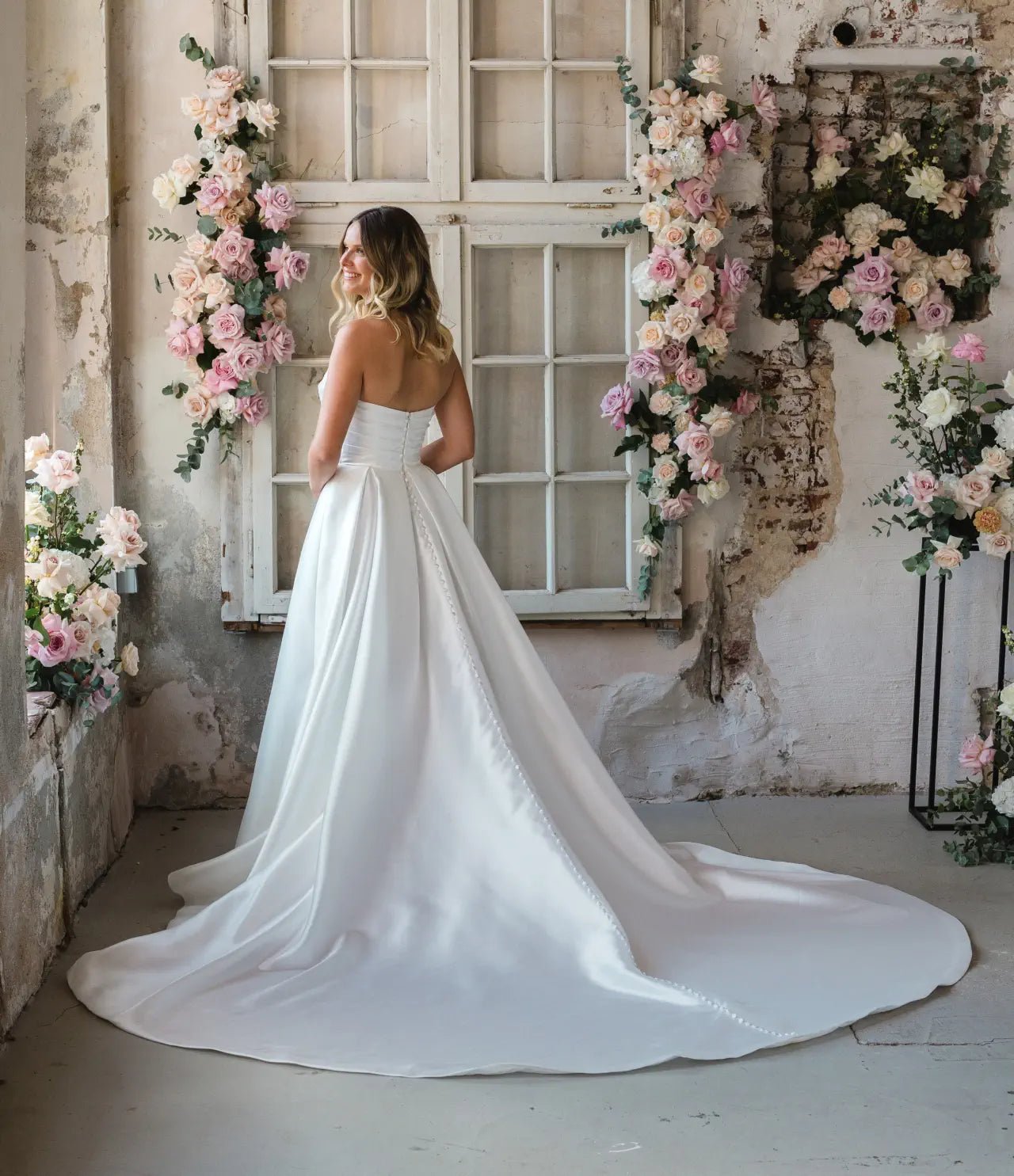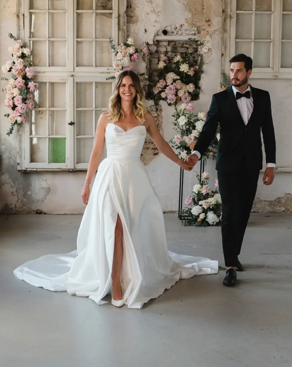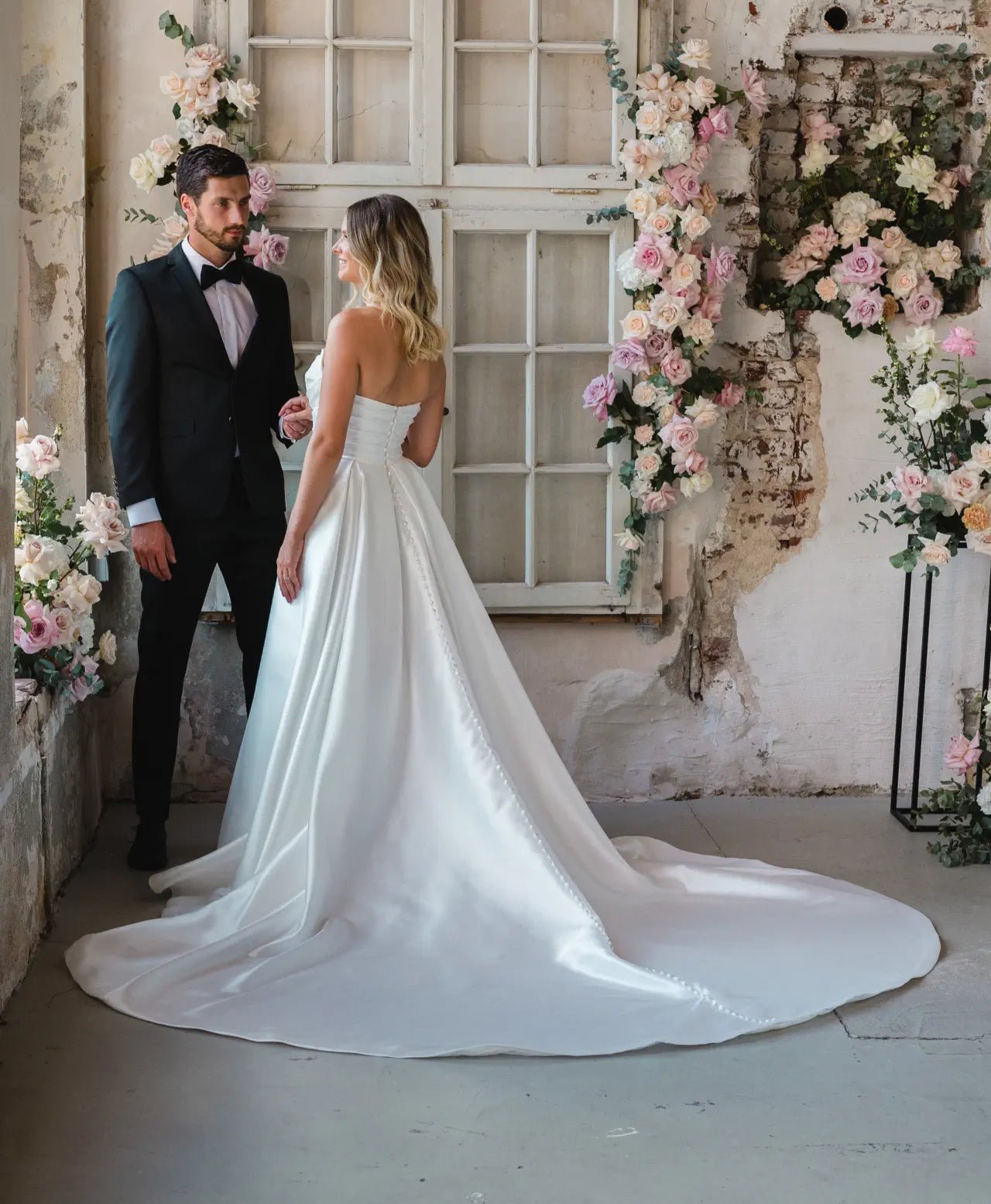 Dieser elegante Traum aus Mikado-Seide verspricht pure Eleganz. Der schlichte und klassische Schnitt sorgt für einen tollen Auftritt an deinem Hochzeitstag. Das raffinierte Oberteil besticht durch seine Rüschen und den schulterfreien, angedeuteten herzförmigen Ausschnitt. Durch die Anordnung der Falten schmeichelt dieses Traumkleid jeder Figur und zaubert nicht nur ein tolles Dekolleté, sondern auch eine sehr schöne und verschmälert Taille. Der ausgestellte Tellerrock sieht herrlich elegant aus und sorgt mit der langen Schleppe für einen besonders eleganten Auftritt. Der sexyness Beinschlitz sorgt für ein wunderschönes Highlight und absolute Bewegungsfreiheit. Die feinen, mit Stoff besetzten Zierknöpfe verlaufen vom Rücken bis zur langen Schleppe und sorgen hier noch einmal für ein aufregendes Detail. Du willst dieses Traumkleid an deinem großen Tag tragen? Dann probiere es bei einem Bridonista-Händler an und verliebe dich.