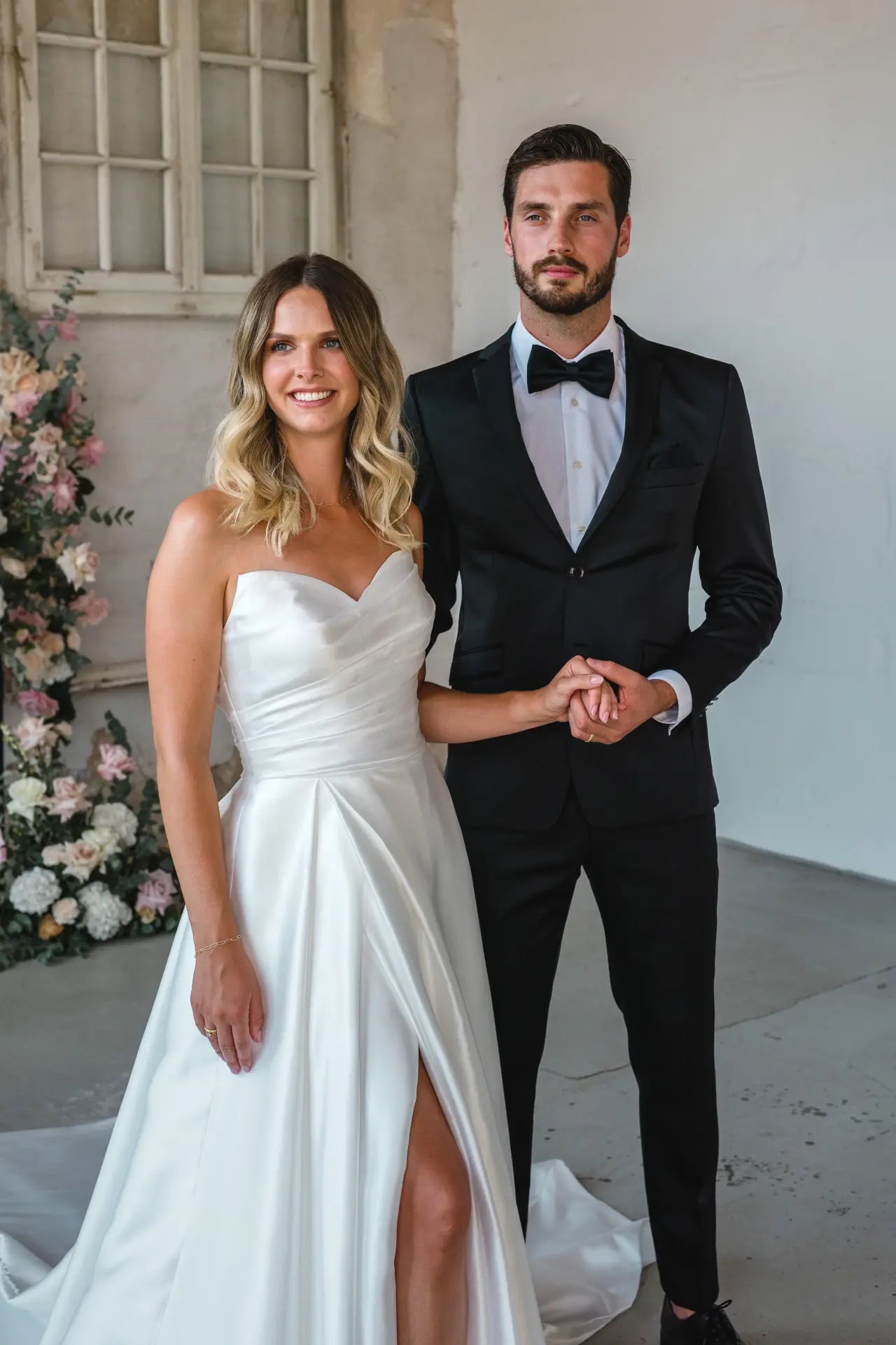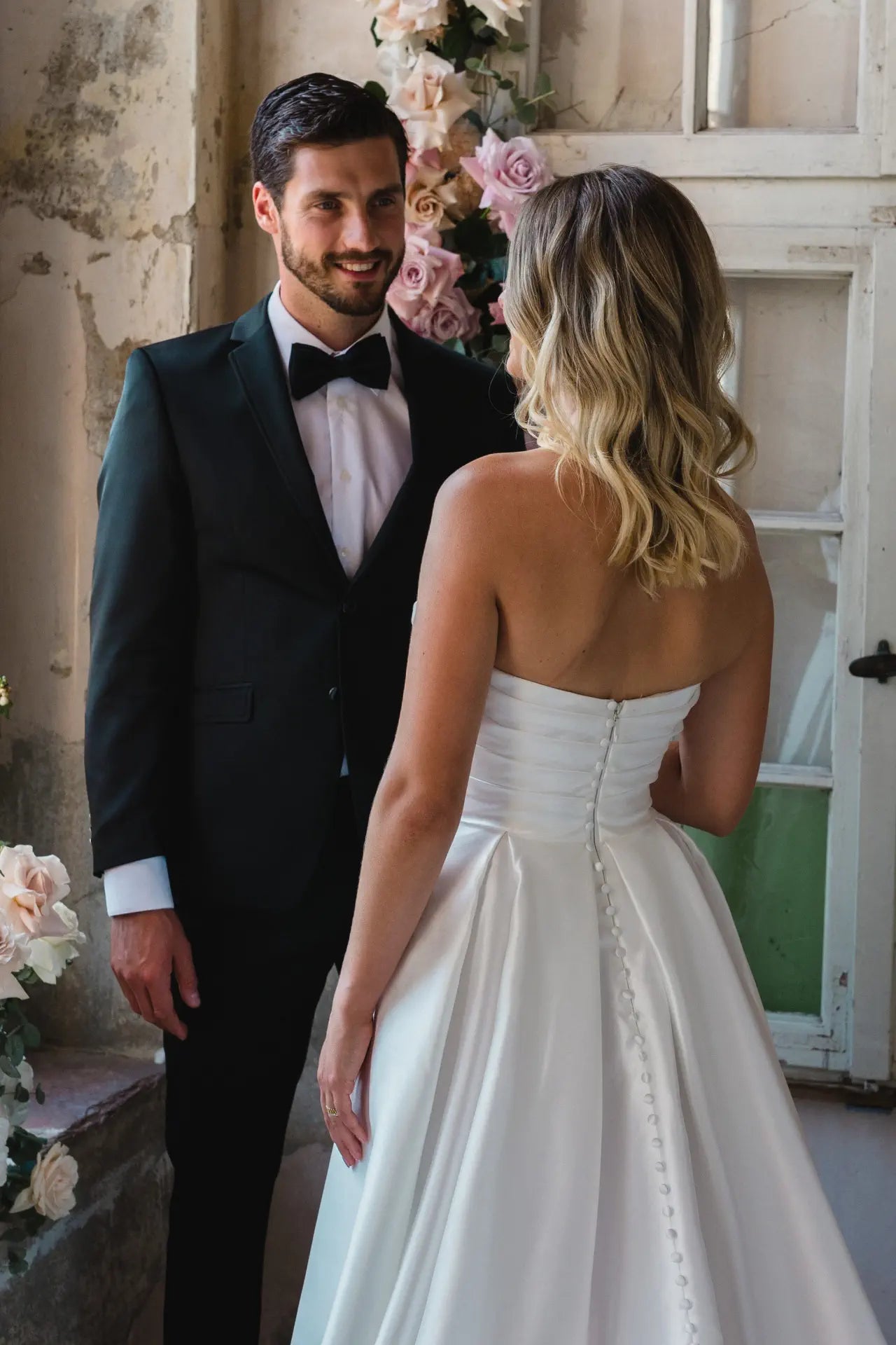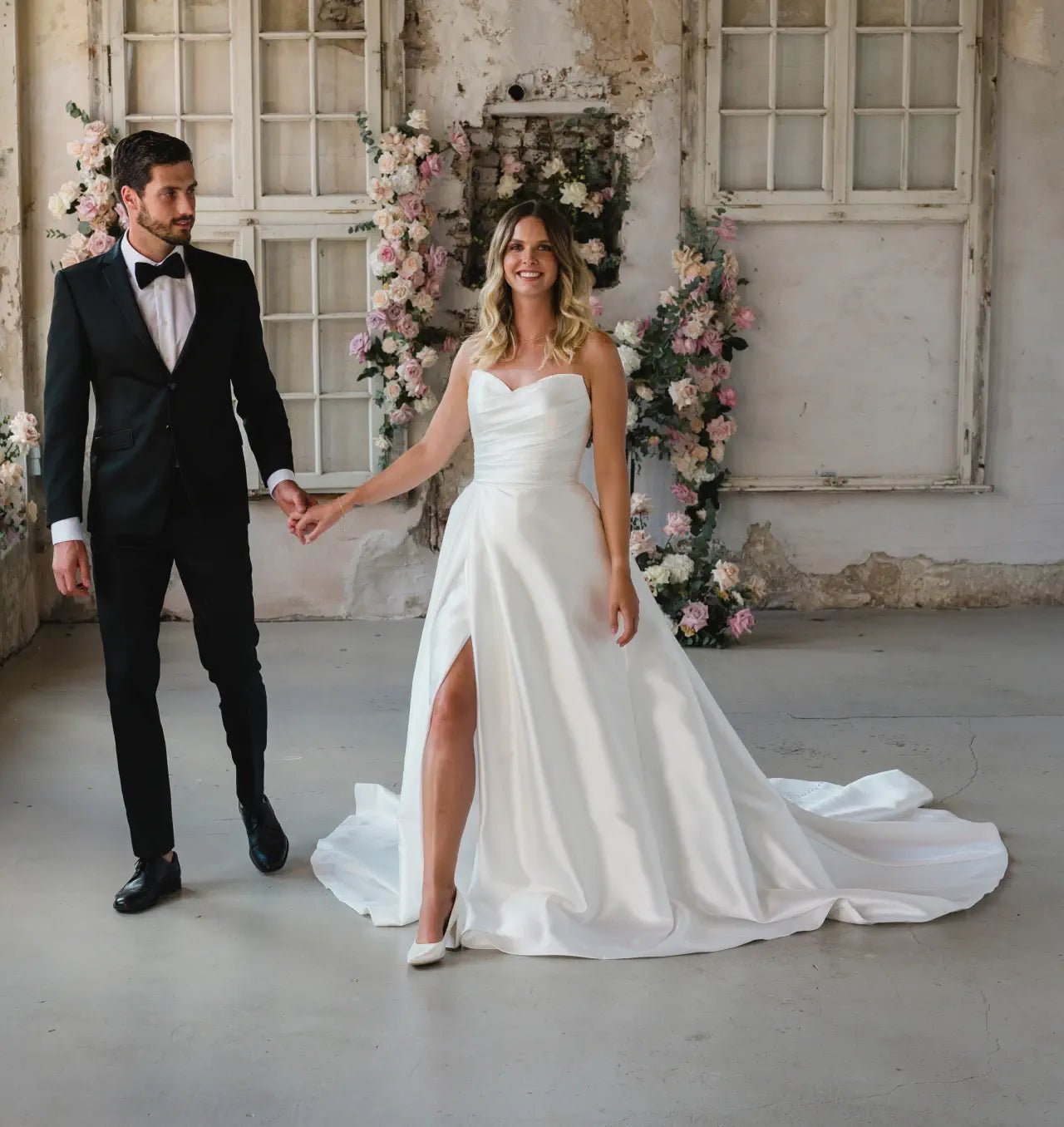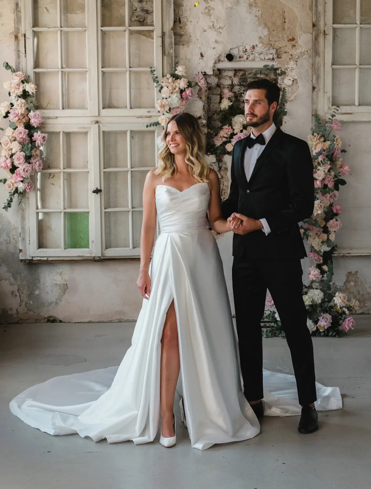 Dieser elegante Traum aus Mikado-Seide verspricht pure Eleganz. Der schlichte und klassische Schnitt sorgt für einen tollen Auftritt an deinem Hochzeitstag. Das raffinierte Oberteil besticht durch seine Rüschen und den schulterfreien, angedeuteten herzförmigen Ausschnitt. Durch die Anordnung der Falten schmeichelt dieses Traumkleid jeder Figur und zaubert nicht nur ein tolles Dekolleté, sondern auch eine sehr schöne und verschmälert Taille. Der ausgestellte Tellerrock sieht herrlich elegant aus und sorgt mit der langen Schleppe für einen besonders eleganten Auftritt. Der sexyness Beinschlitz sorgt für ein wunderschönes Highlight und absolute Bewegungsfreiheit. Die feinen, mit Stoff besetzten Zierknöpfe verlaufen vom Rücken bis zur langen Schleppe und sorgen hier noch einmal für ein aufregendes Detail. Du willst dieses Traumkleid an deinem großen Tag tragen? Dann probiere es bei einem Bridonista-Händler an und verliebe dich.