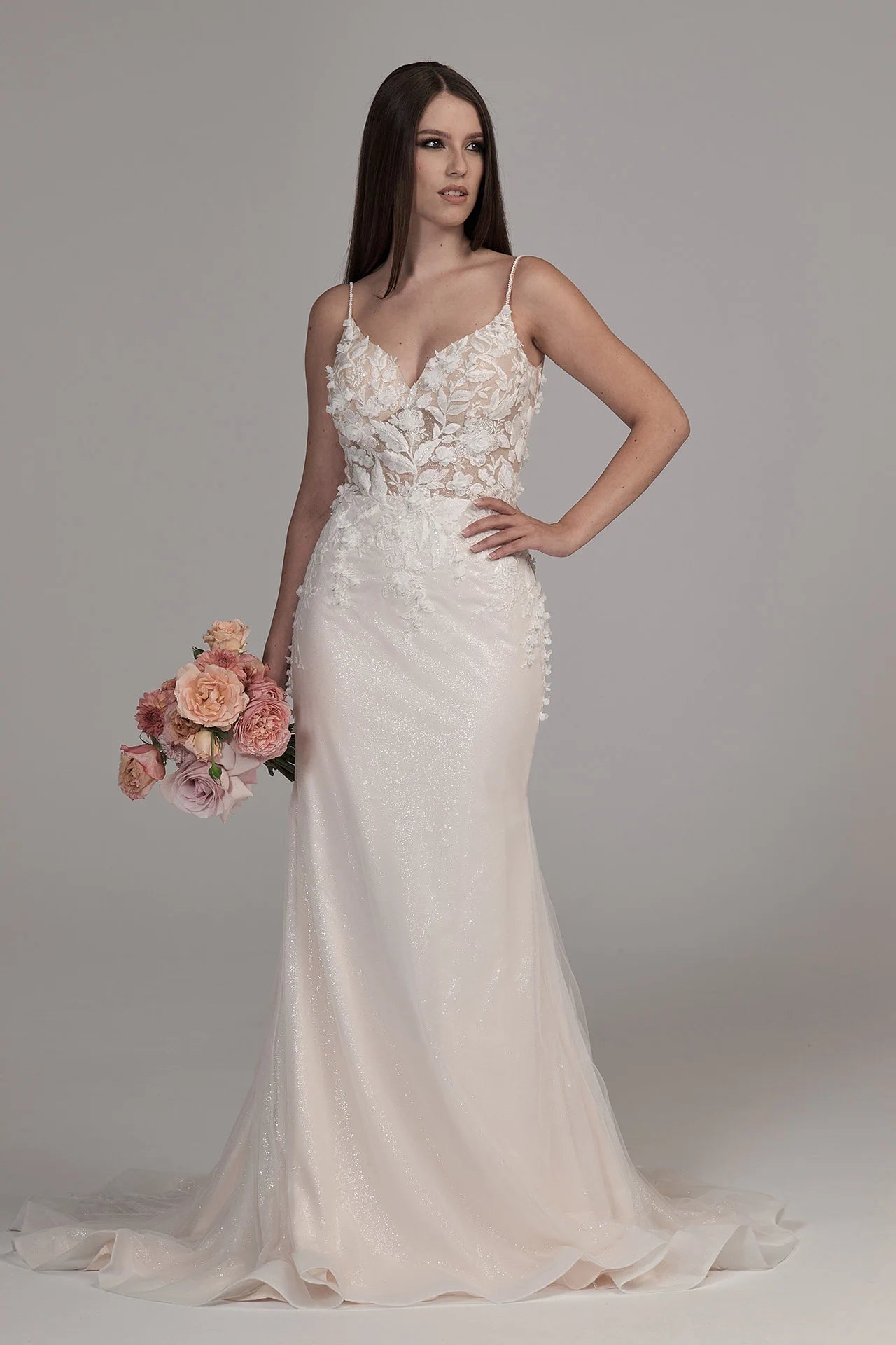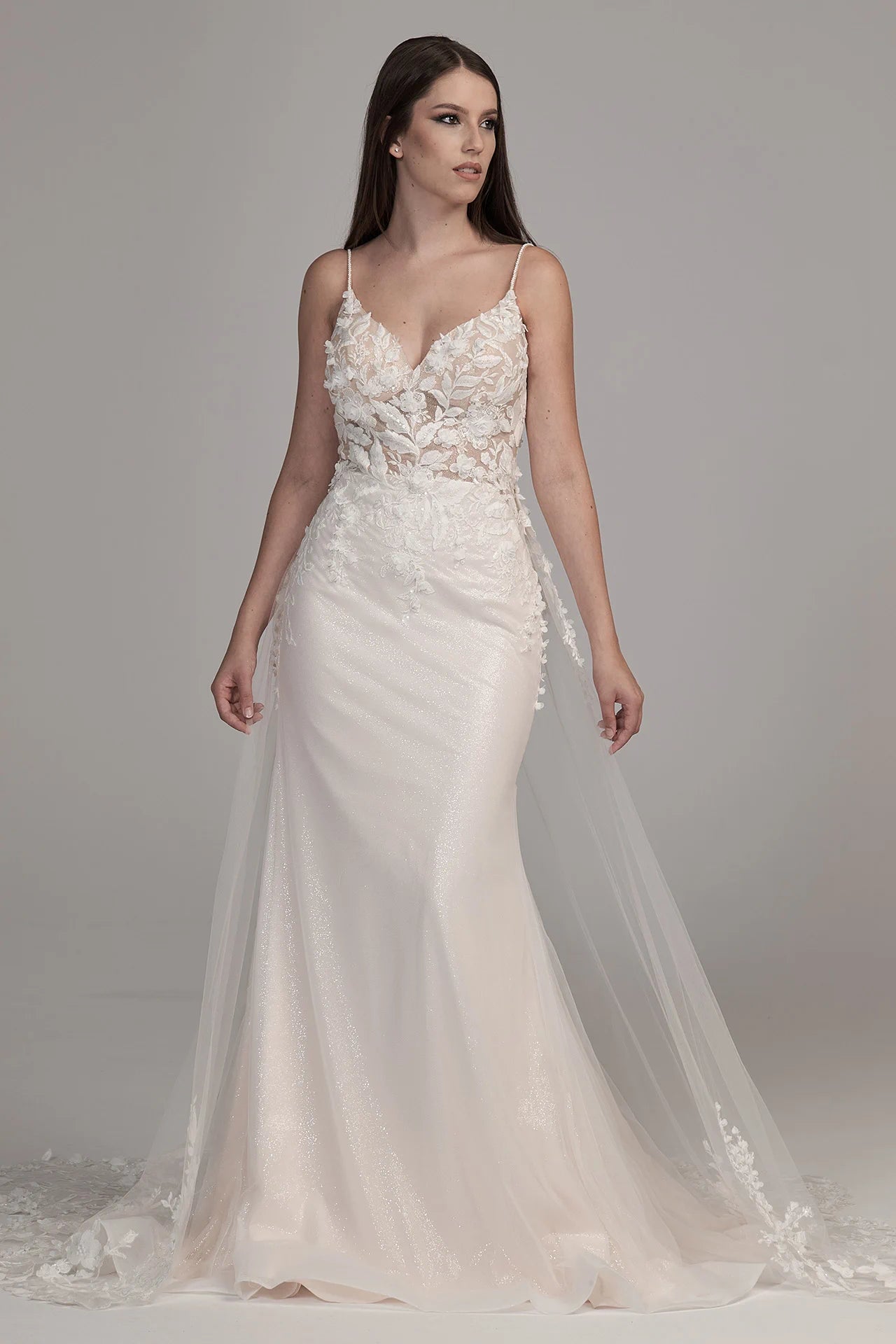 Sei die bestgekleidete Bridonista in dem Bridonista BG24-11! Dieses romantische Hochzeitskleid in Flare-Form hat einen V-Ausschnitt, eine kurze Schleppe und glamouröse 3D-Spitze für einen klassischen Look. Der Überrock und die verspielten Cut-Outs sorgen für einen Hauch von Spaß, während der Tüll und die Spaghetti-Träger das Kleid leicht und luftig halten. Mit dem Schlüsselloch-Rücken ziehst du die ganze Nacht lang alle Blicke auf dich! Mit der Glam-Kollektion kannst du deinen Look aufpeppen. Damit schwebst du unbeschwert durch den Traualtar! Ganz zu schweigen davon, dass du deinen Look mit extra viel Glitzer und Glamour aufpeppen kannst. Satin und Pailletten setzen besondere Details in Szene wie nie zuvor. Eines ist sicher: Du wirst die Schönheit des Balls sein!