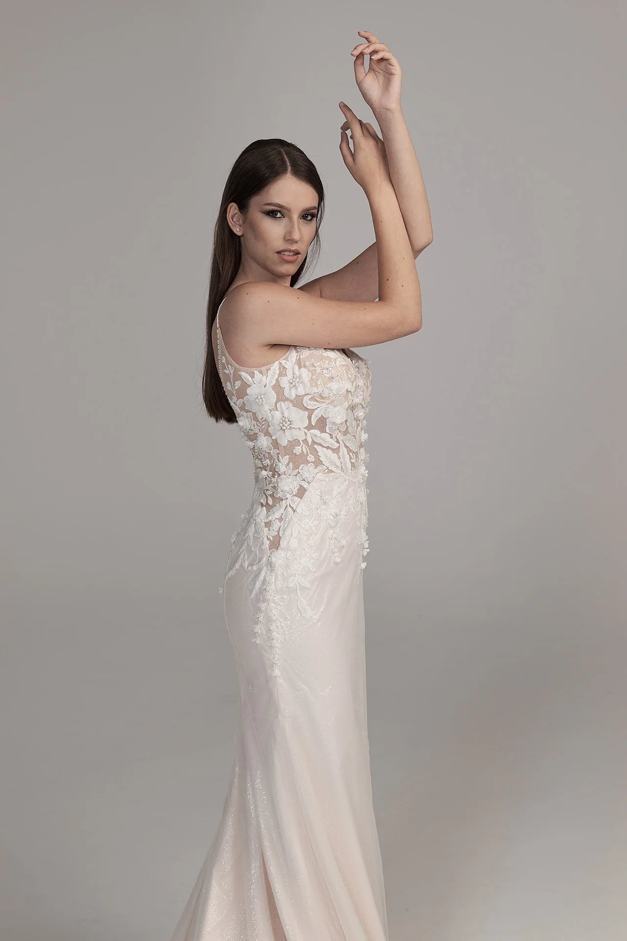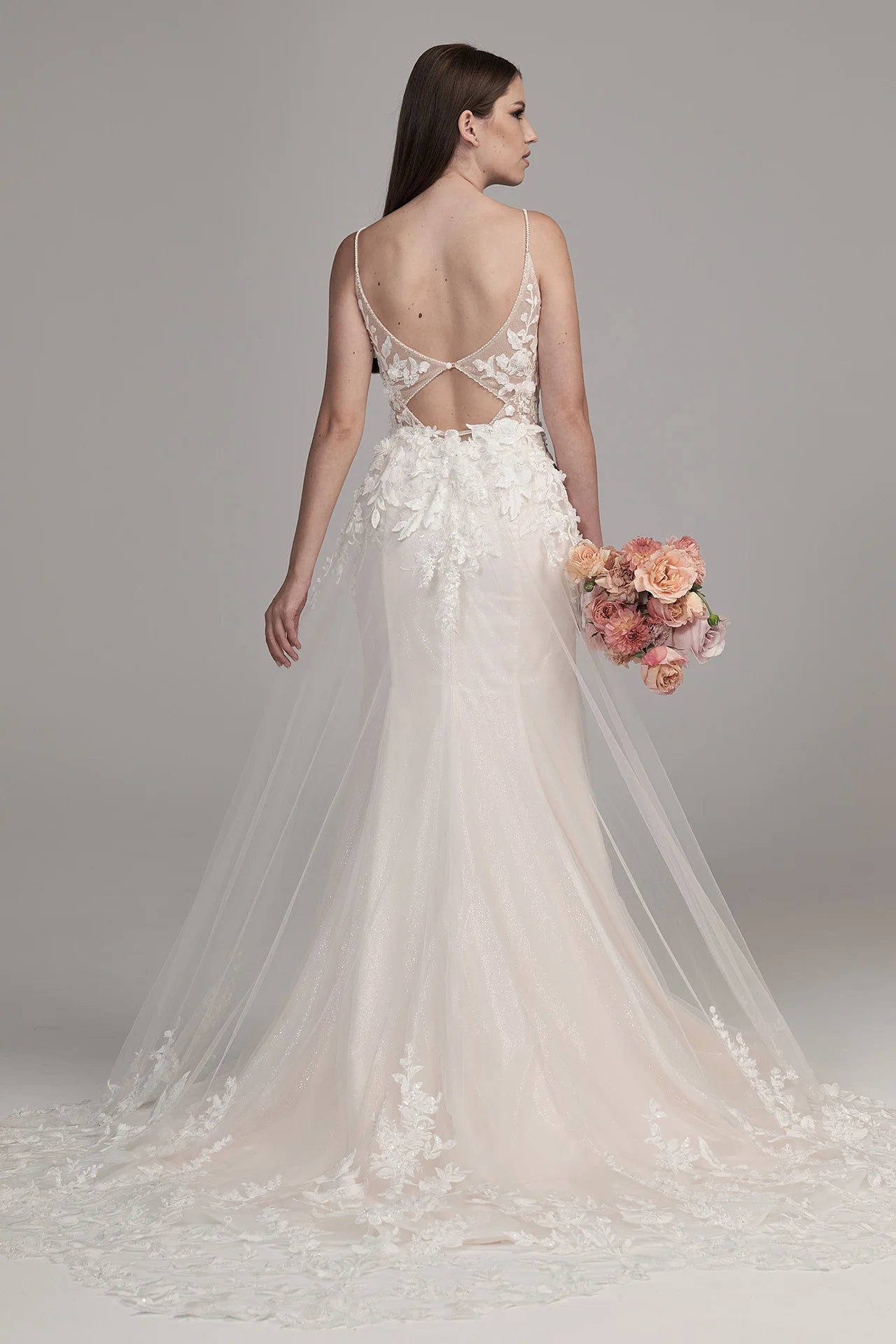 Corsage: Ivory Spitze, Ivory Tüll, Ivory Chantilly/ Ivory Tüll; - Rock: Elfenbeinfarbener Tüll, Elfenbeinfarbener Tüll, Elfenbeinfarbenes Innenfutter. Dieses Brautkleid wird nur mit Materialien in Ivory hergestellt.