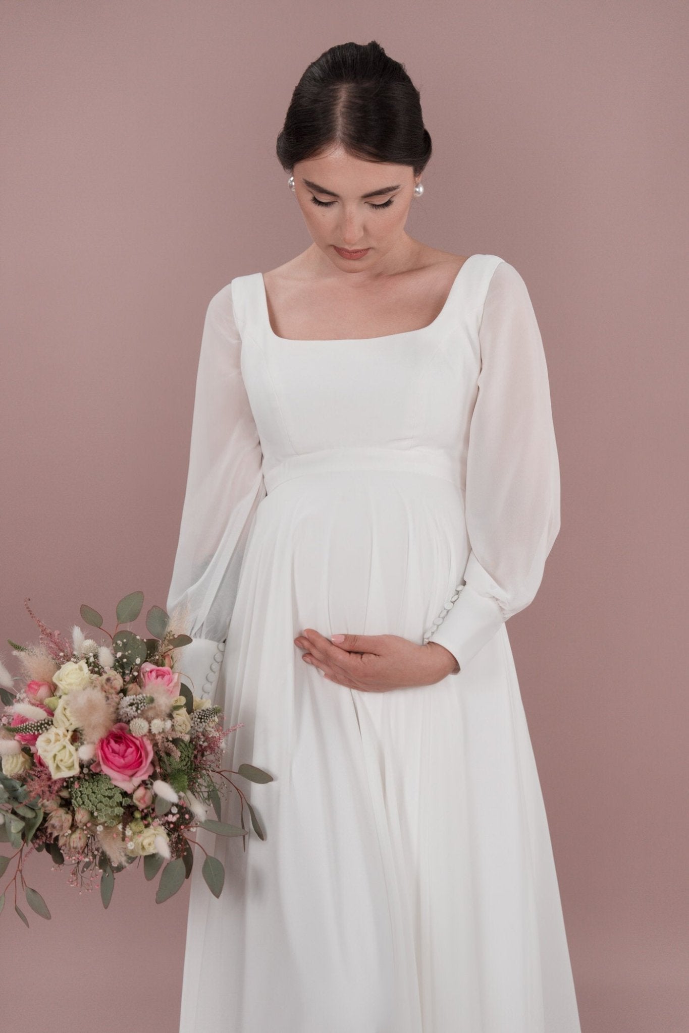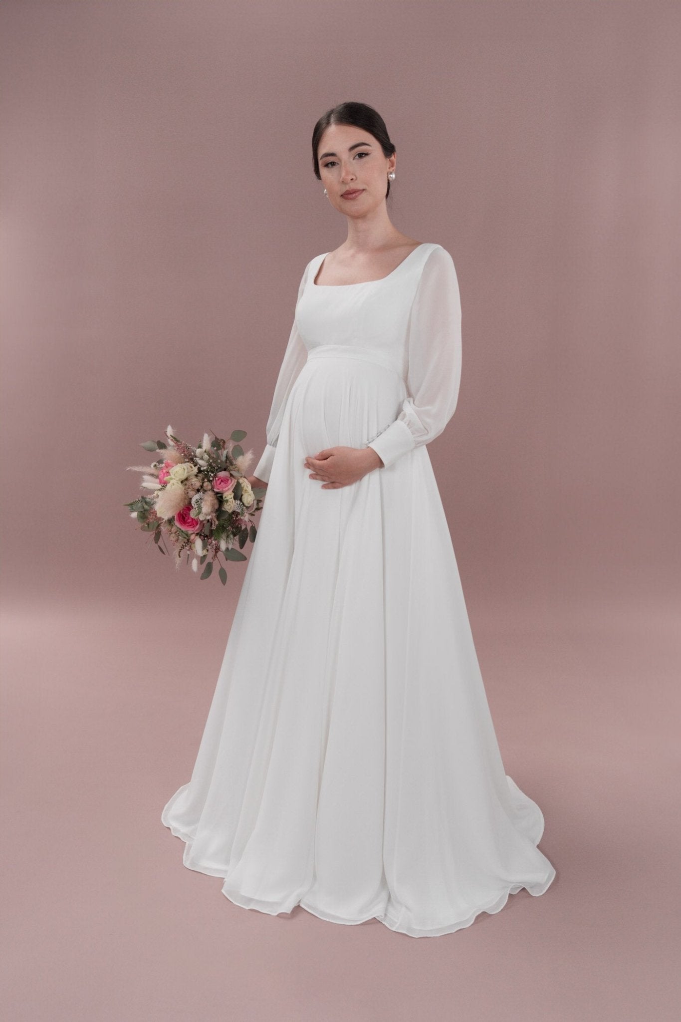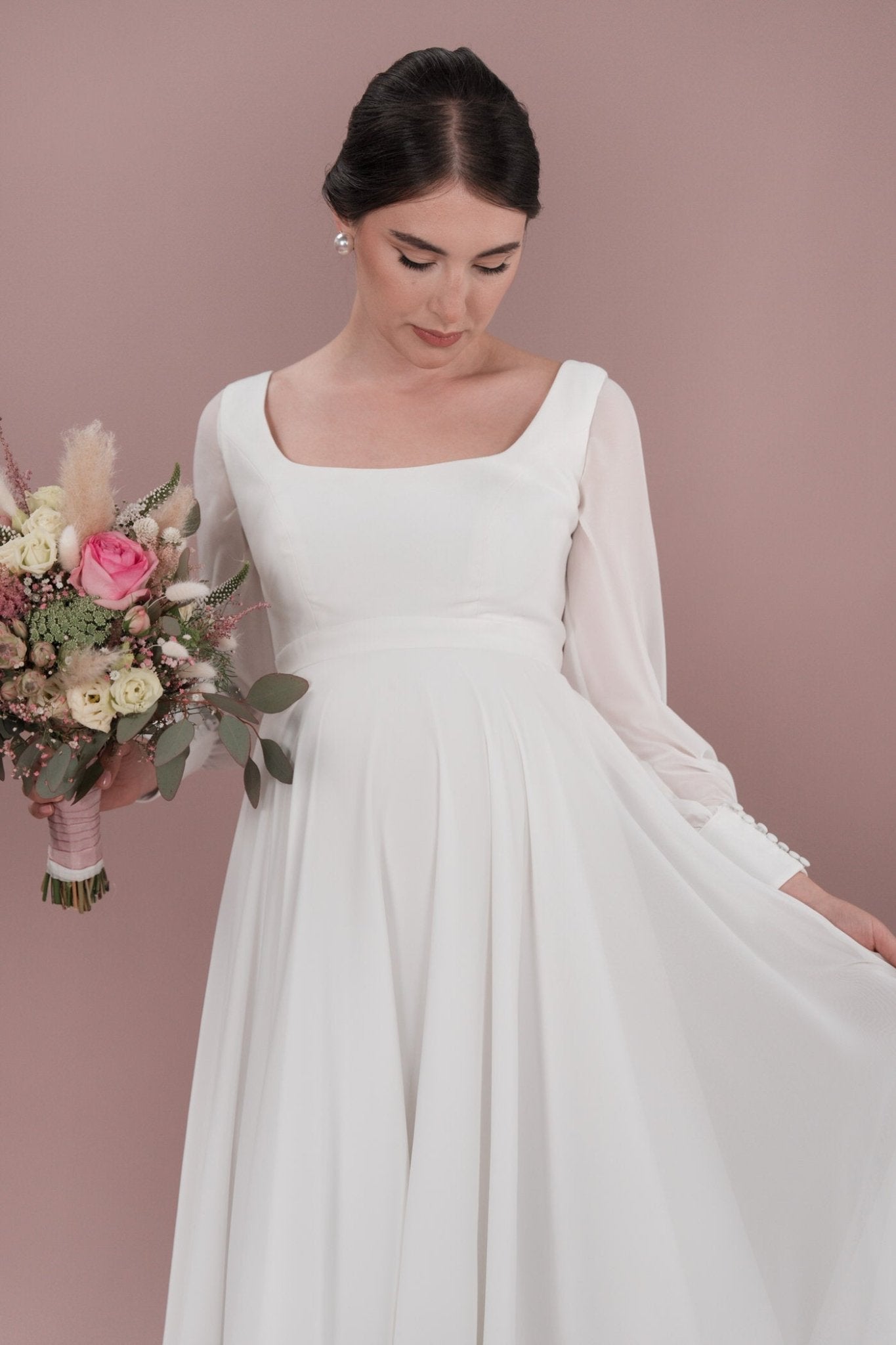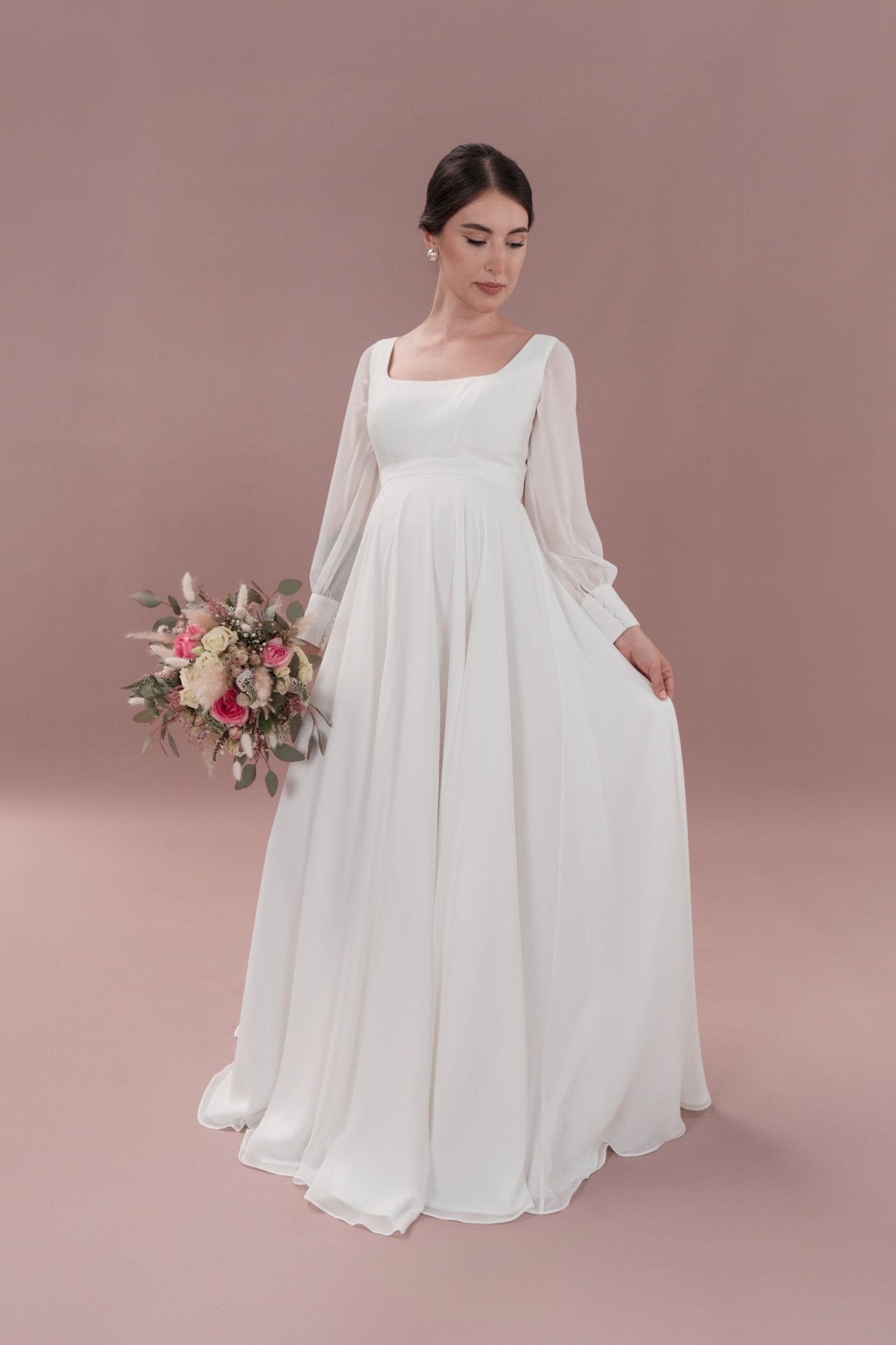 Als leidenschaftlicher Bridonista bist du auf der Suche nach dem perfekten Brautkleid für deine standesamtliche Hochzeit während der Schwangerschaft? Unser BM25-03 Umstandsbrautkleid bietet dir dank abnehmbarer Ärmel, Schnür- oder Reißverschlussoption am Rücken und einer bequemen Empire-Silhouette sowohl Komfort als auch klassischen Stil. Es ist aus zartem Chiffon gefertigt, hat einen quadratischen Ausschnitt mit schlichter Corsage und eine cleane, gerade Rückenpartie. Lasse dich von unseren Ballonärmeln verzaubern und fühle dich wie eine strahlende Braut auf deiner Zeremonie! Genieße dein Leben als schwangere Braut ohne Kompromisse dank unseres BM25-03 Umstandsbrautkleids! Mit abnehmbaren Ärmeln, Schnür- oder Reißverschlussoption am Rücken und einer bequemen Empire-Silhouette vereint es Komfort und klassischen Stil. Zartes Chiffon, ein quadratischer Ausschnitt mit schlichter Corsage und eine cleane, gerade Rückenpartie machen dieses Kleid zu einem Traum für jede Braut. Ergänzt wird das Design durch zauberhafte Ballonärmel, die dich auf deiner Zeremonie strahlen lassen werden!