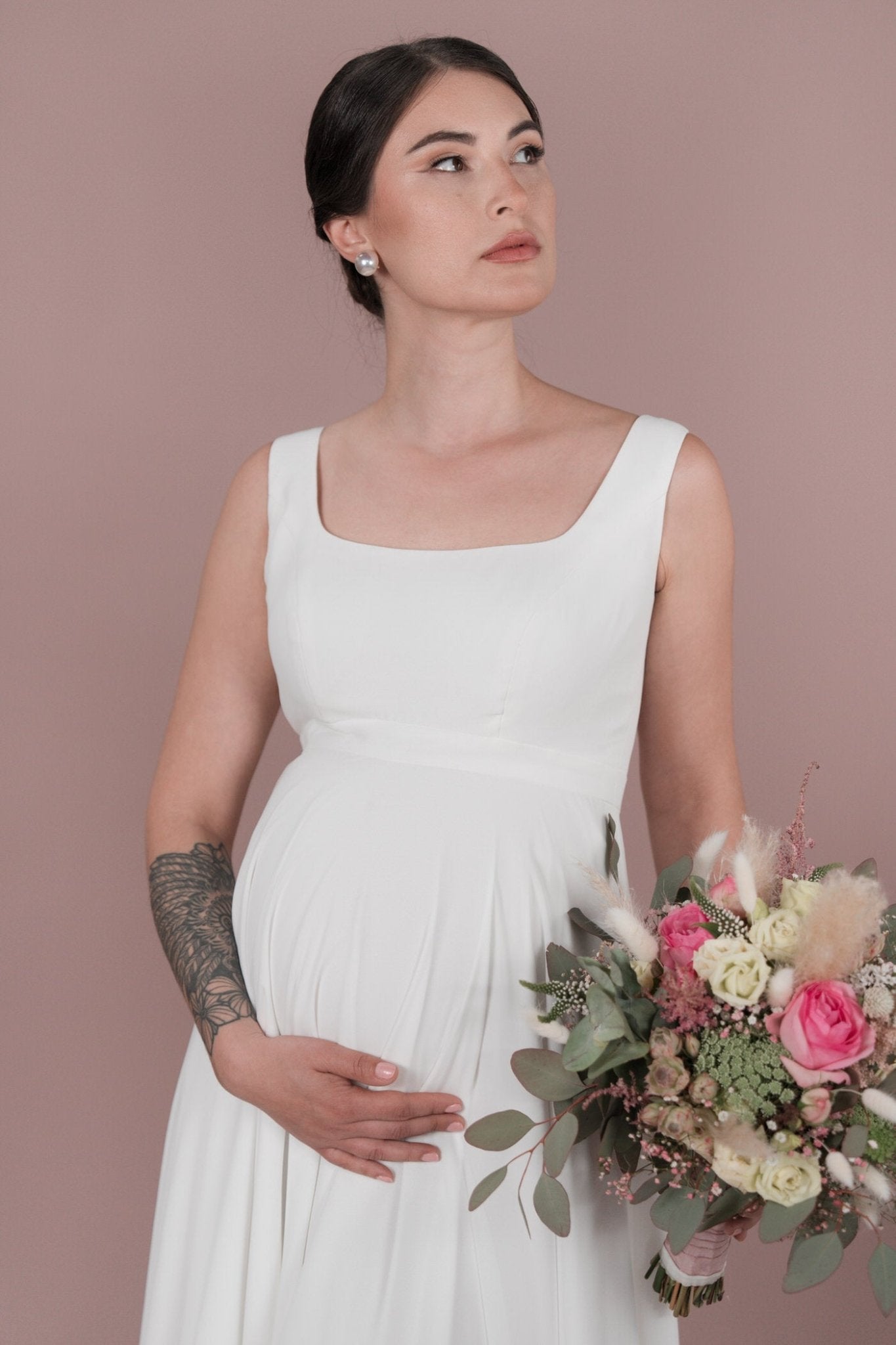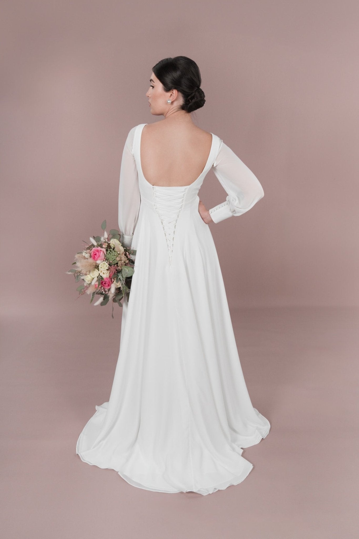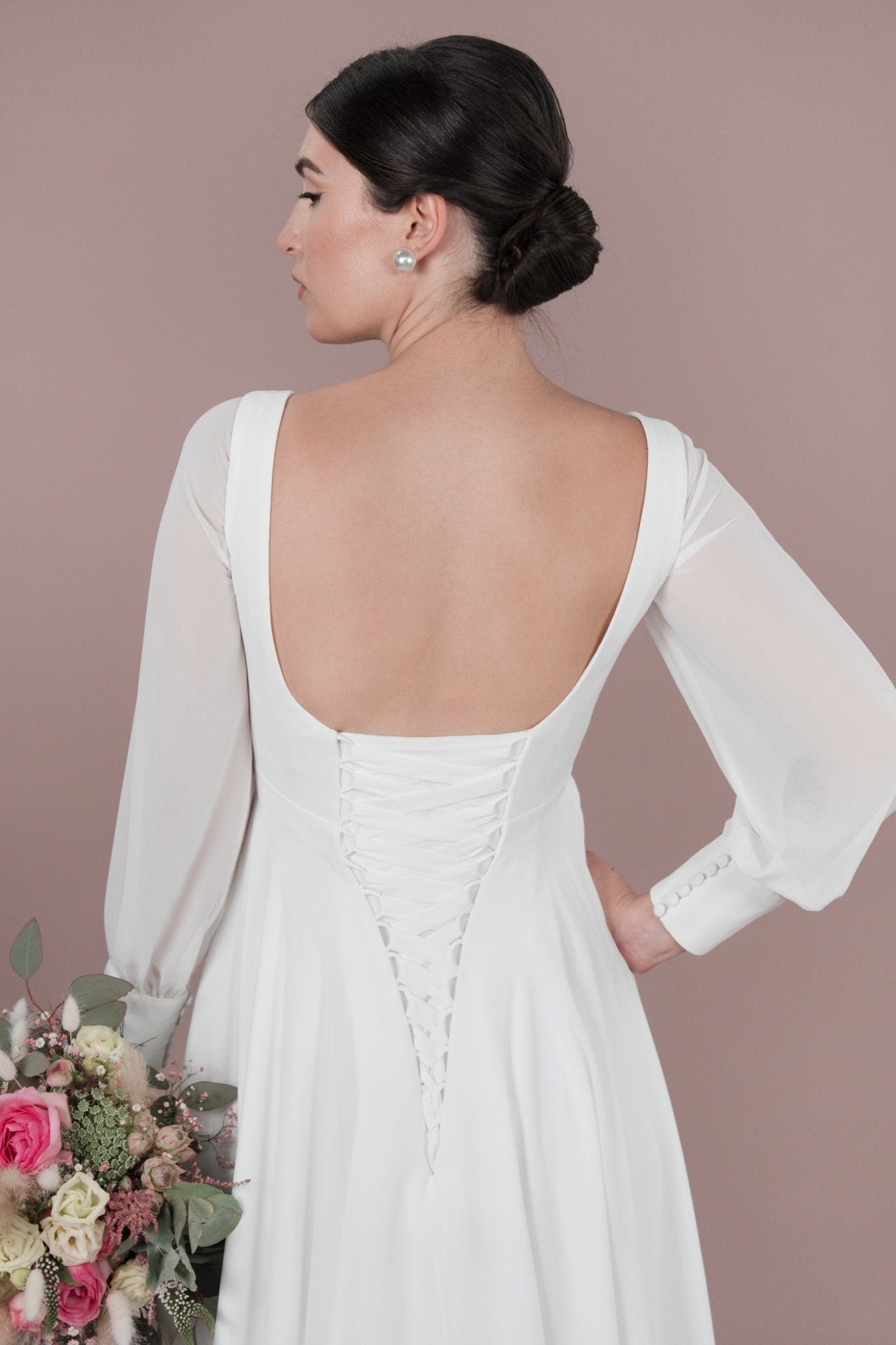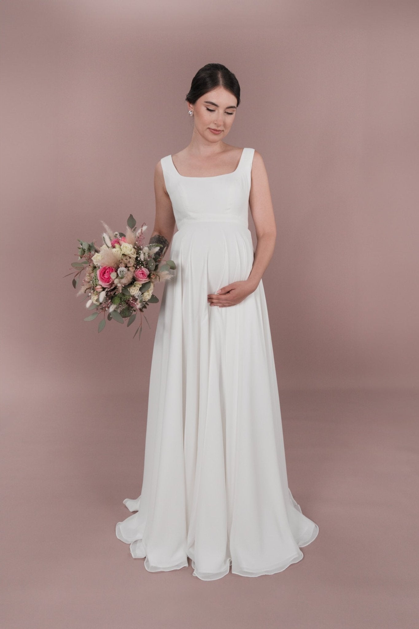 Als leidenschaftlicher Bridonista bist du auf der Suche nach dem perfekten Brautkleid für deine standesamtliche Hochzeit während der Schwangerschaft? Unser BM25-03 Umstandsbrautkleid bietet dir dank abnehmbarer Ärmel, Schnür- oder Reißverschlussoption am Rücken und einer bequemen Empire-Silhouette sowohl Komfort als auch klassischen Stil. Es ist aus zartem Chiffon gefertigt, hat einen quadratischen Ausschnitt mit schlichter Corsage und eine cleane, gerade Rückenpartie. Lasse dich von unseren Ballonärmeln verzaubern und fühle dich wie eine strahlende Braut auf deiner Zeremonie! Genieße dein Leben als schwangere Braut ohne Kompromisse dank unseres BM25-03 Umstandsbrautkleids! Mit abnehmbaren Ärmeln, Schnür- oder Reißverschlussoption am Rücken und einer bequemen Empire-Silhouette vereint es Komfort und klassischen Stil. Zartes Chiffon, ein quadratischer Ausschnitt mit schlichter Corsage und eine cleane, gerade Rückenpartie machen dieses Kleid zu einem Traum für jede Braut. Ergänzt wird das Design durch zauberhafte Ballonärmel, die dich auf deiner Zeremonie strahlen lassen werden!