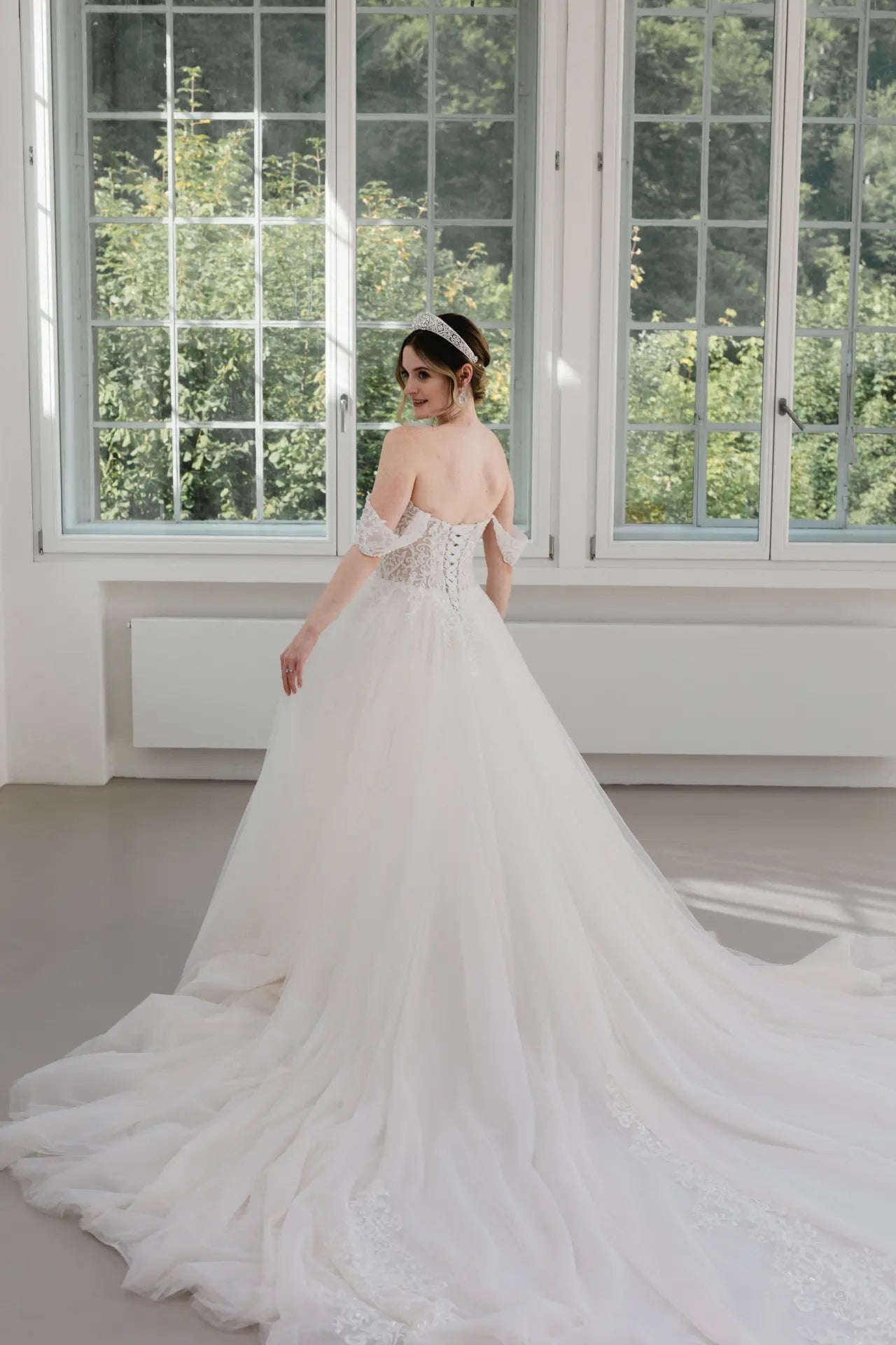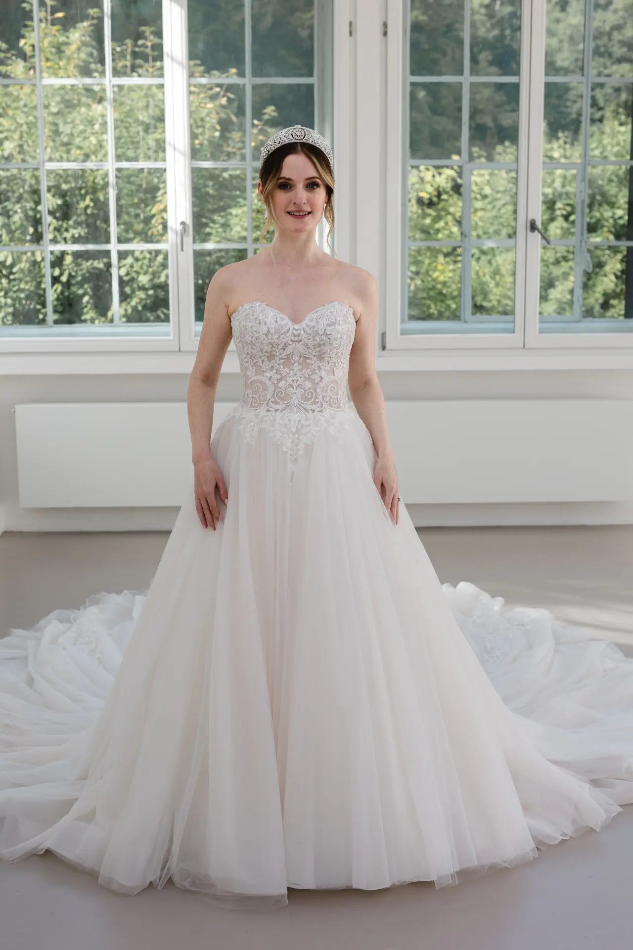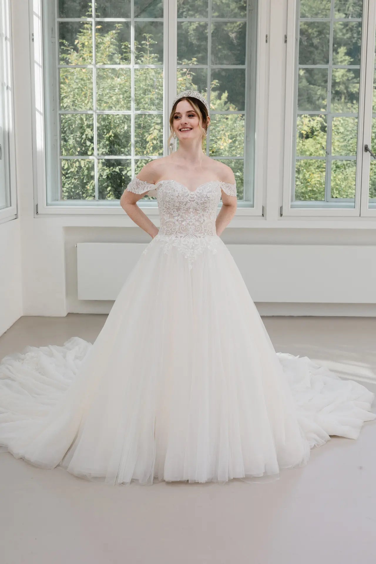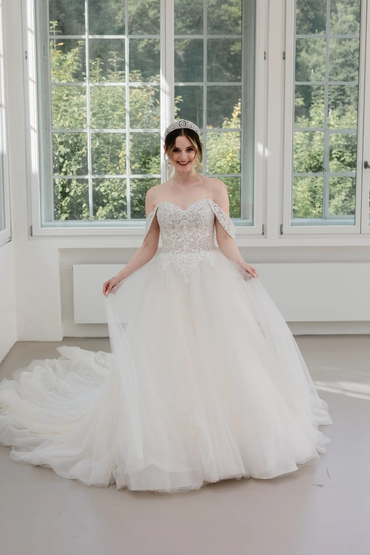 Hallo Aschenputtel, dieses Brautkleid wird dich verzaubern! Buche jetzt einen Beratungstermin bei einem Bridonista-Fachhändler und sage "Ja" zu deinem Traum-Hochzeitskleid. C23-08 ist die perfekte Balance aus klassischen und modernen Elementen der Brautmode und spiegelt die Essenz der Bridonista Classic Collection wider. Der klassische Herzchen-Ausschnitt wird von Trägern umrahmt, die über die Schultern hängen und eine romantische, feminine Silhouette lenken. Die Träger sind abnehmbar, so dass du deinen Brautlook mit wenigen Handgriffen verändern kannst. Die florale Spitze ergänzt die romantische Stimmung und verläuft organisch über die Corsage in den Rock. Einzelne Spitzenornamente sind von Hand mit Pailletten und Kristallen bestickt und verleihen einen dezenten Prinzessinnen-Touch. Das Markenzeichen dieser Kollektion sind die modernen Einflüsse des Lingerie-Looks. So ist die Corsage halbtransparent geschnitten und unterstreicht die Schönheit und Weiblichkeit der Frau. Für den perfekten Sitz verfügt dieses Bridonista-Design außerdem über eine starke Corsage und Push-up-Cups, damit du dich an deinem großen Tag selbstbewusst und wunderschön fühlen kannst. Der Tüllrock ist schlicht gehalten mit einer langen Schleppe (ca. 105 cm) für einen atemberaubenden Prinzessinnenmoment.