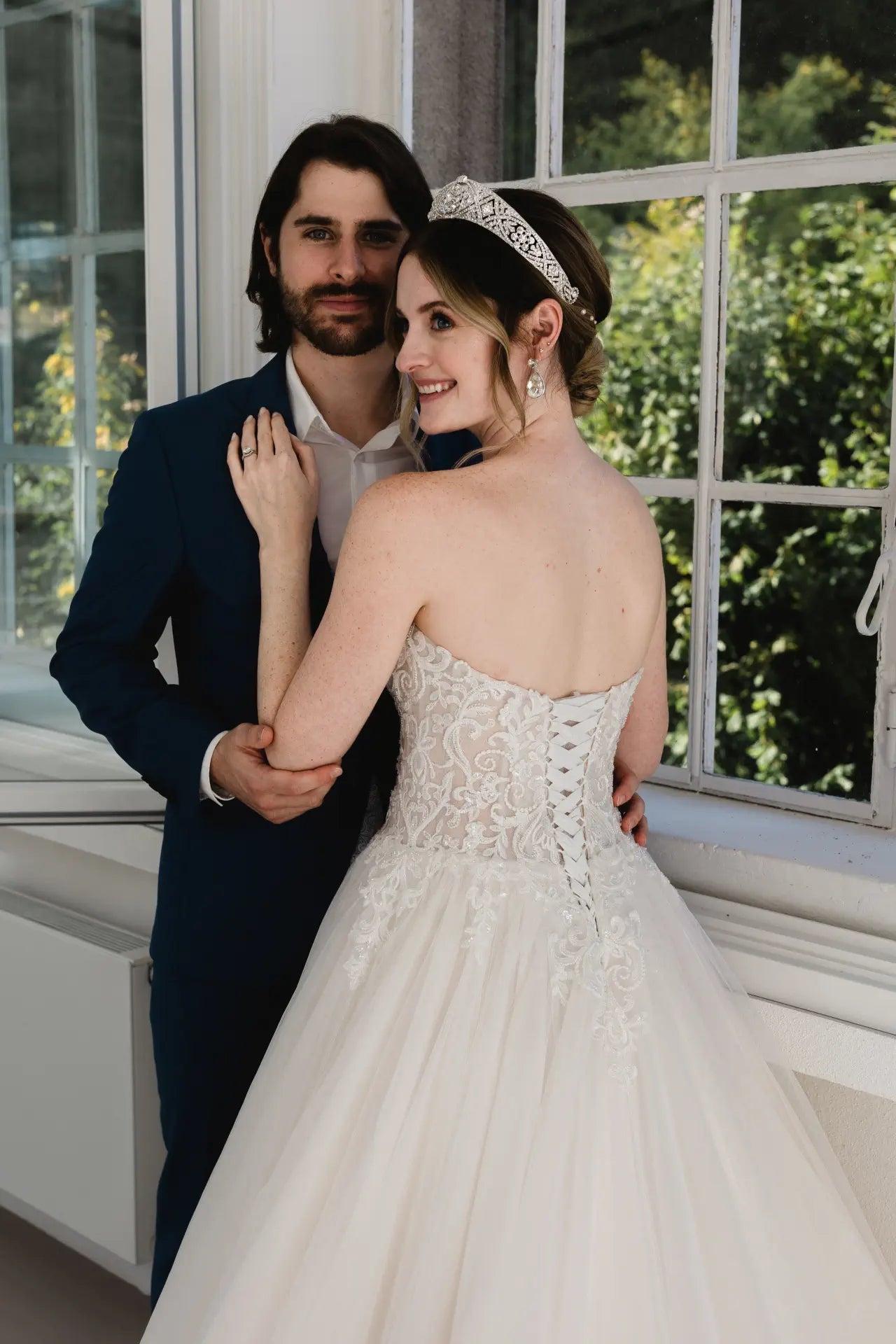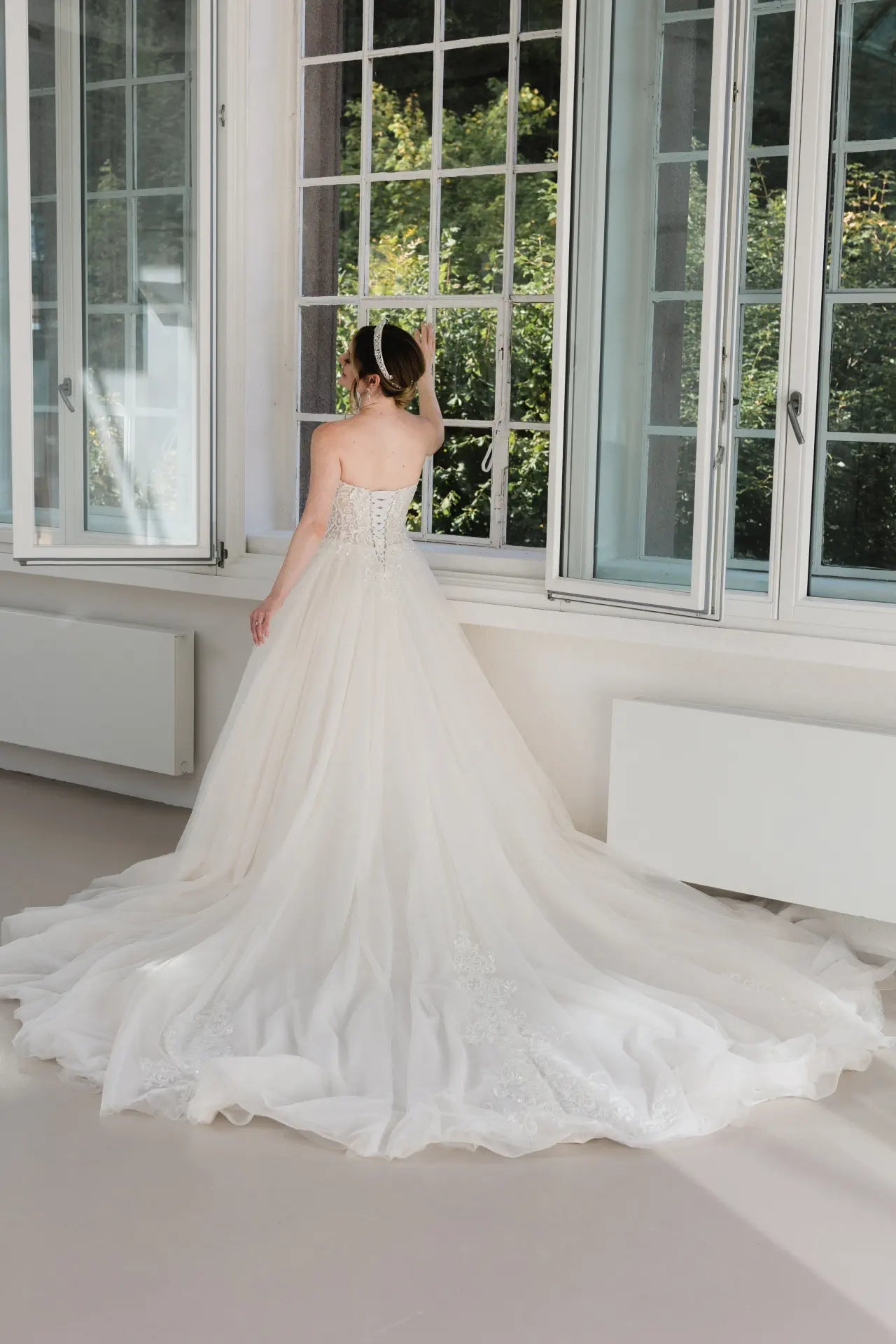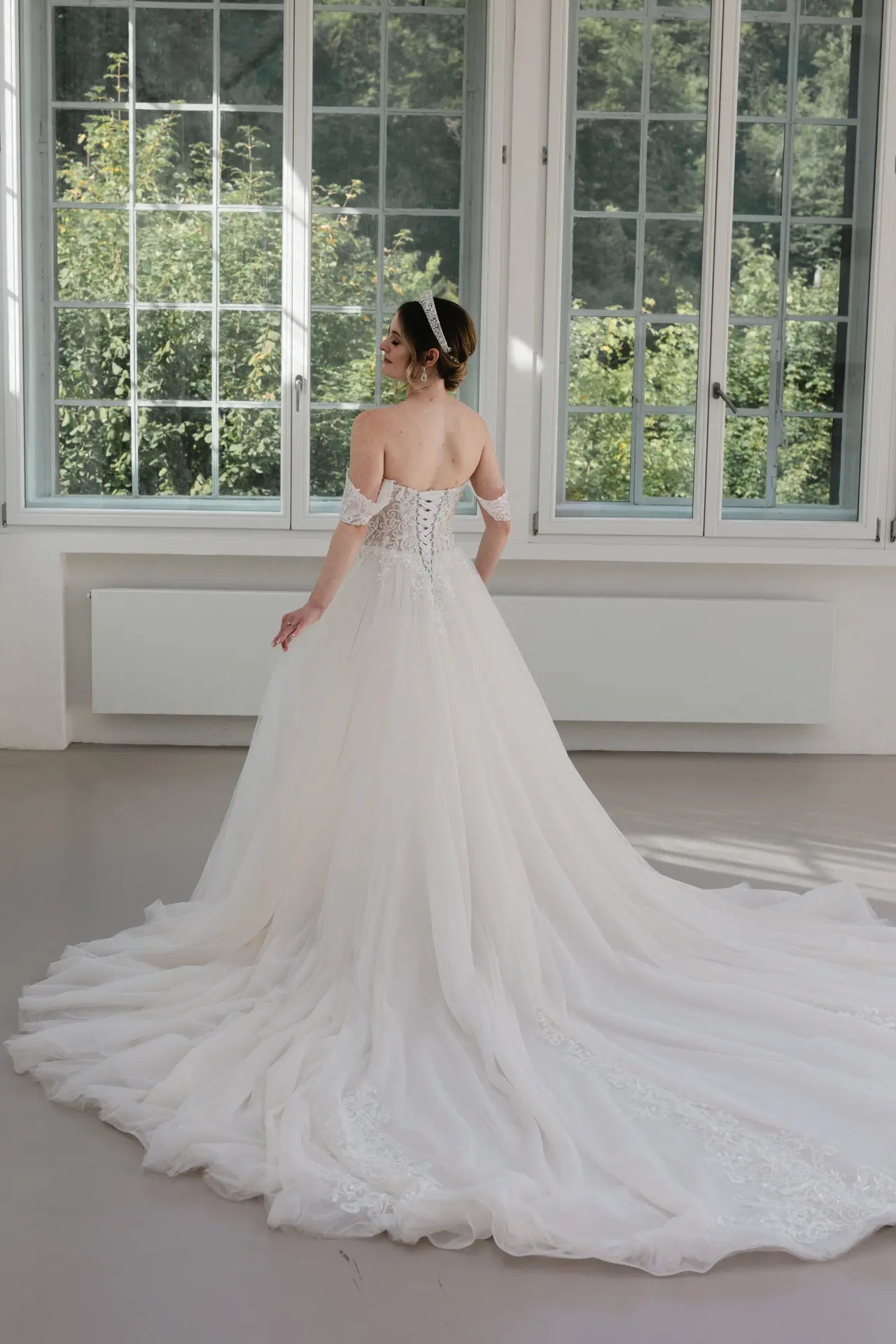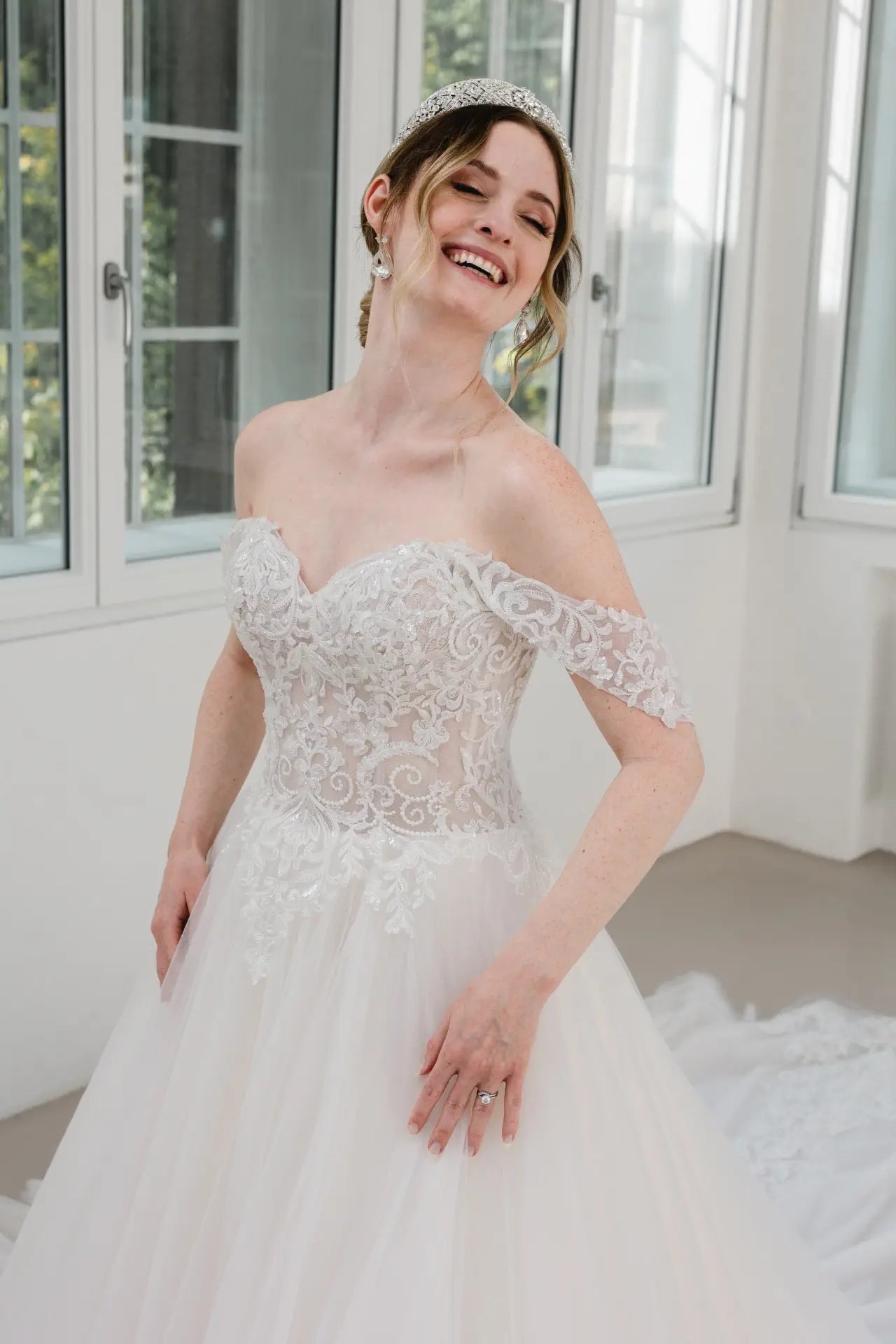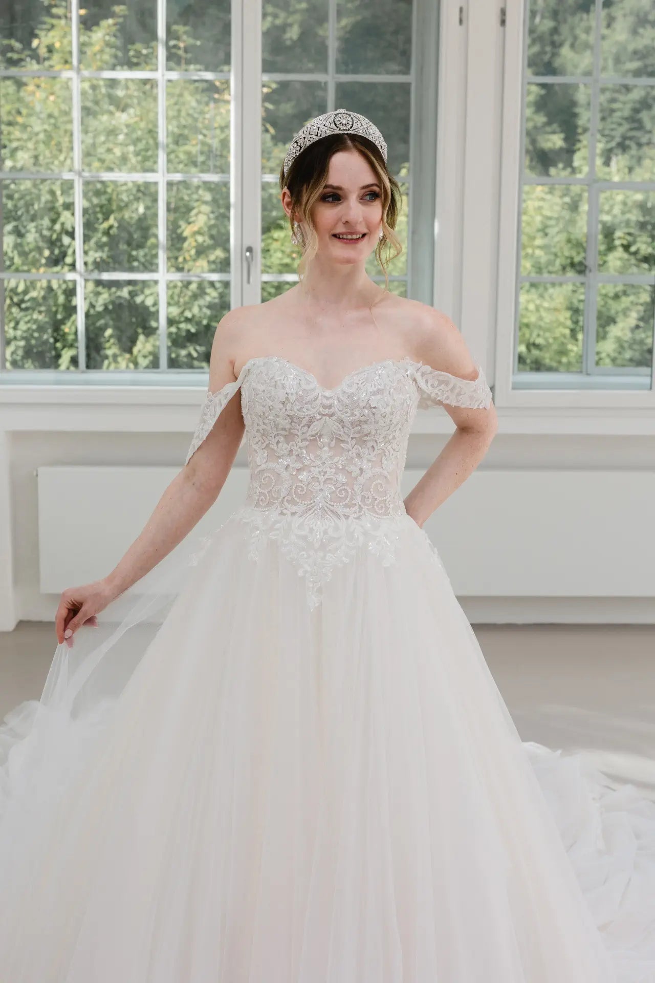 Hallo Aschenputtel, dieses Brautkleid wird dich verzaubern! Buche jetzt einen Beratungstermin bei einem Bridonista-Fachhändler und sage "Ja" zu deinem Traum-Hochzeitskleid. C23-08 ist die perfekte Balance aus klassischen und modernen Elementen der Brautmode und spiegelt die Essenz der Bridonista Classic Collection wider. Der klassische Herzchen-Ausschnitt wird von Trägern umrahmt, die über die Schultern hängen und eine romantische, feminine Silhouette lenken. Die Träger sind abnehmbar, so dass du deinen Brautlook mit wenigen Handgriffen verändern kannst. Die florale Spitze ergänzt die romantische Stimmung und verläuft organisch über die Corsage in den Rock. Einzelne Spitzenornamente sind von Hand mit Pailletten und Kristallen bestickt und verleihen einen dezenten Prinzessinnen-Touch. Das Markenzeichen dieser Kollektion sind die modernen Einflüsse des Lingerie-Looks. So ist die Corsage halbtransparent geschnitten und unterstreicht die Schönheit und Weiblichkeit der Frau. Für den perfekten Sitz verfügt dieses Bridonista-Design außerdem über eine starke Corsage und Push-up-Cups, damit du dich an deinem großen Tag selbstbewusst und wunderschön fühlen kannst. Der Tüllrock ist schlicht gehalten mit einer langen Schleppe (ca. 105 cm) für einen atemberaubenden Prinzessinnenmoment.